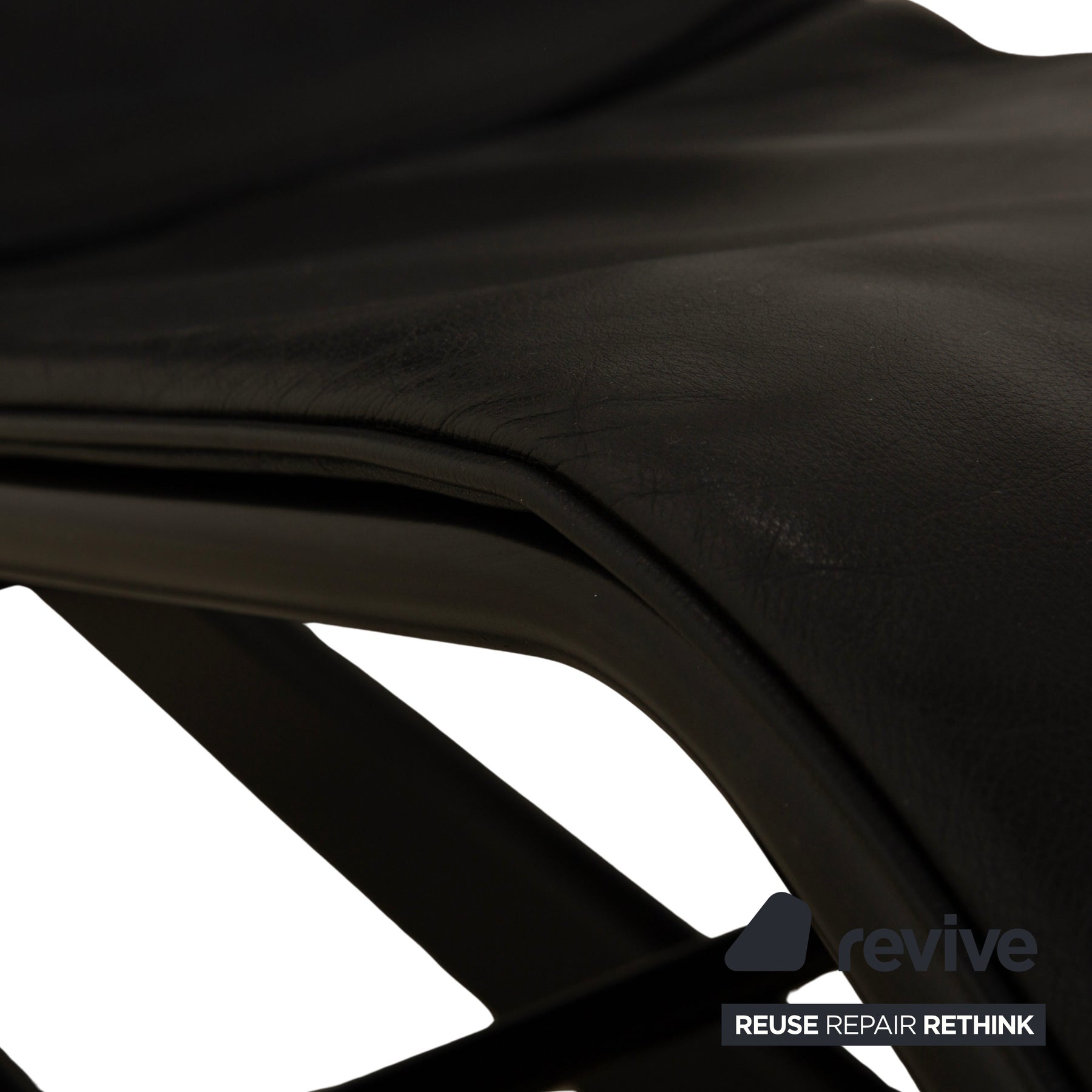 Eine elegante Relaxliege mit geschwungener Form auf stabilem Metallgestell. Der Bezug aus schwarzem Leder unterstreicht die moderne, minimalistische Ästhetik. Ein zylindrisches Nackenkissen sorgt für zusätzlichen Komfort. Ideal für stilvolles Entspannen in Wohn- oder Loungebereichen.