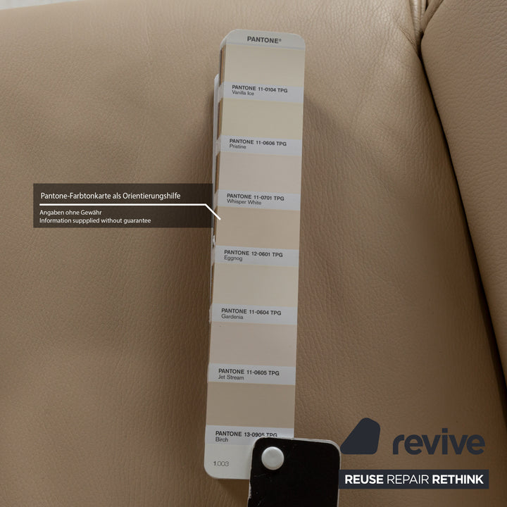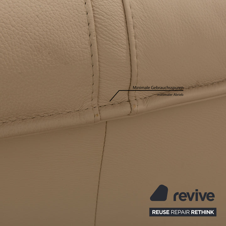Der Zweisitzer von Elastoform ist mit einem cremefarbenen Echtleder bezogen und kommt in einem klassischen Design daher. Die leichten Rundungen und die hohe Rückenlehne zeichnen dieses Sofa aus.