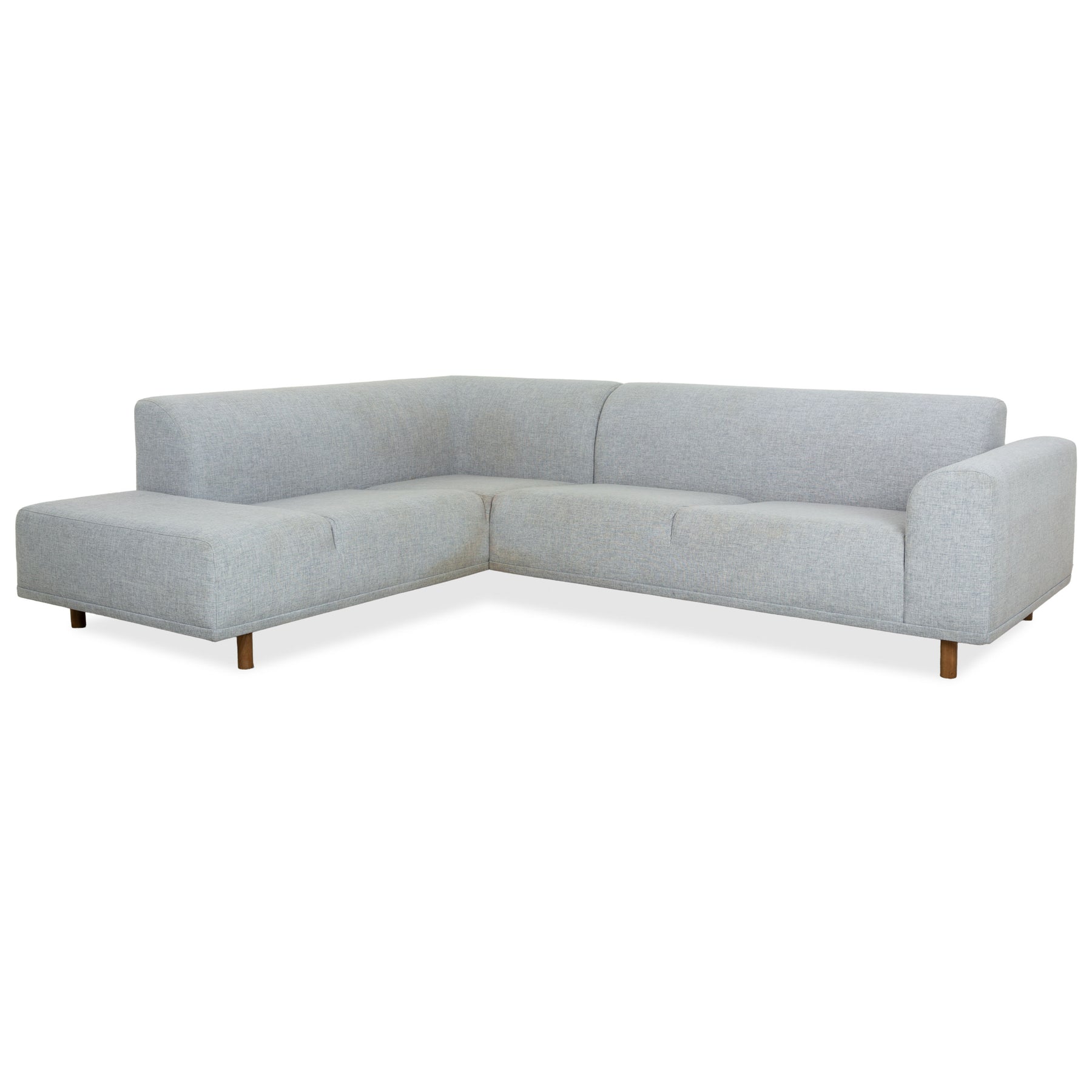 Dieses Ecksofa von Bolia ist mit einem Hellgrau-blauem Stoff bezogen und steht auf brauen Holzfüßen. Es zeichnet sich durch das helle, harmonische Design und die skandinavische Optik aus.