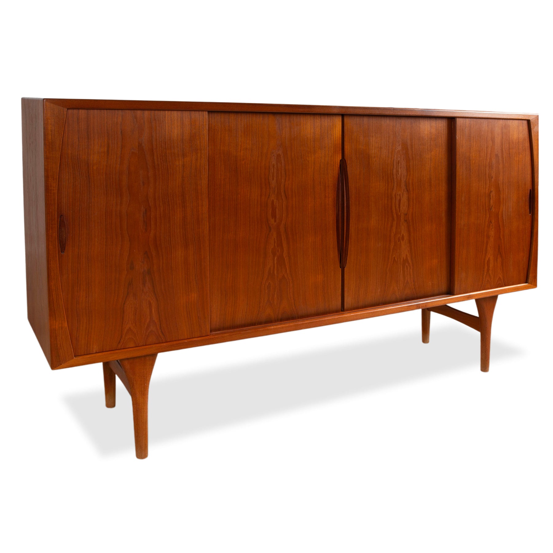 Hier holst du dir mit dem Sideboard von Bruno Hansen ein echtes Stück dänische Designgeschichte nach Hause, das den Vintage-Charakter der Mid-Century-Ära perfekt verkörpert. Das Möbel besticht durch die markante Maserung des Teakholzes, die dem Raum sofort eine warme und wohnliche Atmosphäre verleiht. Uns fasziniert besonders die handwerkliche Qualität aus Dänemark, die sich besonders in den organisch geformten Griffen und den filigranen, ausgestellten Beinen zeigt.