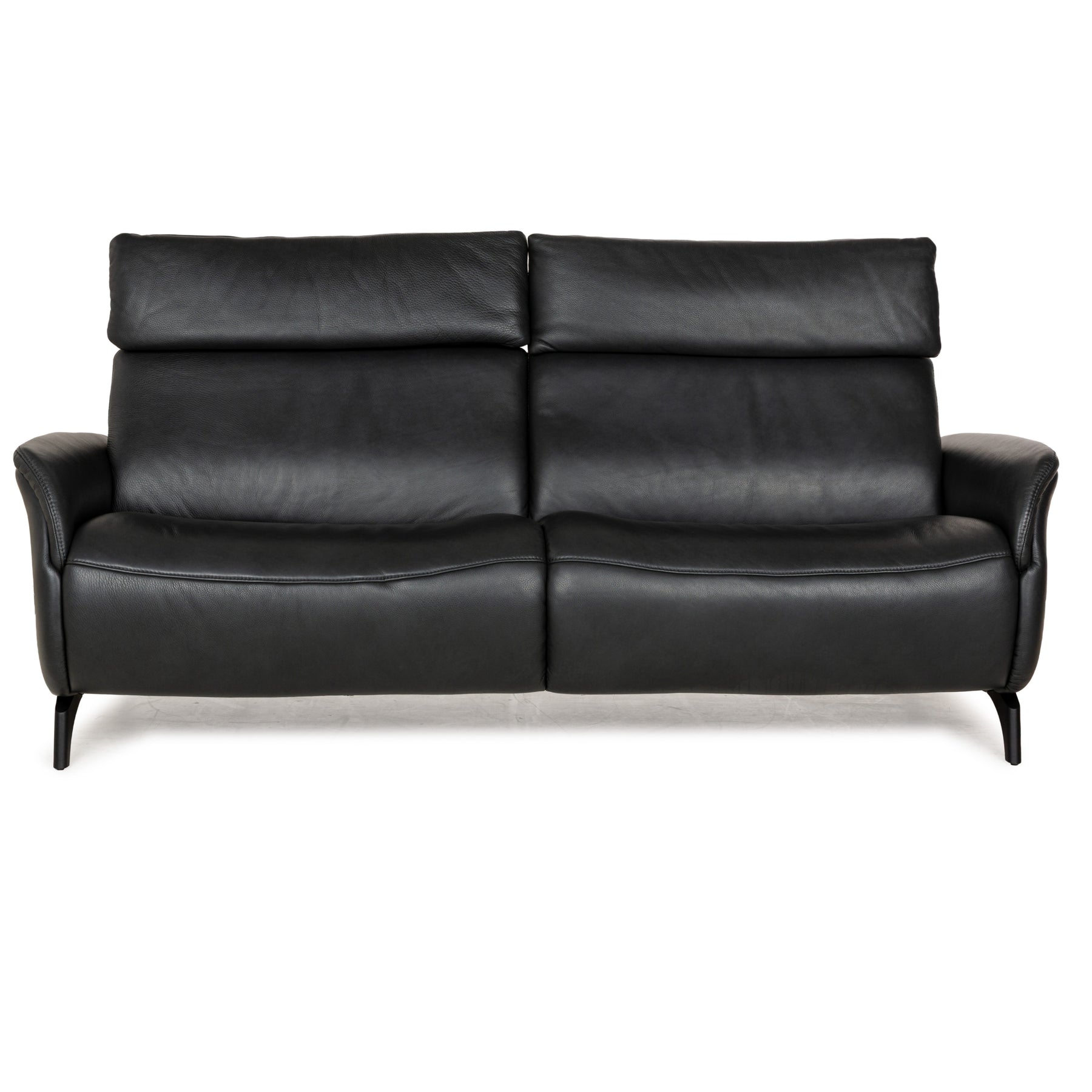 Das Sofa Cumuly von Himolla ist mit grauem Leder bezogen und steht auf eleganten Metallelementen in Schwarz. Der Zweisitzer zeichnet sich durch sein modernes, auf Komfort bedachtes Design aus und verfügt über in der Höhe verstellbare Kopfstützen.