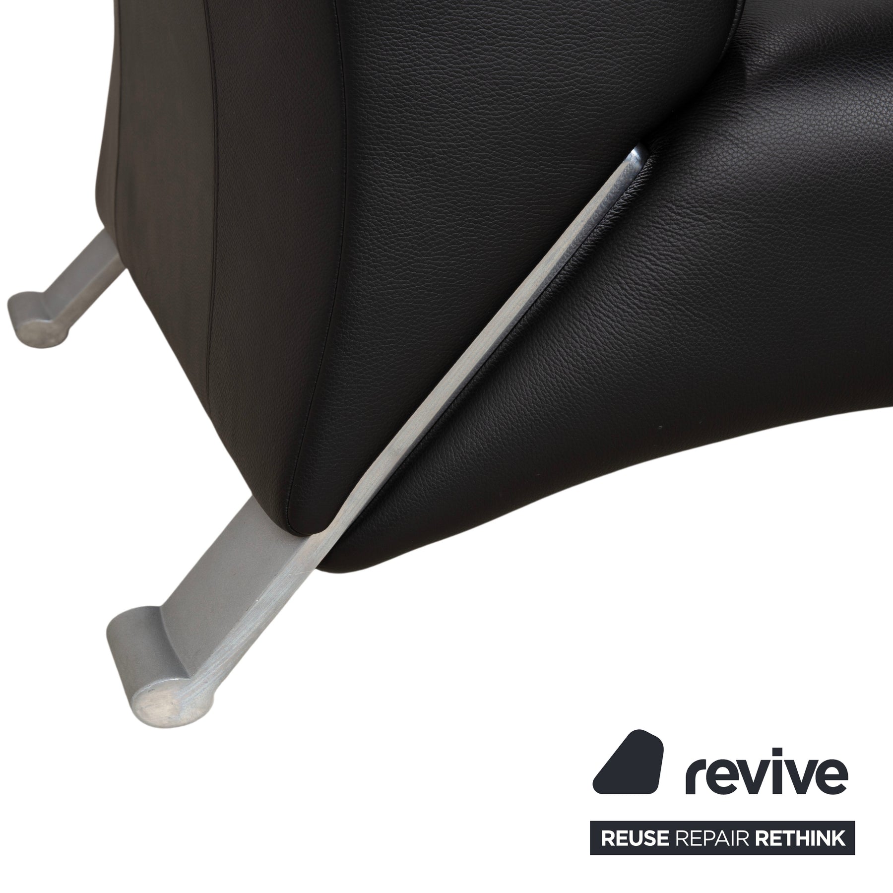 Das Besondere an diesem Entwurf von Anita Schmidt ist die dynamische, nach außen gewölbte Form. Die Armlehnen scheinen förmlich nach oben und außen zu streben, was dem Zweisitzer eine einladende und dennoch extrem kompakte Präsenz verleiht. Ein absolutes Highlight sind die diagonal angeordneten Aluminium-Gussfüße, die an den Ecken bündig in den Korpus übergehen und dem Sofa seine charakteristische Standfestigkeit und moderne Leichtigkeit verleihen.