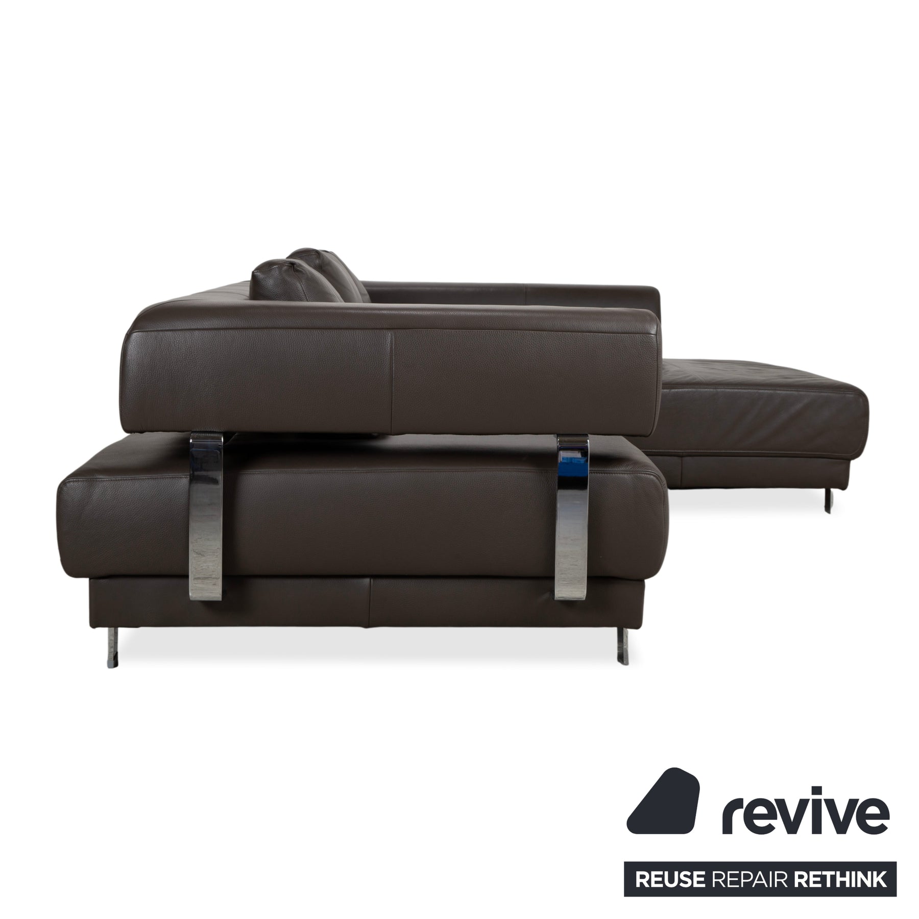 • Die Basis: Das Sofa ruht auf eckigen Metallfüßen in Chrom-Optik, die für einen stabilen, aber eleganten Stand sorgen.