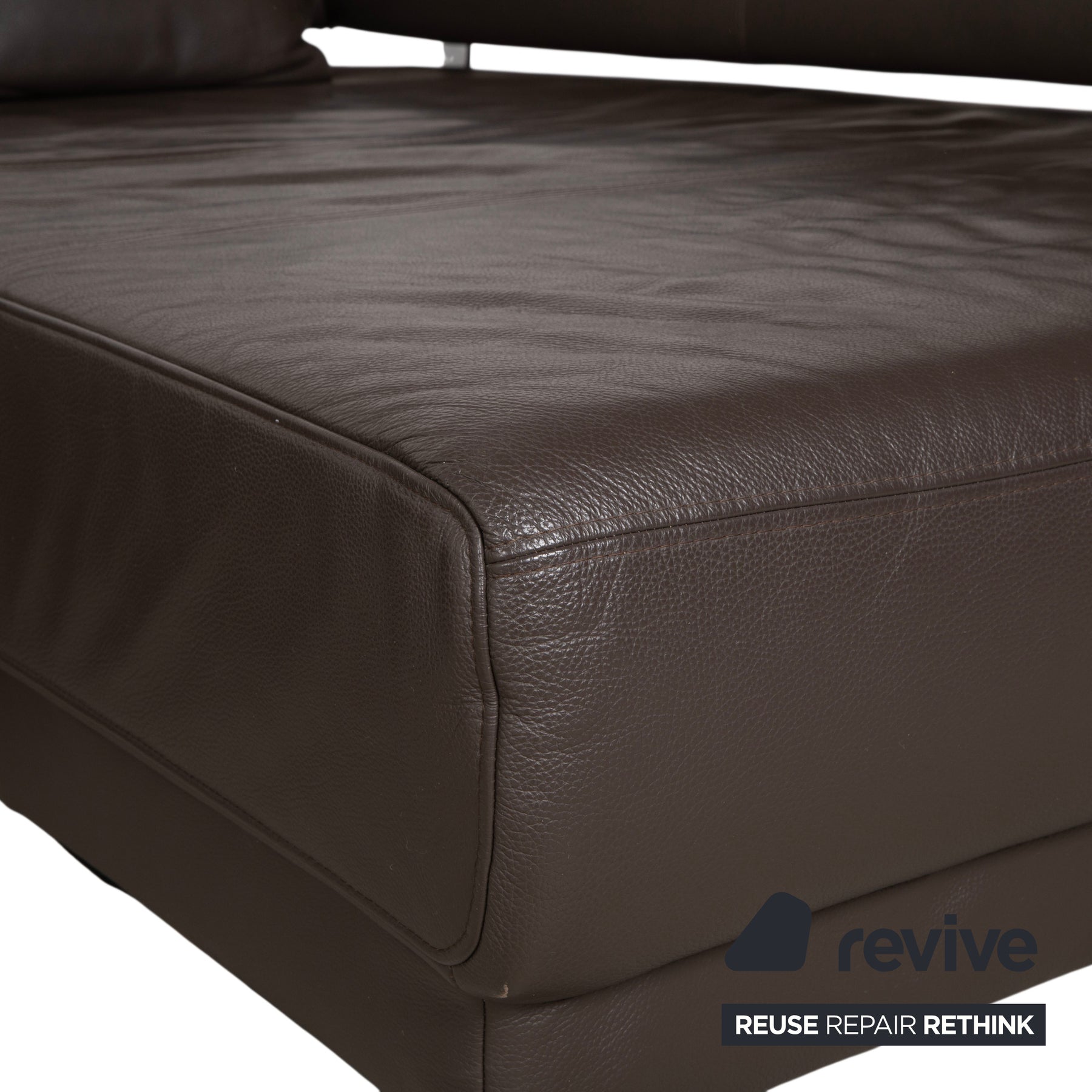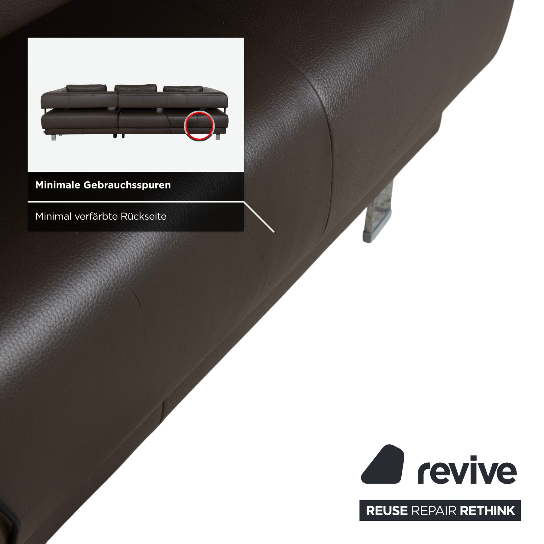 Das Sofa ist in hochwertiges Leder in einem tiefen Dunkelbraun gehüllt. Die glatte Oberfläche wirkt sehr edel und unterstreicht die geradlinige Form. Das Design besticht durch spannende Kontraste: