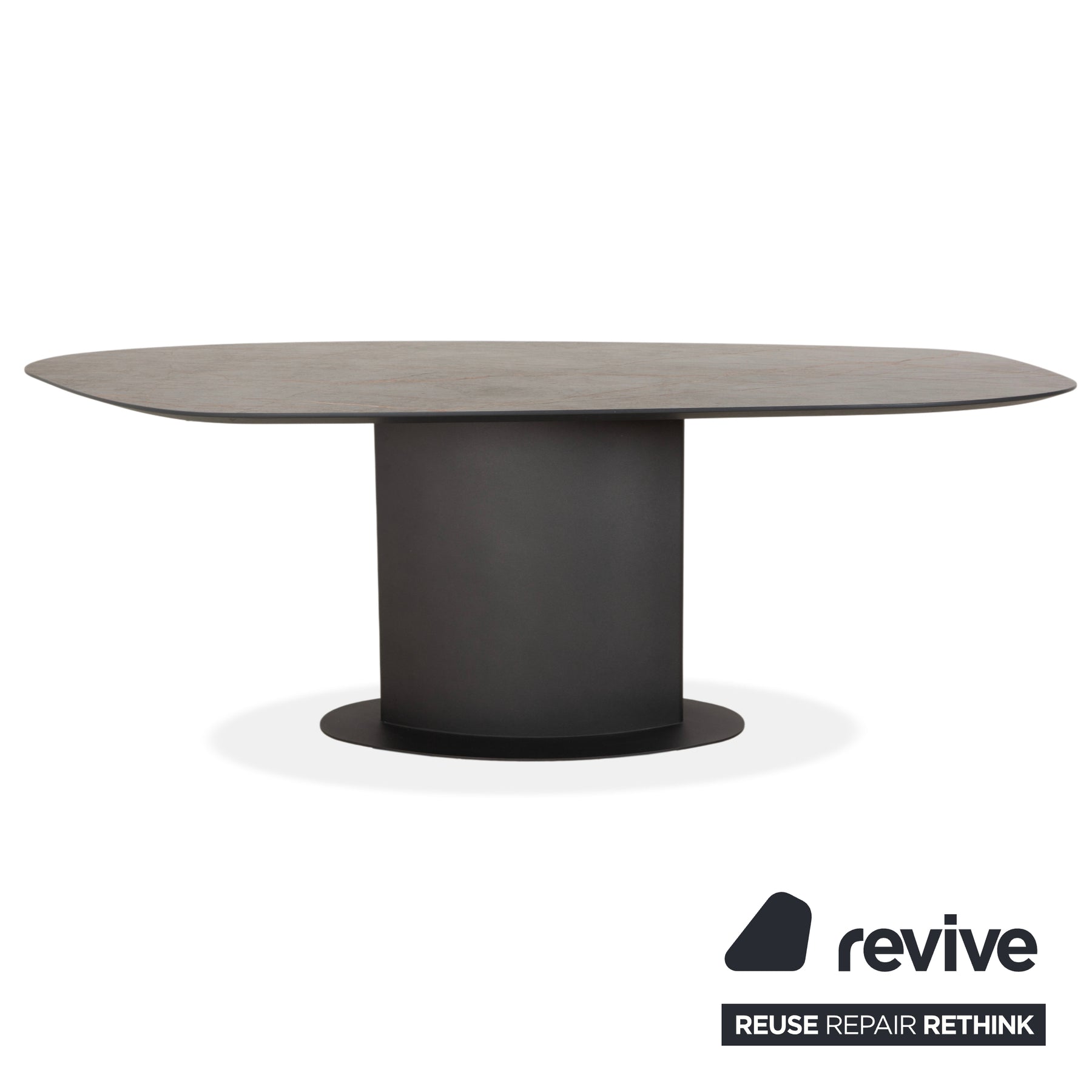 Getragen wird die schlanke Platte von einem massiven, zentralen Metallsockel (Säulenfuß), der farblich perfekt auf die Platte abgestimmt ist. Diese Konstruktion sieht nicht nur skulptural aus, sondern bietet auch maximalen Komfort: Keine störenden Tischbeine an den Ecken bedeuten volle Beinfreiheit für alle.