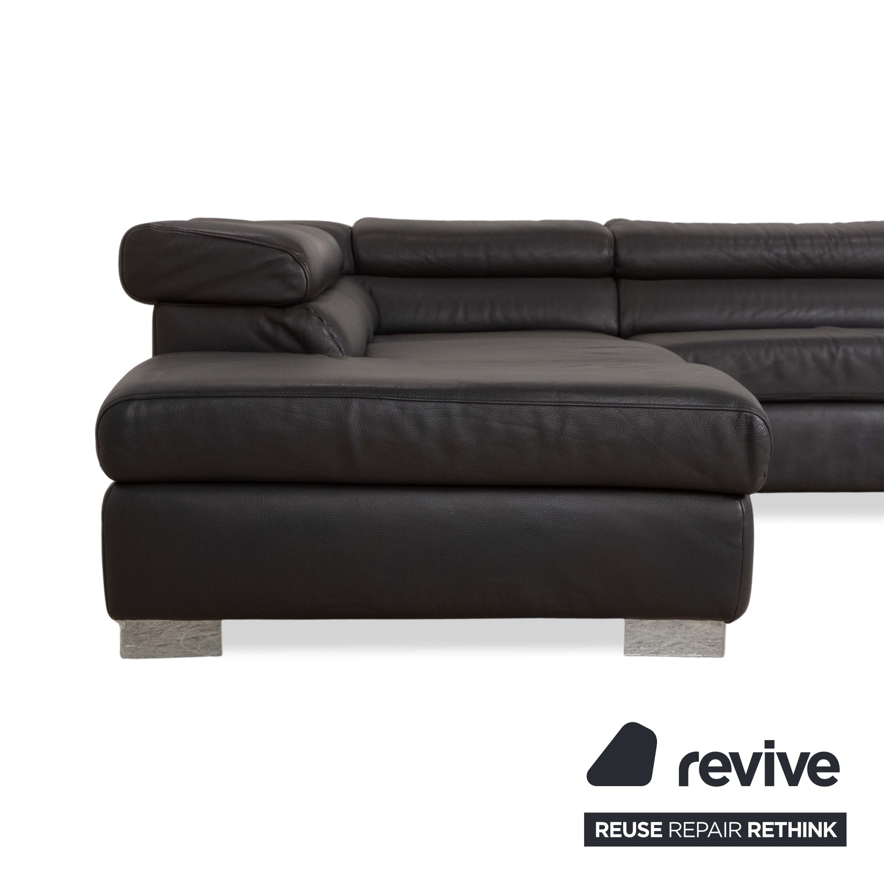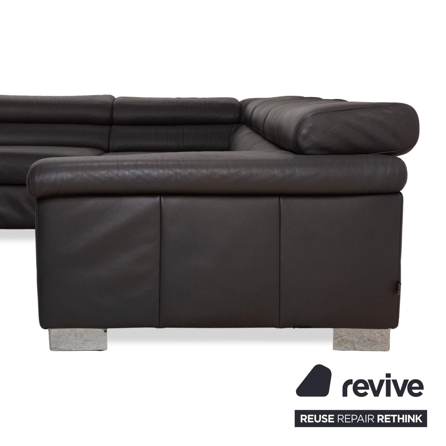 Das Ecksofa Courage von Ewald Schillig ist mit einem dunkelgrauen Echtleder bezogen und steht auf rechteckigen, silbernen Metallfüßen. Es zeichnet sich durch die geräumige Sitzfläche und die klappbaren Kopfstützen. Das gradlinige, zeitlose Design findet in jedem Raum einen Platz und lädt zum verweilen ein.