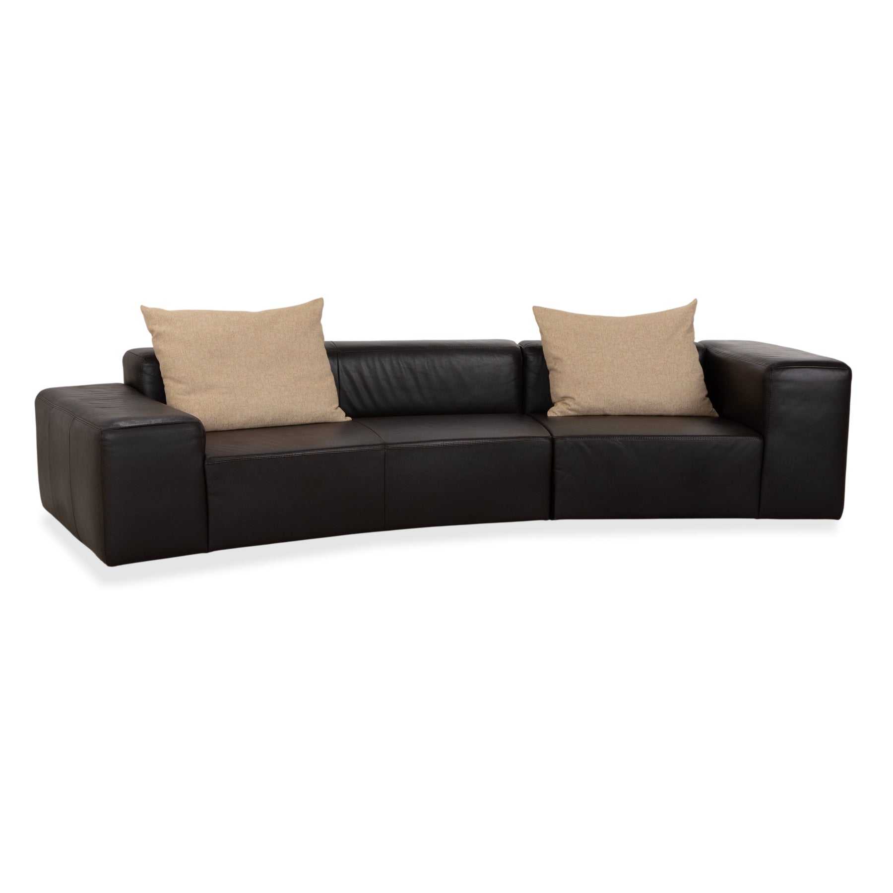 Das Sofa ist in hochwertiges, glattes Leder in einem tiefen Dunkelbraun (fast Espresso oder Mokka) gehüllt. Dieser Farbton wirkt warm, maskulin und absolut zeitlos, wobei das Leder eine edle, matte Oberfläche zeigt. Das absolute Design-Highlight ist die sanft geschwungene Form (eine leichte Nieren- oder Bananenform). Diese Krümmung nimmt dem großen Viersitzer die Wucht und sorgt für eine kommunikative Sitzposition, da man sich leicht zugewandt sitzt.