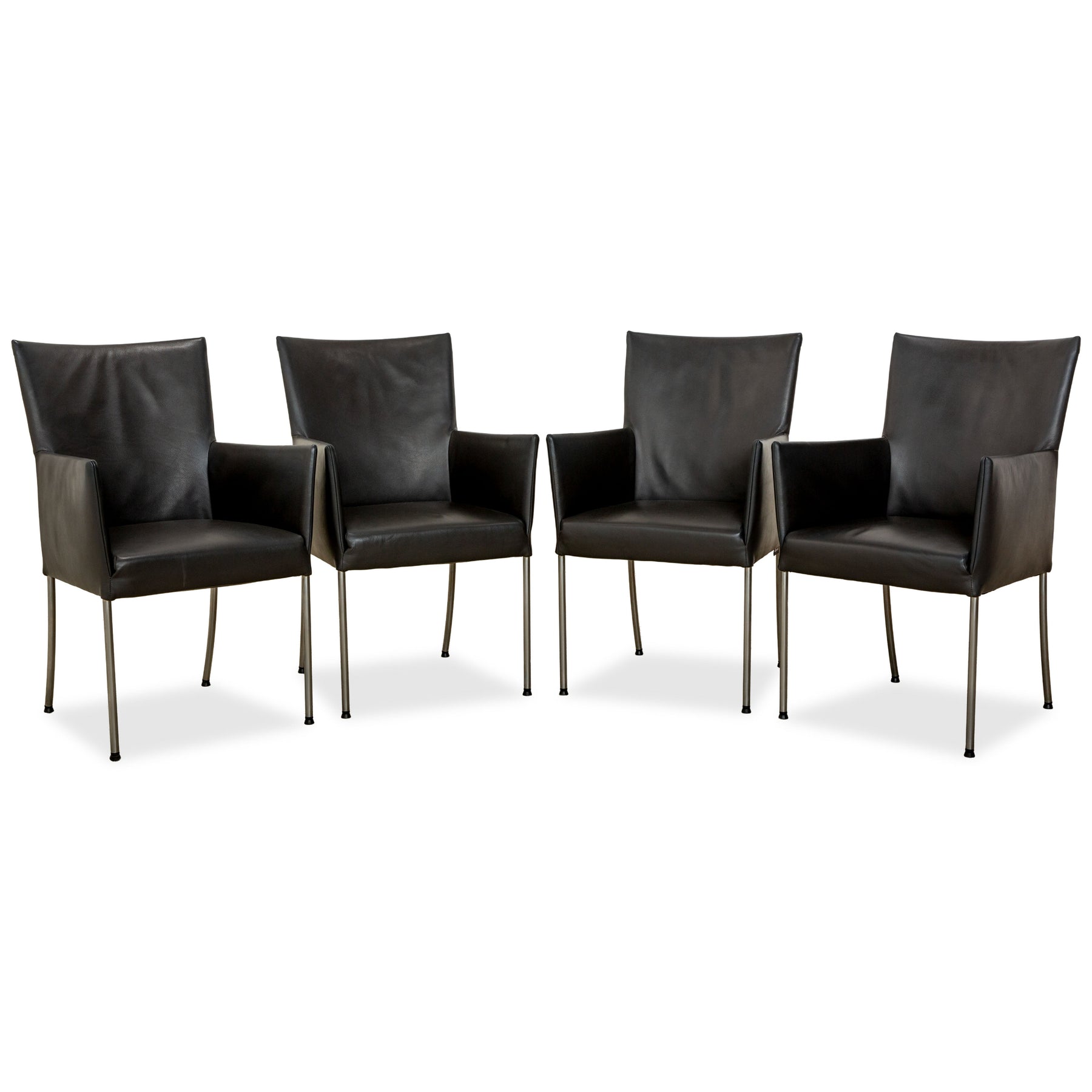 Diese Stuhl-Garnitur von bert plantagie bestehend aus vier baugleichen ARC-E Exemplaren. Die Garnitur ist eine elegante Ergänzung für das moderne Wohn- und Esszimmer. Die Stühle sind mit einem anthrazitfarbenen Echtleder bezogen und zeichnen sich durch ihr reduziertes, geradliniges Design aus.