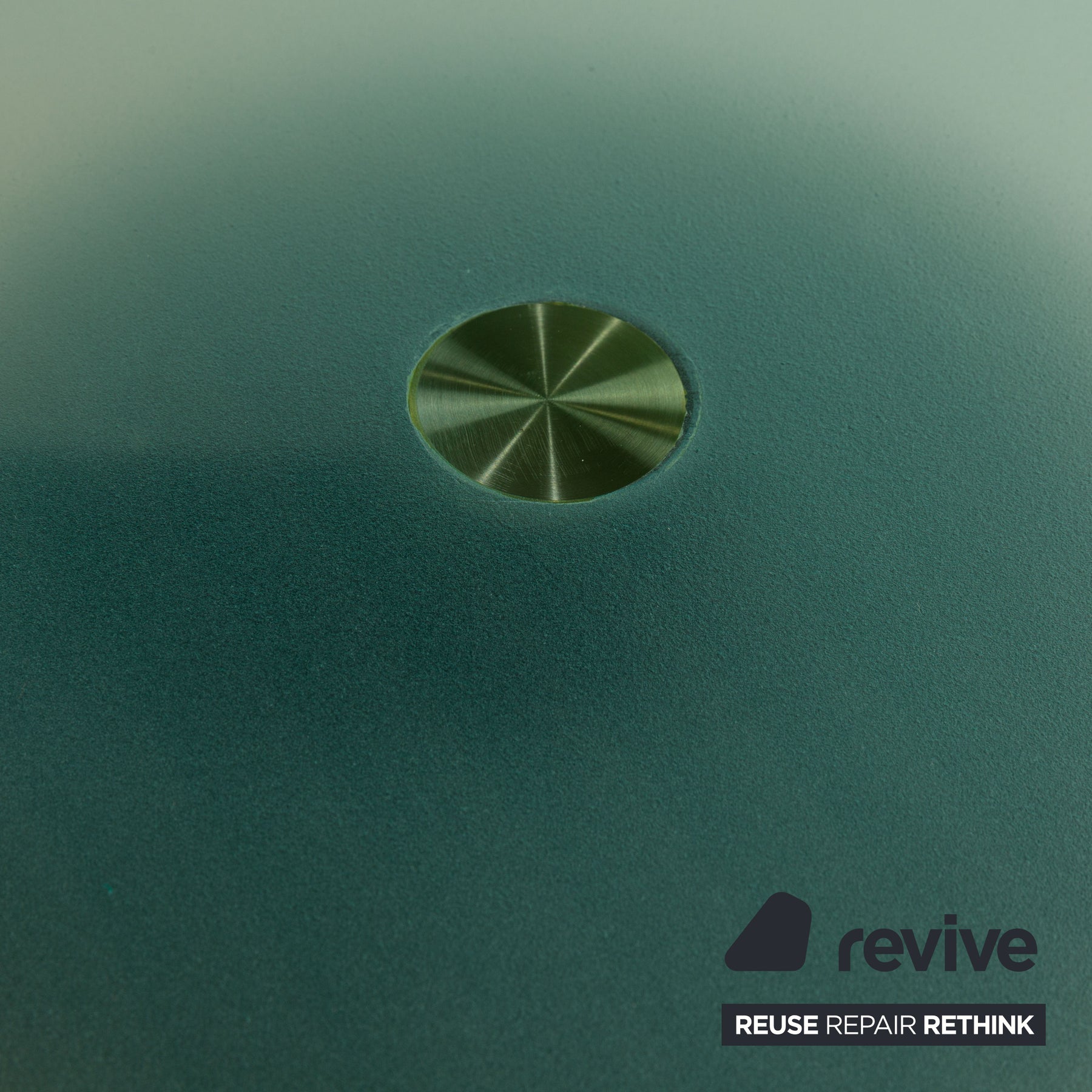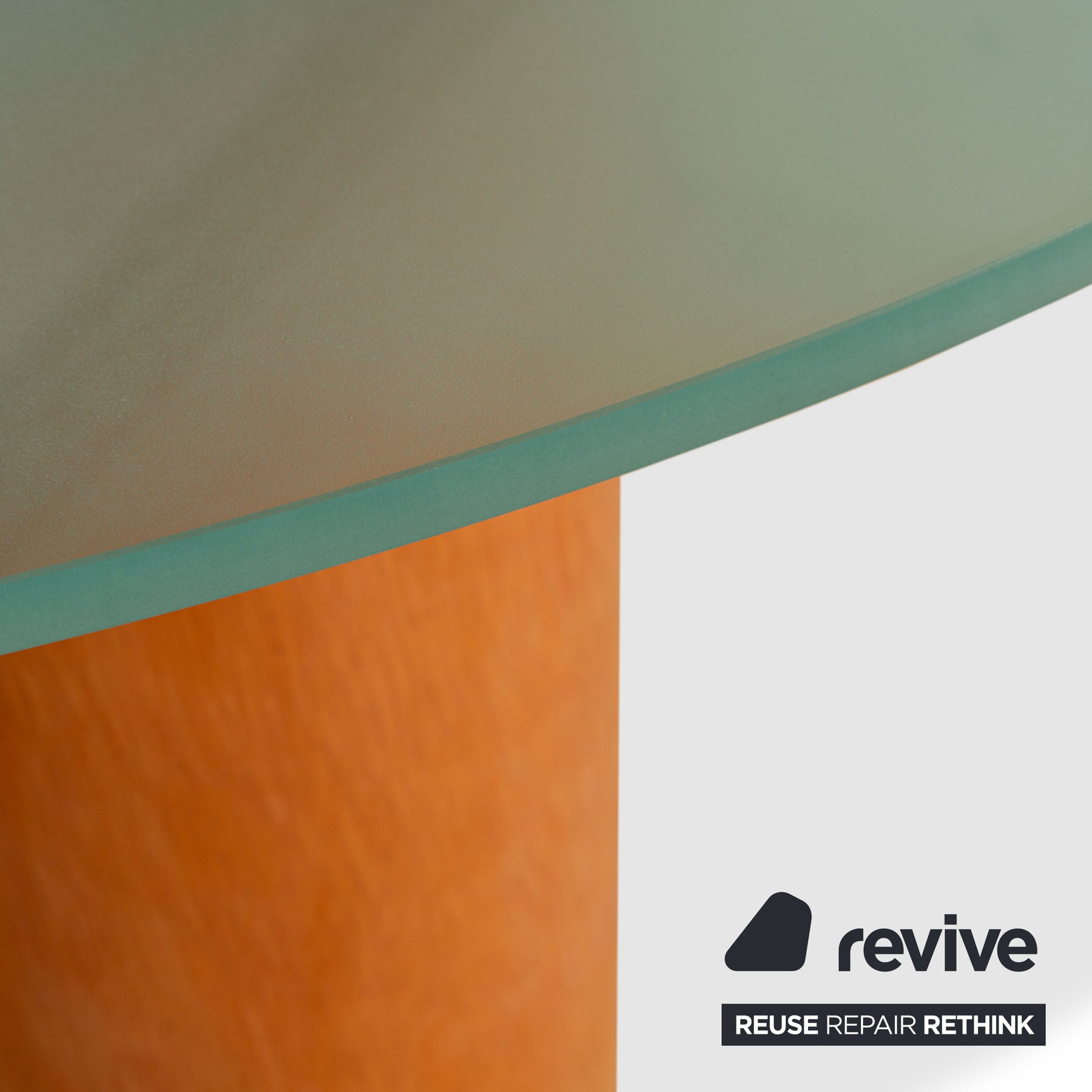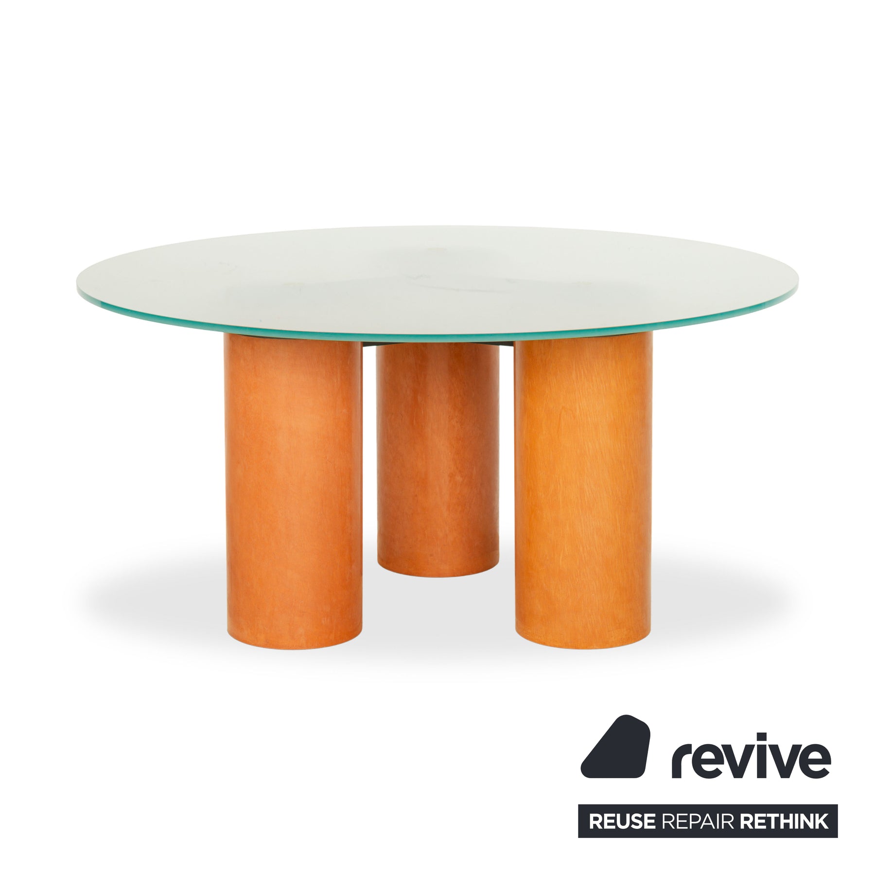 Der Tisch Serenissimo von Acerbis besteht aus einer runden Glasplatte und steht auf drei Füßen aus Holz. Er zeichnet sich durch die moderne, stilvolle Optik und das schlichte Design aus.