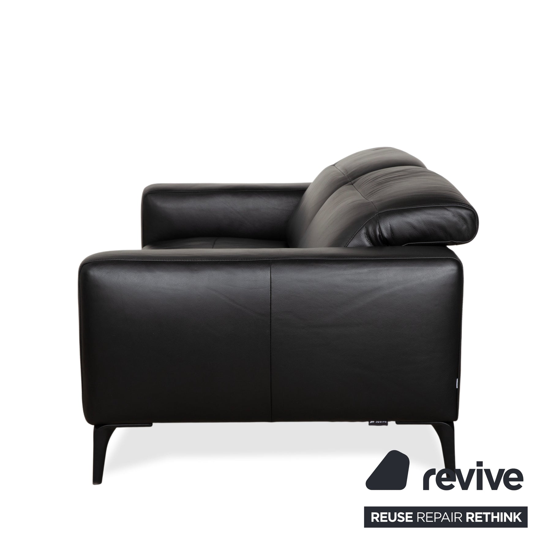 Der Zweisitzer ist in hochwertiges, schwarzes Leder gehüllt. Die Oberfläche ist glatt und straff, was dem Sofa eine sehr cleane, aufgeräumte Ausstrahlung verleiht und die klare Linienführung betont. Getragen wird der Polsterkörper von schlanken, schwarzen Metallfüßen. Diese sind filigran gestaltet und heben das Sofa optisch weit vom Boden ab, was den typischen „schwebenden“ Skandi-Look erzeugt.