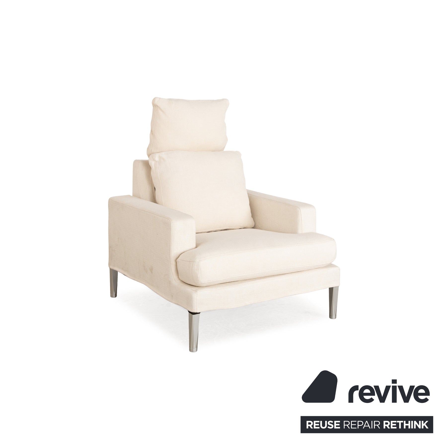 Der Clarus Sessel von FSM ist mit einem cremefarbenen Stoff bezogen und steht auf silbernen Metallfüßen. Er überzeugt mit seinem zeitlosen Design und der helle, stilvolle Optik.