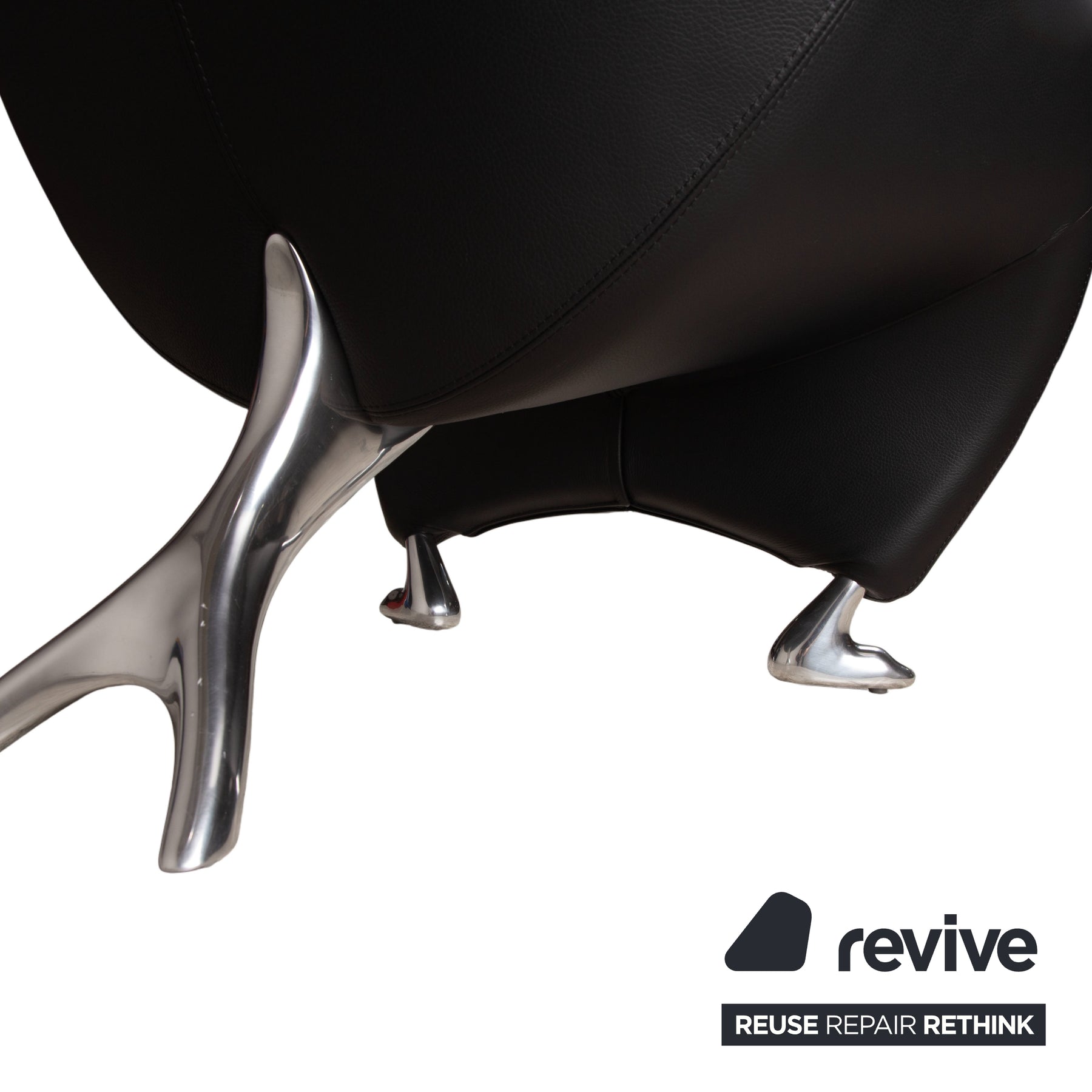 Getragen wird dieser Charakterkopf von polierten Aluminiumfüßen. Diese sind ebenfalls organisch geformt (vorne wie kleine Tatzen oder Krallen, hinten stützend), was den eigenwilligen Look unterstreicht und einen glänzenden Kontrast zum dunklen Leder bildet. Trotz der kompakten Maße bietet der Papageno durch seine leicht geneigte Rückenlehne und die tiefe Sitzmulde einen überraschend hohen Komfort.