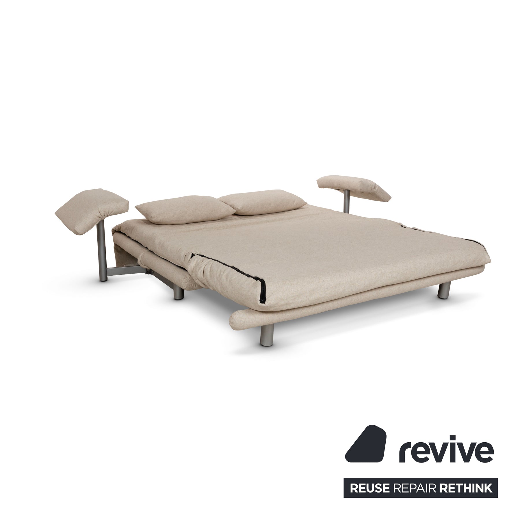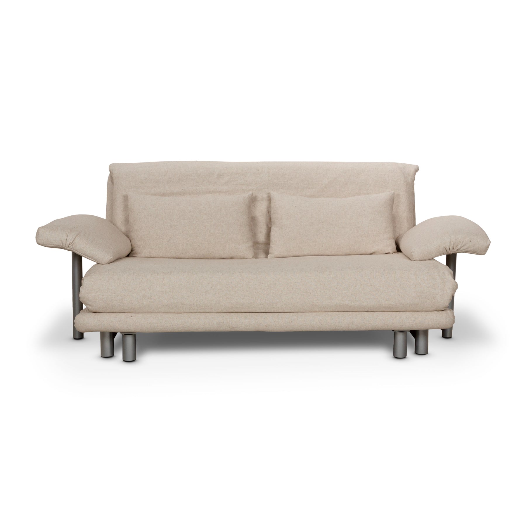 Das Multy Sofa von Ligne Roset ist mit einem beigefarbenen (LINEN 502) Stoff neu bezogen und steht auf runden Metallfüßen. Das minimalistische Design und die komfortable Schlaffunktion zeichnen den Dreisitzer aus, der sich mit nur wenigen Handgriffen in ein Schlafsofa verwandeln lässt.