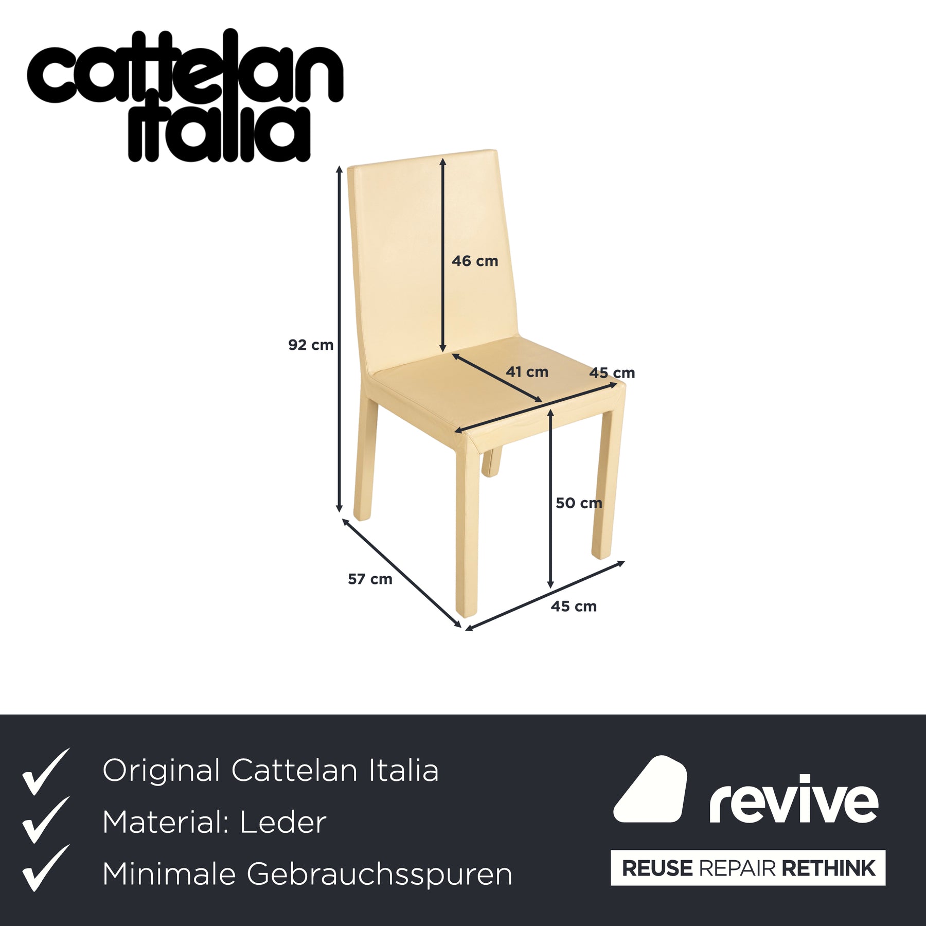 Die Garnitur besteht aus vier Stühlen von Cattelan Italia. Der Bezug aus echtem Leder in Creme-Elfenbein verleiht den Stühlen eine elegante Ausstrahlung und macht sie zugleich pflegeleicht und langlebig. Sitzfläche, Rückenlehne und Beine sind komplett mit Leder bezogen, was die klare Formensprache unterstreicht.
