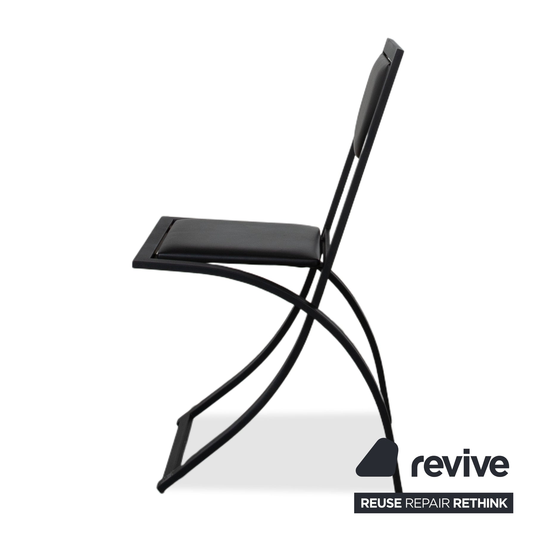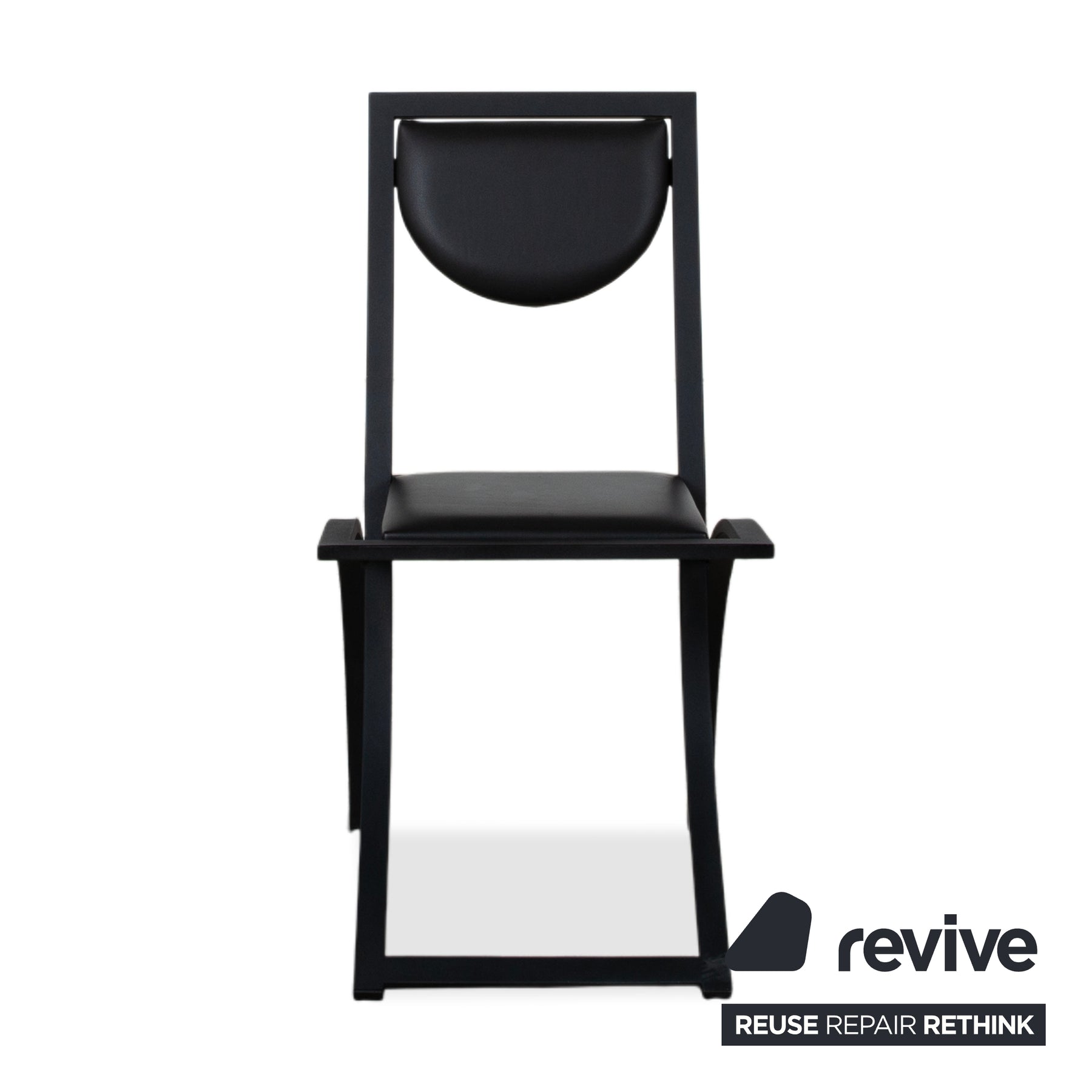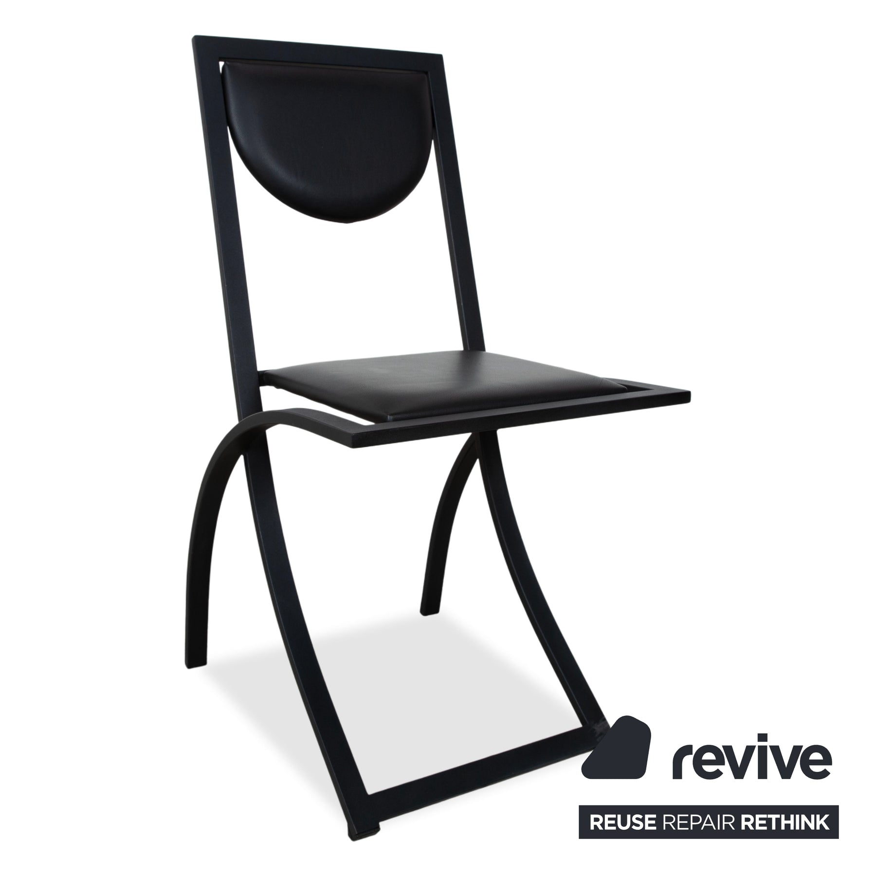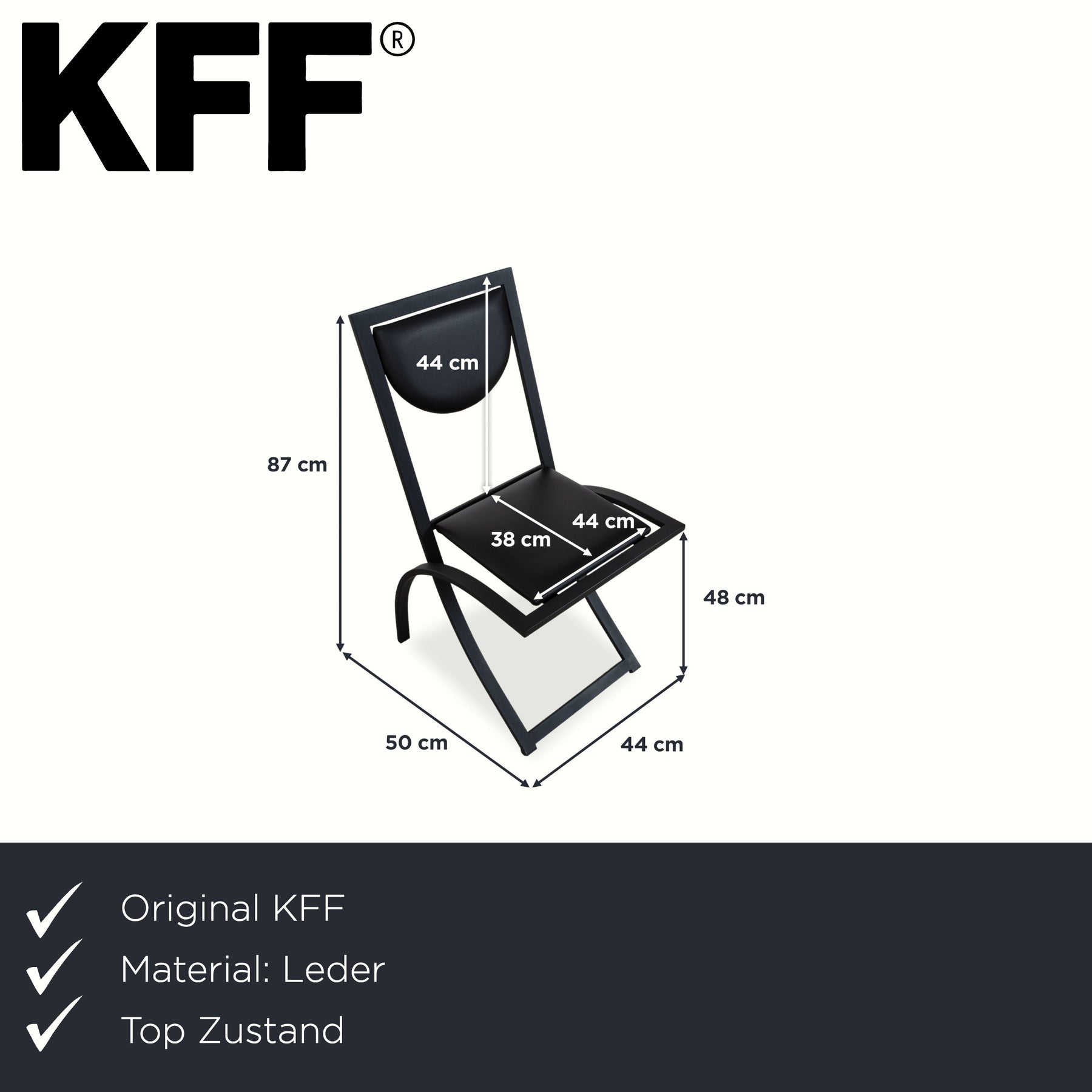 Hier holst du dir mit dieser 6er Garnitur KFF Cosinus ein exzellentes Beispiel für deutsches Postmoderne-Design in dein Esszimmer. Die Stühle, entworfen von Karl-Friedrich Förster, bestechen durch ihre markante, grafische Linienführung und die Kombination aus kühlem Metall und hochwertigem schwarzem Leder.