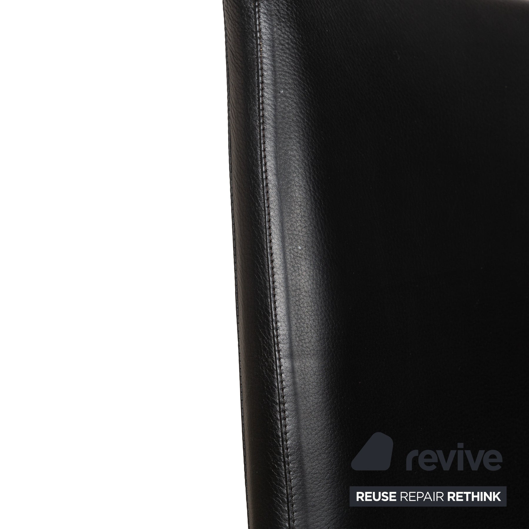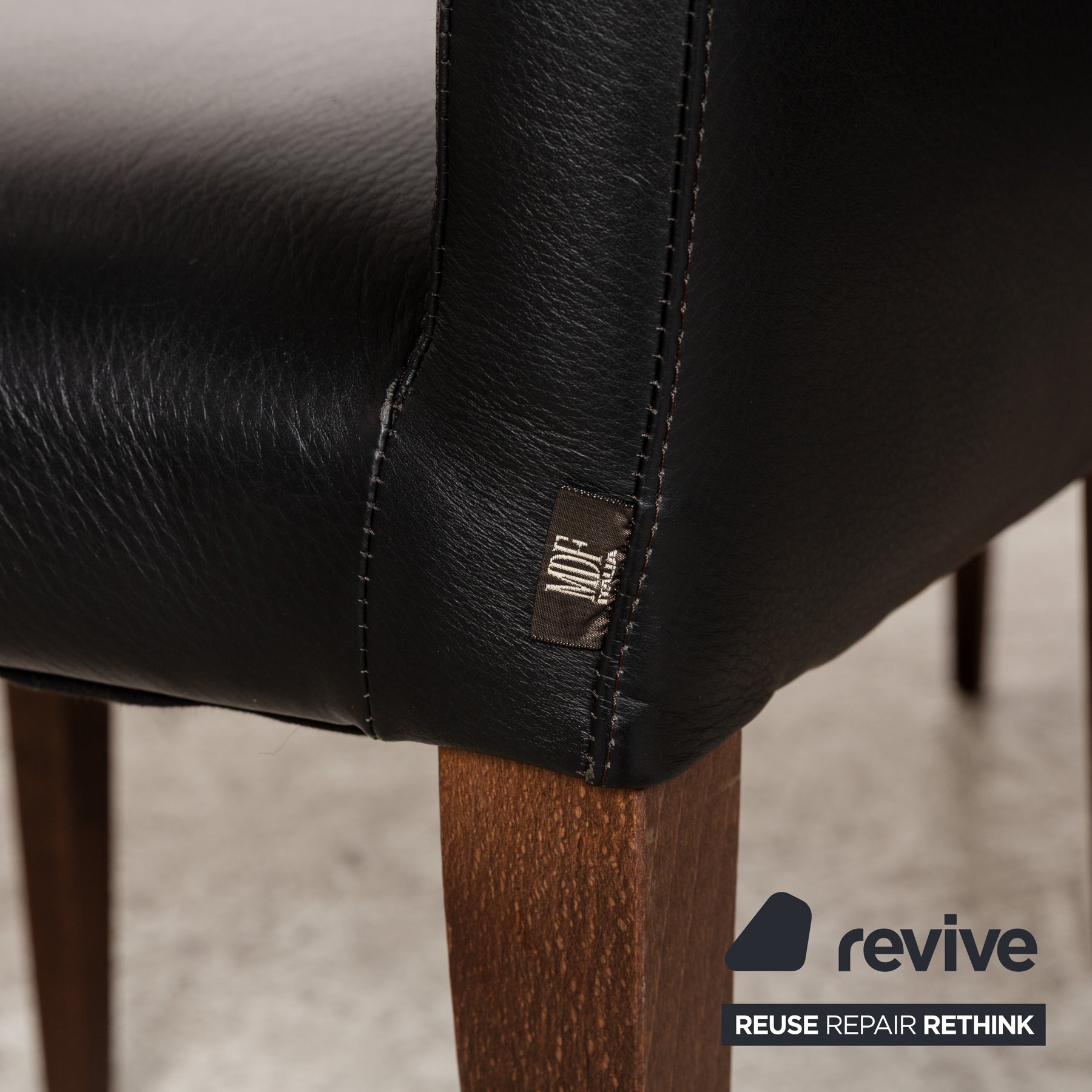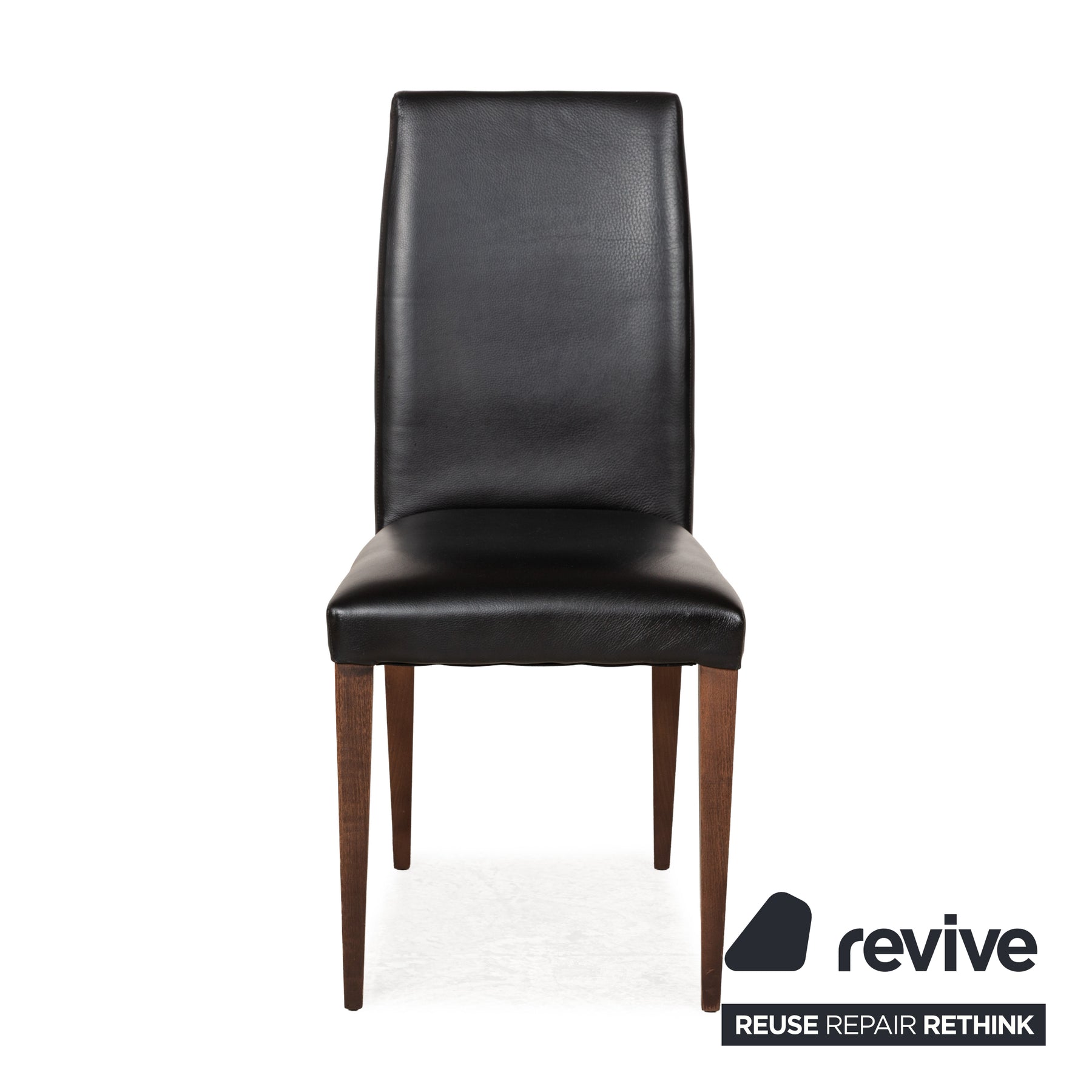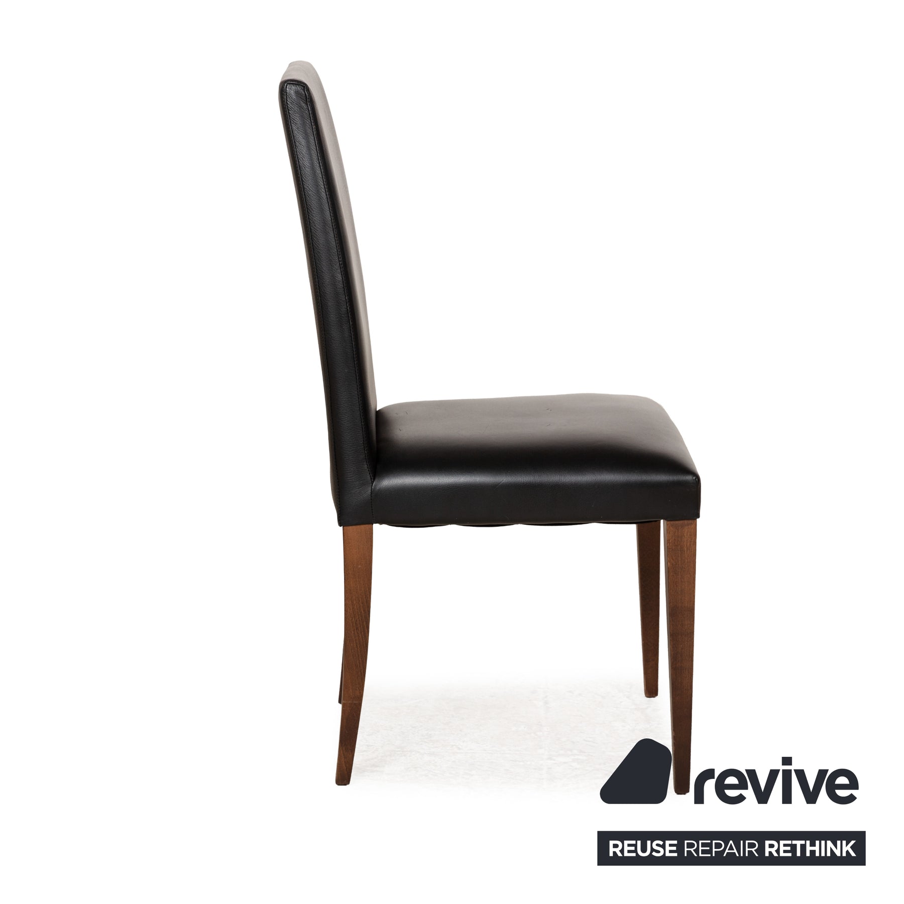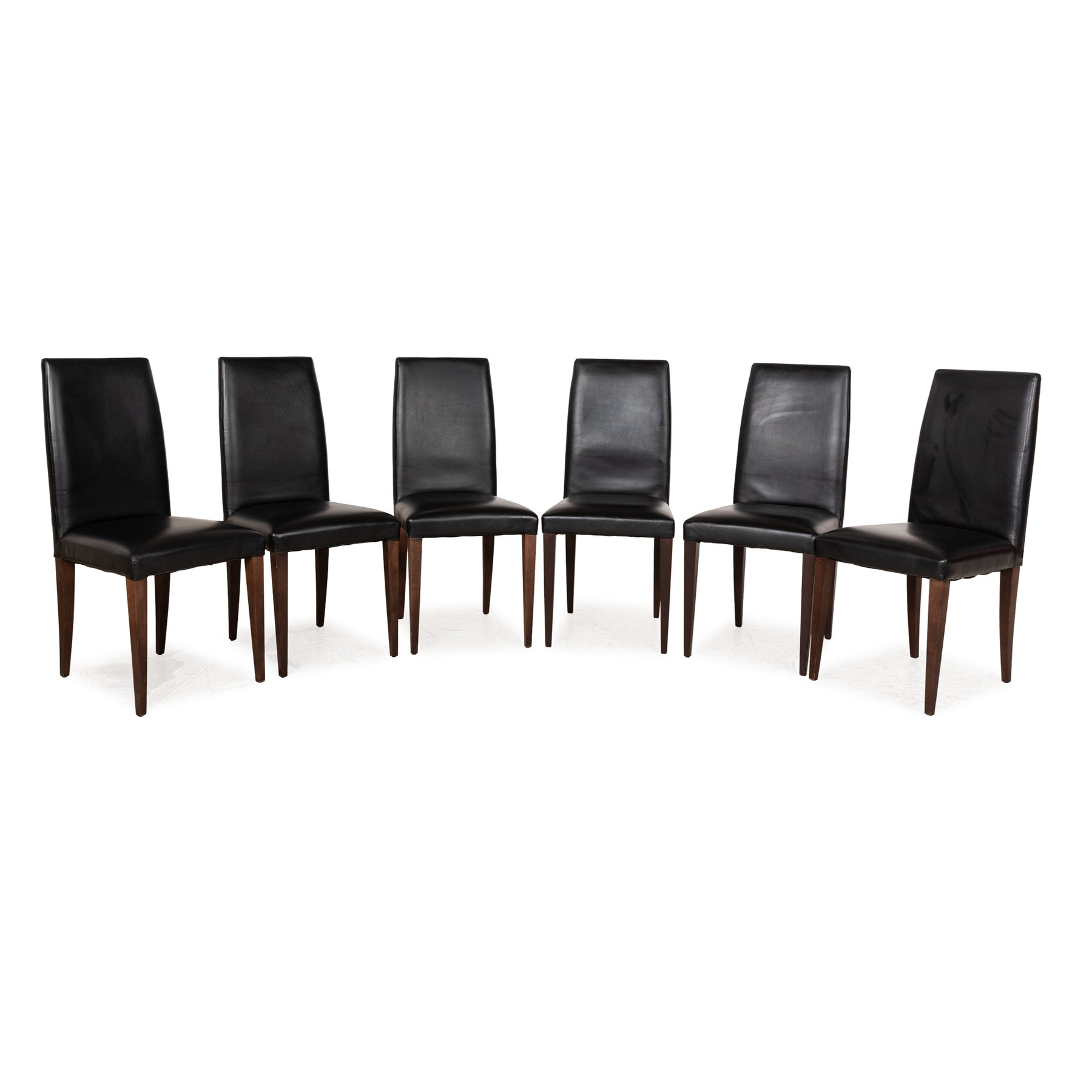 Die Stuhl-Garnitur von MDF Italia, bestehend aus sechs baugleichen Exemplaren, ist mit schwarzem Leder bezogen und steht auf sich leicht verjüngenden Holzbeinen in dunkelbraun. Das Set zeichnet sich durch sein zeitloses Design aus, wodurch es leicht in die bestehende Einrichtung des Esszimmers integrierbar ist.