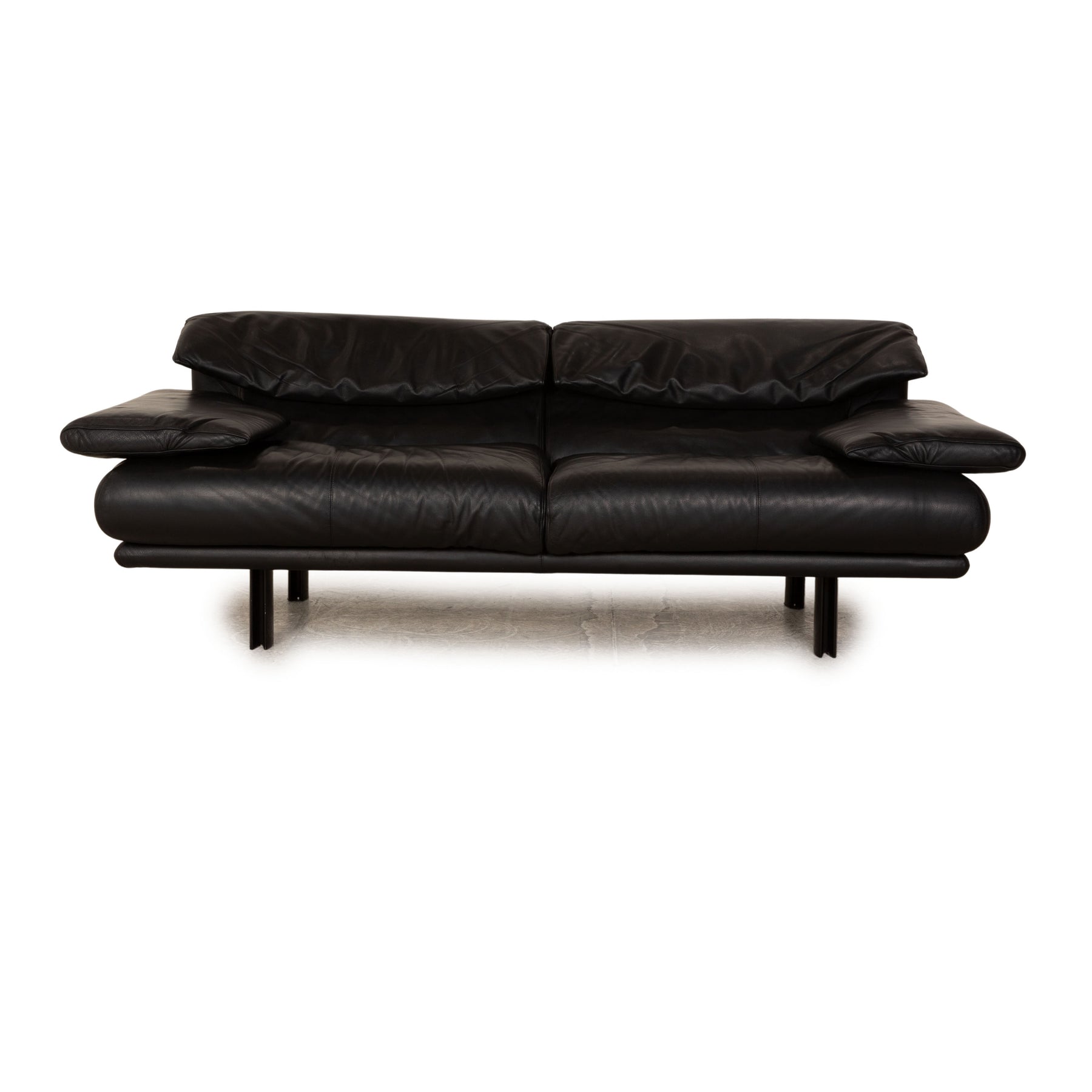 Das Alanda Sofa von B&B Italia ist mit einem schwarzen Echtleder bezogen und steht auf schmalen Füßen. Die verstellbare Rückenlehne und die abgerundeten Kanten zeichnen den Zweisitzer aus.