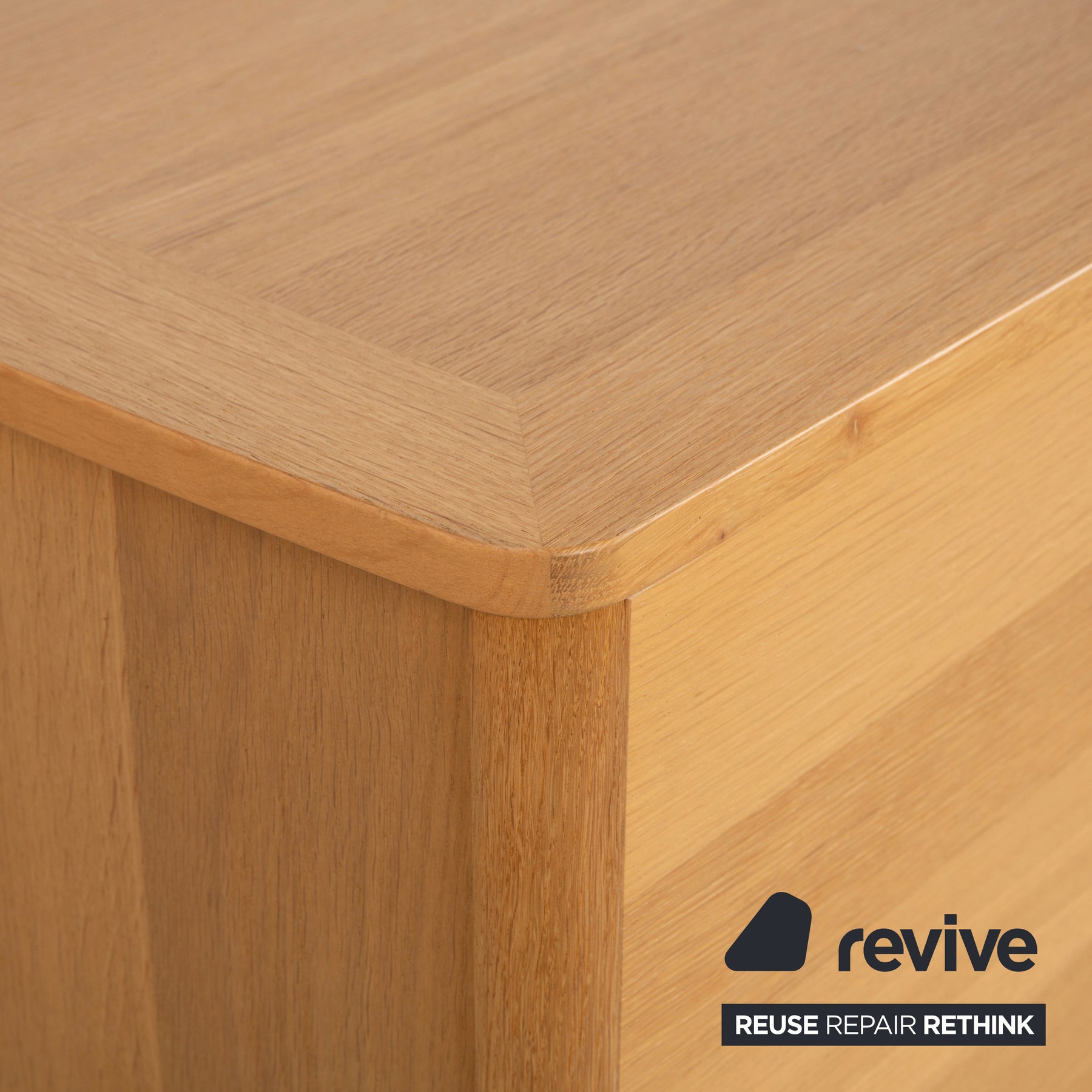 Das Möbelstück ist aus hellem Holz (vermutlich Eiche) gefertigt, dessen natürliche Maserung horizontal über die Fronten verläuft und für eine ruhige, organische Optik sorgt. Besonders schön sind die sanft abgerundeten Ecken des Korpus, die dem massiven Holz die Härte nehmen und sehr harmonisch wirken.