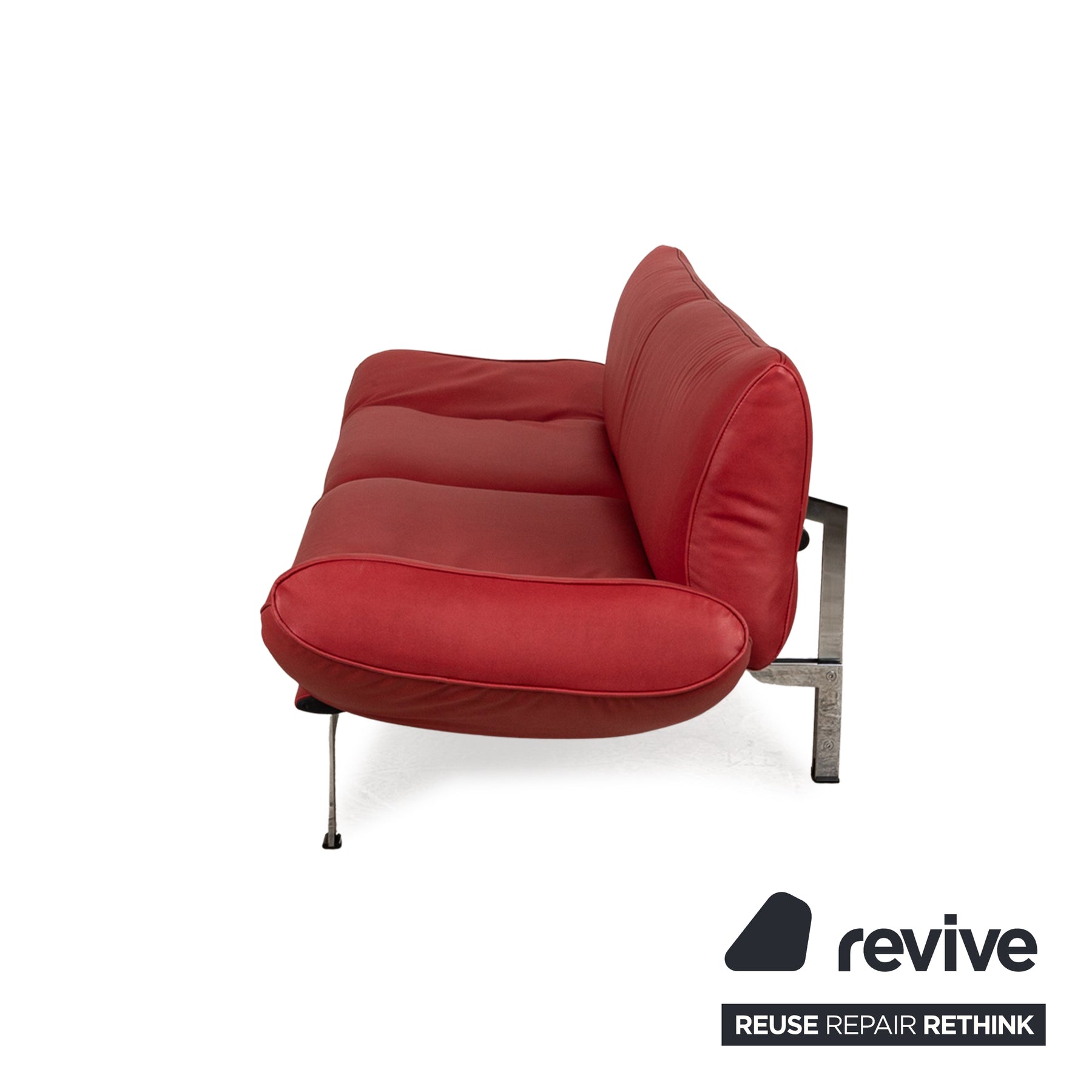 Das ds 140 Sofa von de Sede ist mit einem roten, veganen Leder bezogen und steht auf einem silbernen Metallgestell. Die praktische Relaxfunktion und das klassische Design zeichnen den Zweisitzer aus.