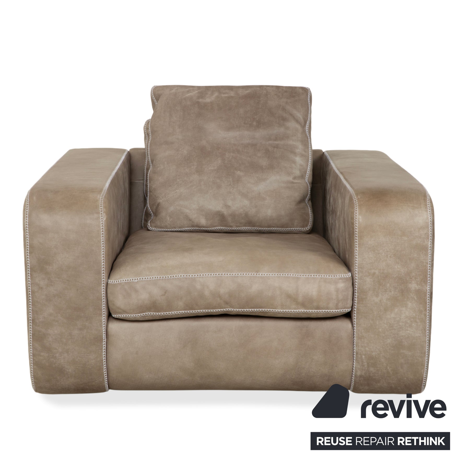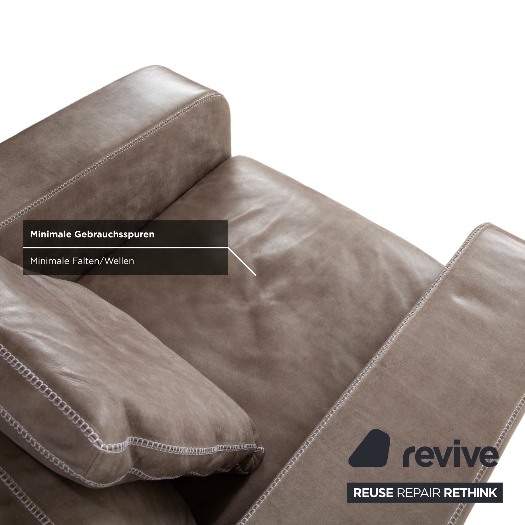 Der Sessel präsentiert sich als kompakter, bodennaher Kubus. Der Bezug aus grauem Leder (oft ein nubukartiges oder sehr weiches Glattleder) hat eine matte, samtige Oberfläche, die Wärme ausstrahlt. Die Form ist geprägt von den extrem breiten Armlehnen, die auf gleicher Höhe wie der Rückenrahmen verlaufen und dem Sessel seine Wucht nehmen.