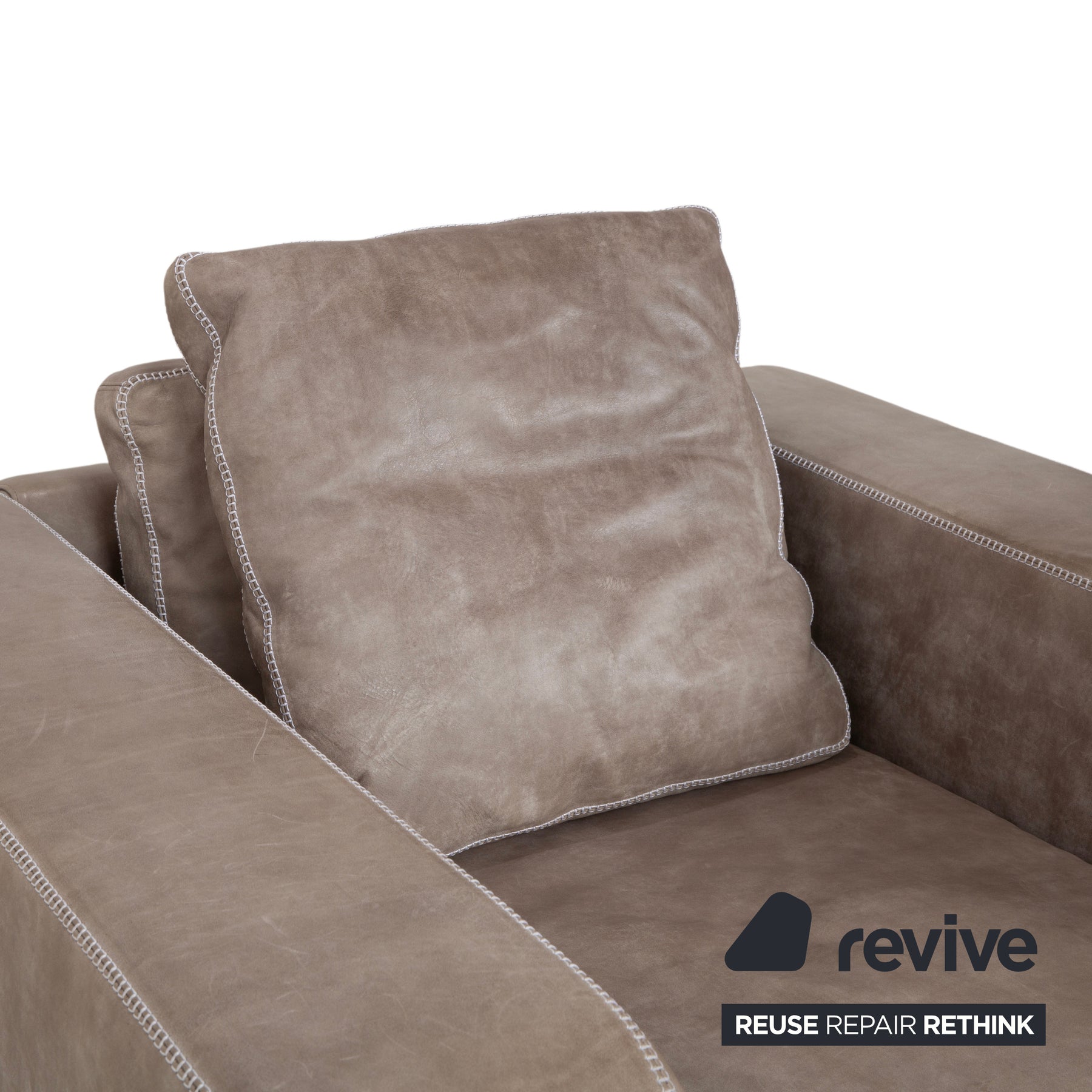 Das absolute Erkennungsmerkmal dieses Design-Klassikers ist die grobe, helle Ziernaht (Kettelnaht). Sie rahmt die Kanten des Sessels und bildet einen rustikalen, handwerklichen Kontrast zum grauen Leder. Ein loses Rückenkissen sorgt dafür, dass man nicht starr sitzt, sondern sich gemütlich in die tiefe Sitzfläche fallen lassen kann.
