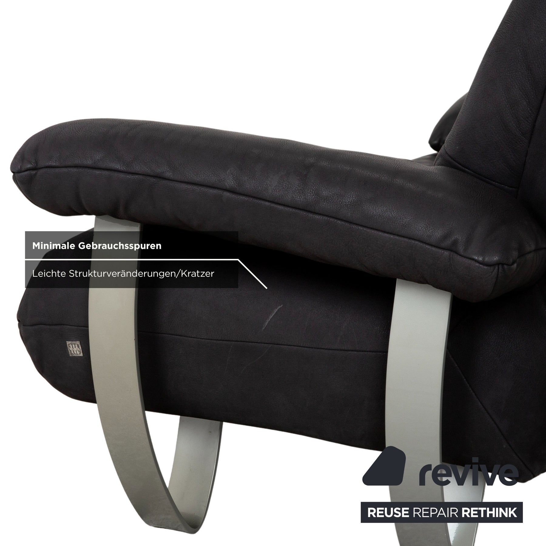 Der Zweisitzer von Musterring ist mit schwarzem Leder bezogen und steht auf einem markant geschwungenen Gestell mit integrierten Armlehnen in silberner Ausführung. Der Kontrast zwischen klarer Linienführung und den weicheren Polsterelementen unterstreicht den modernen Charakter.