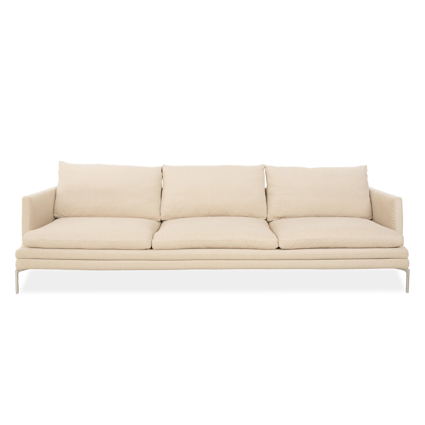 Das Zanotta William Stoff Dreisitzer Sofa ist mit dem Stoff MALOU 172 neubezogen, welcher aus 100% Polyester besteht. Durch die schlichte Creme-Beige Farbe auf silbernen, aus einer polierter Aluminiumlegierung bestehenden, Füßen fügt es sich optimal in Jeden Raum ein. Es ist die optimale Kombination aus minimalistischem Design und absolutem Komfort. Die Polsterung des Sitzes als auch die der Rücken- und Armlehne bestehen zu 100% aus Gänsedaunen und sorgen damit für garantierten Komfort.