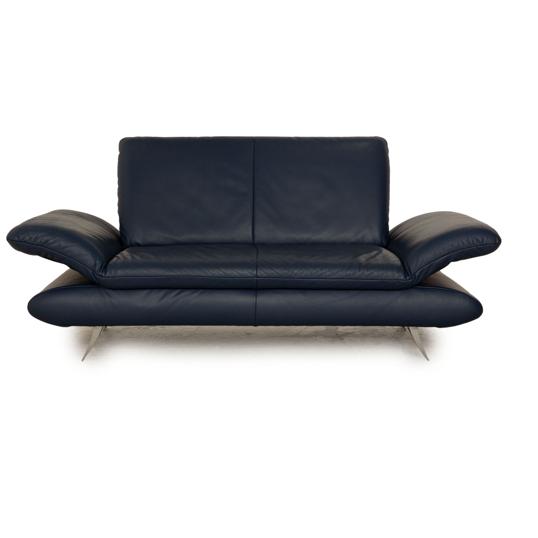 Das Rossini Sofa von Koinor ist mit einem blauen Echtleder bezogen und steht auf Metallfüßen. Das klassische, zeitlose Design und die verstellbaren Armlehnen zeichnen den Zweisitzer aus.