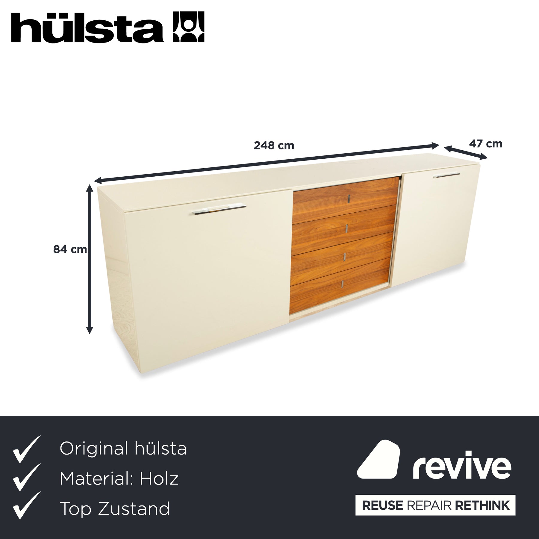 Dieses elegante Hülsta Sideboard vereint zeitloses Design, höchste Materialqualität und praktische Funktionalität – perfekt für moderne Wohnräume. Die Kombination aus cremefarbenen Fronten und einer Echtholz-Mittelpartie mit warmen Holzschubladen verleiht dem Möbelstück eine stilvolle und zugleich wohnliche Ausstrahlung.