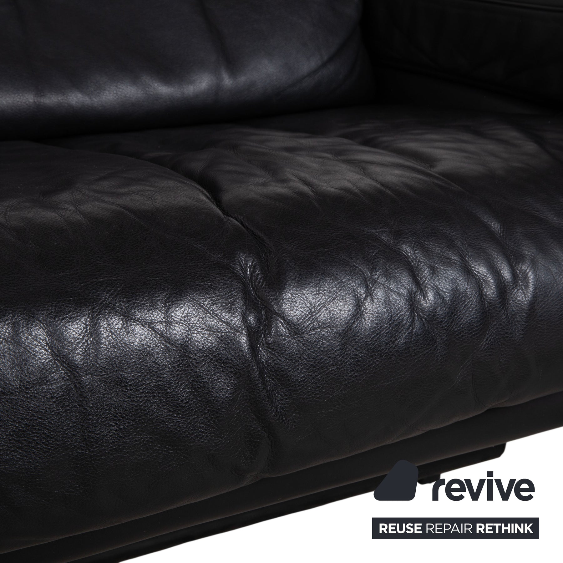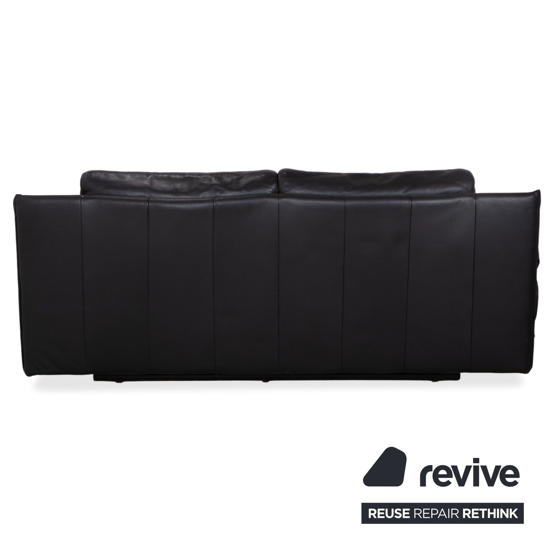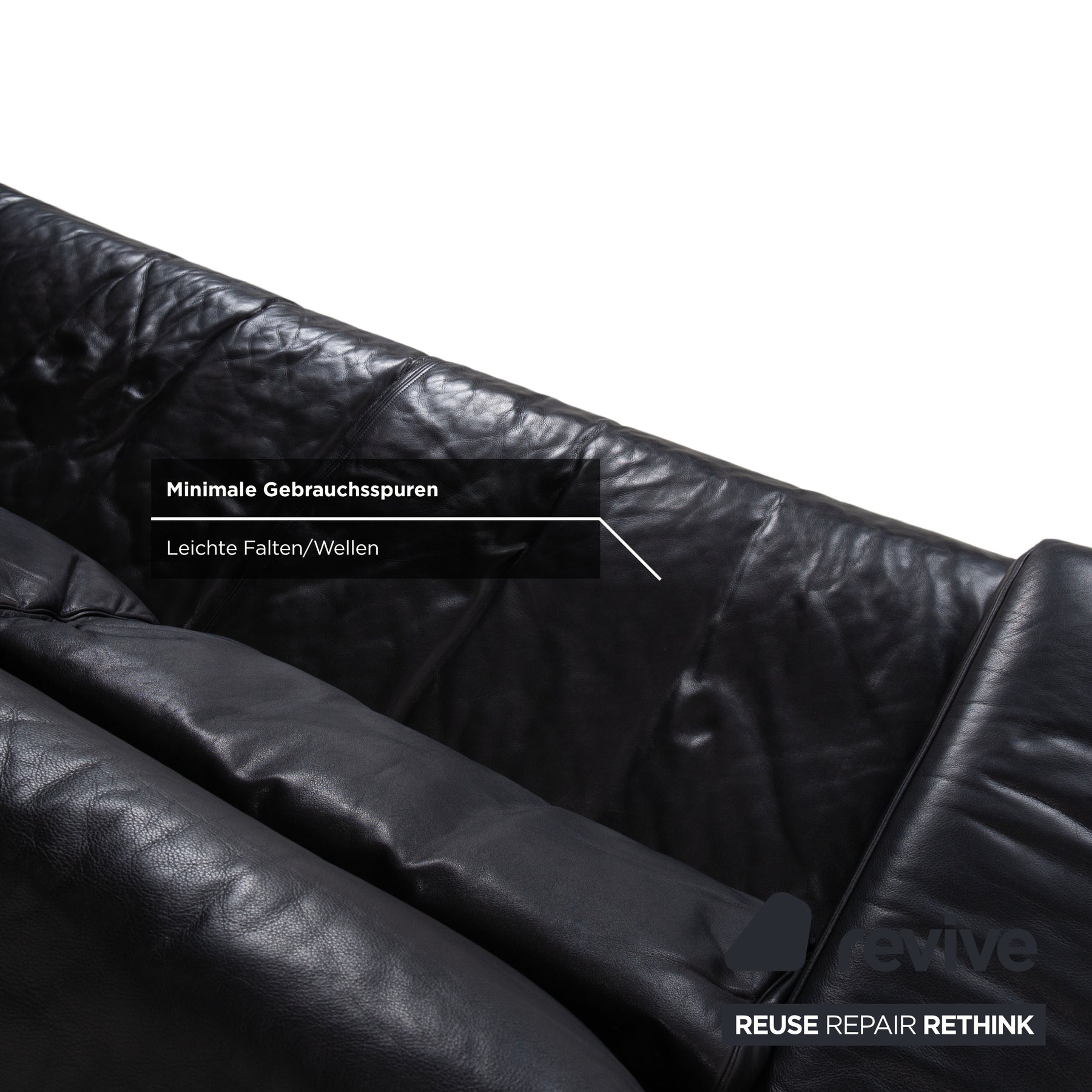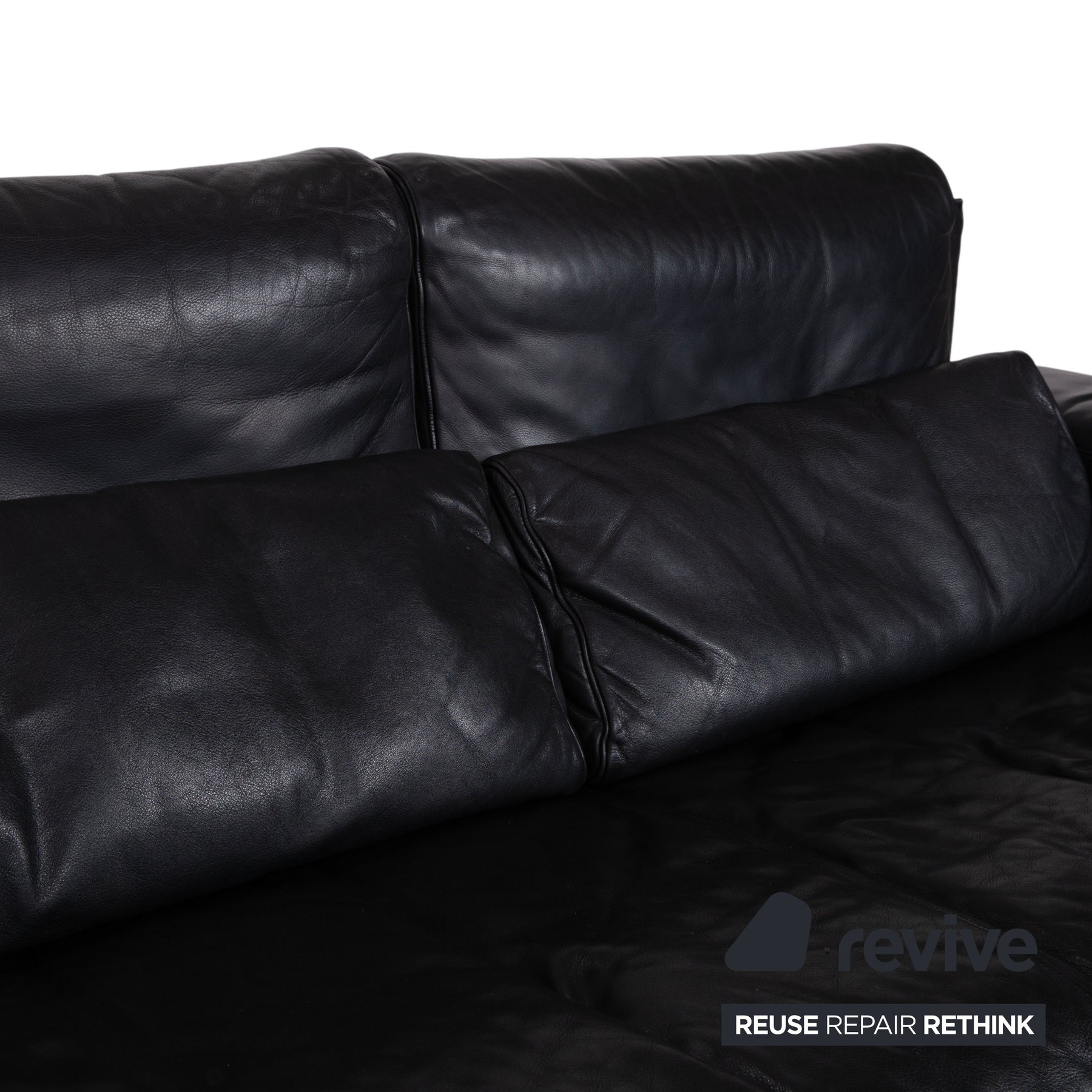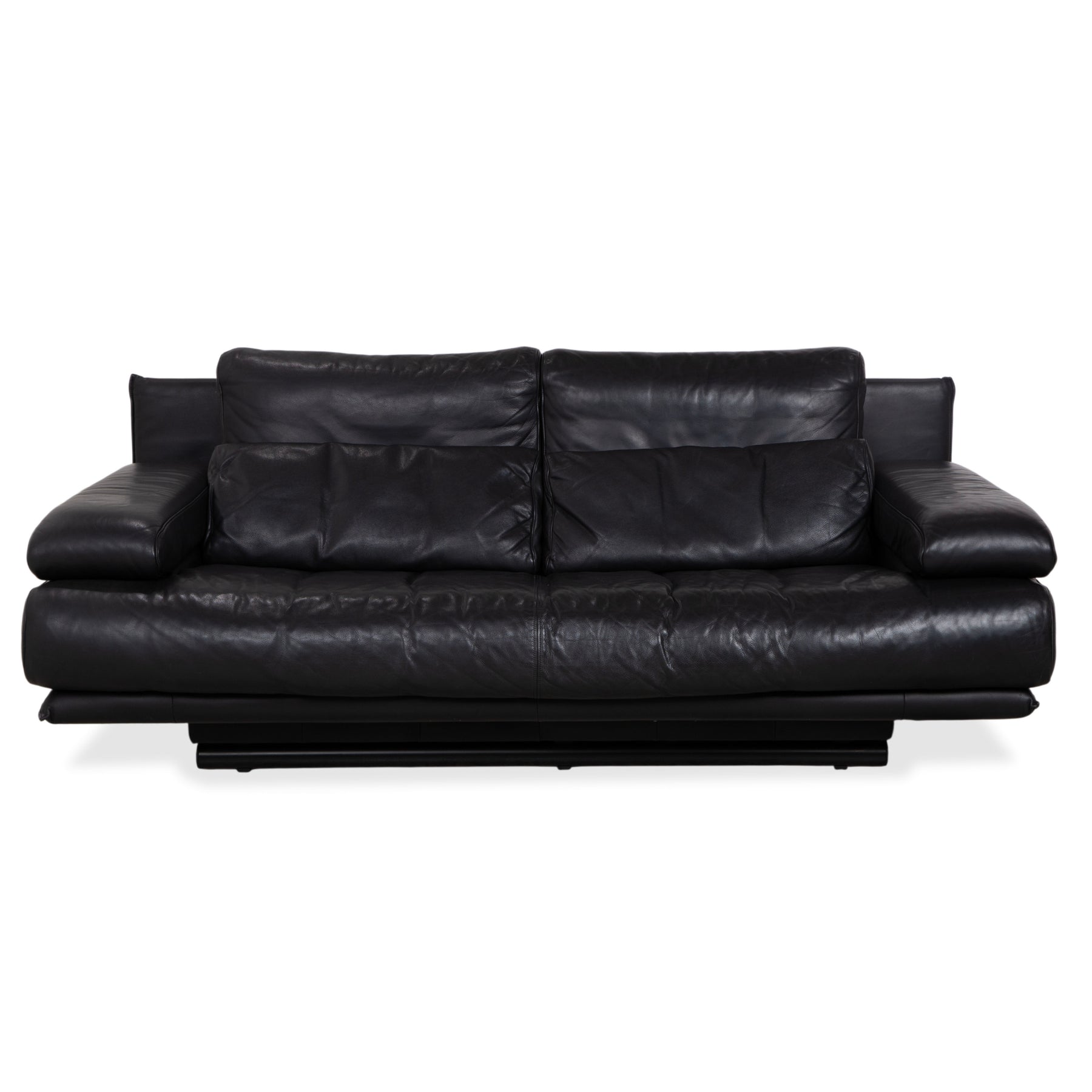 Der Zweisitzer ist in hochwertiges, tiefschwarzes Leder gehüllt. Das Material wirkt unglaublich weich und wirft auf der Sitzfläche die charakteristischen Falten, die den legeren und luxuriösen Komfort dieses Modells unterstreichen. Das markanteste Merkmal ist die doppelte Kissenstruktur der Rückenlehne. Diese Konstruktion ist der Schlüssel zur manuellen Funktion: Die Rückenlehnen sind höhenverstellbar. Du kannst sie nach oben klappen, um aus dem eleganten Niedriglehner einen bequemen Hochlehner zu machen, der den Kopf perfekt stützt.