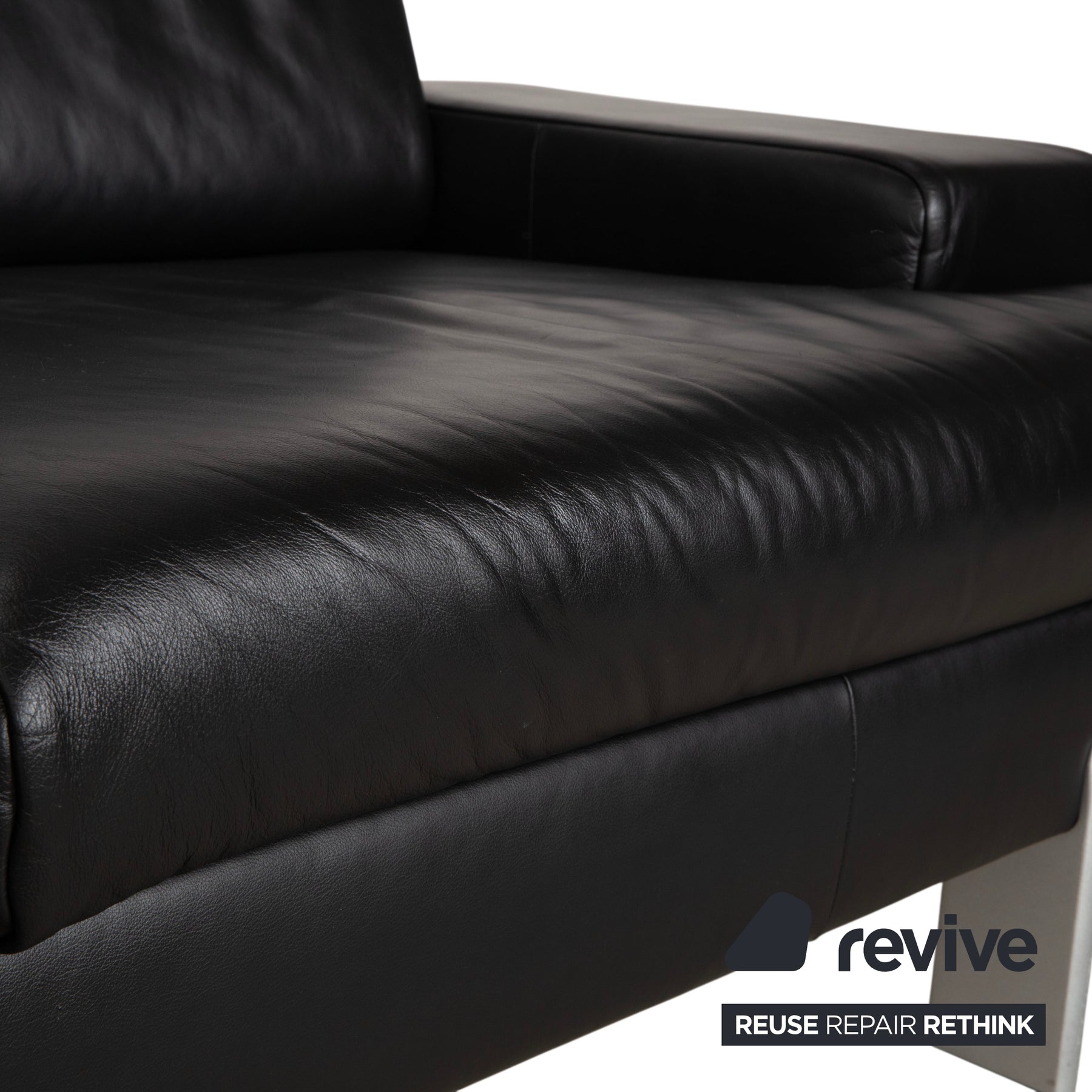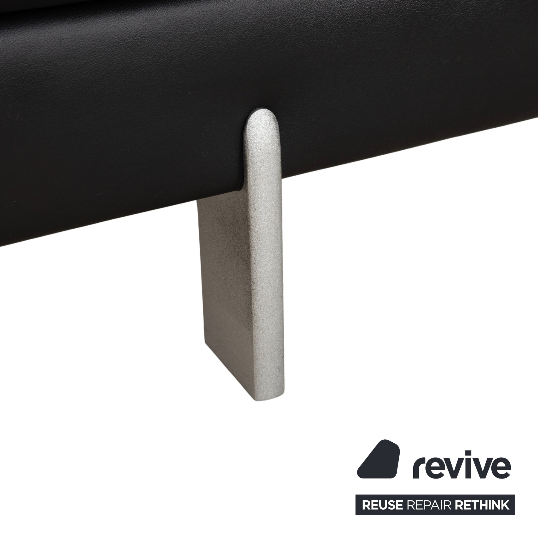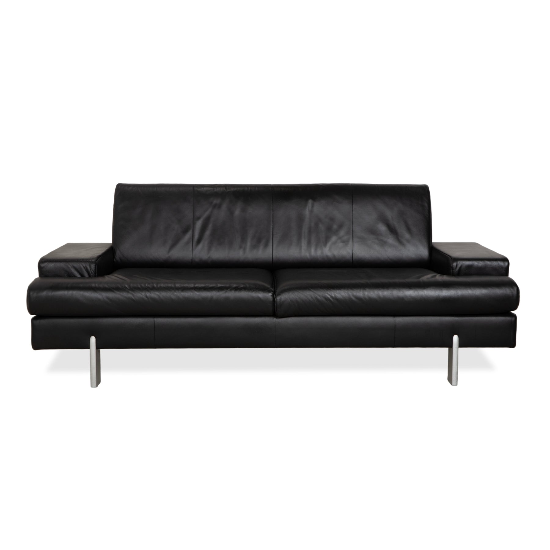 Die Sitz- und Rückenfläche ist optisch in zwei breite Segmente unterteilt, bietet aber großzügigen Platz für drei Personen. Die Polsterung wirkt straff und formstabil, ideal für aufrechtes, komfortables Sitzen. Getragen wird der massive Korpus von schlichten, silbernen Metallfüßen in Zylinderform. Sie heben das Sofa leicht an, sorgen für einen sicheren Stand und setzen einen modernen, hellen Akzent zum tiefen Schwarz des Leders.