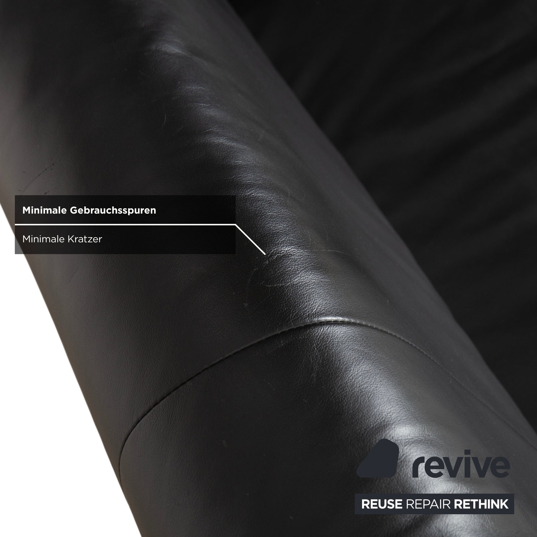 Der Dreisitzer ist in hochwertiges, schwarzes Leder gehüllt. Die Oberfläche ist glatt und zeigt einen dezenten Glanz, der dem Möbelstück eine kühle Eleganz verleiht und es unempfindlich für den Alltag macht. Die Formensprache ist streng geometrisch und kubisch: Die Linien verlaufen horizontal und ruhig. Besonders markant sind die breiten, flachen Armlehnen, die wie massive Blöcke wirken und das Design an den Seiten solide abschließen.