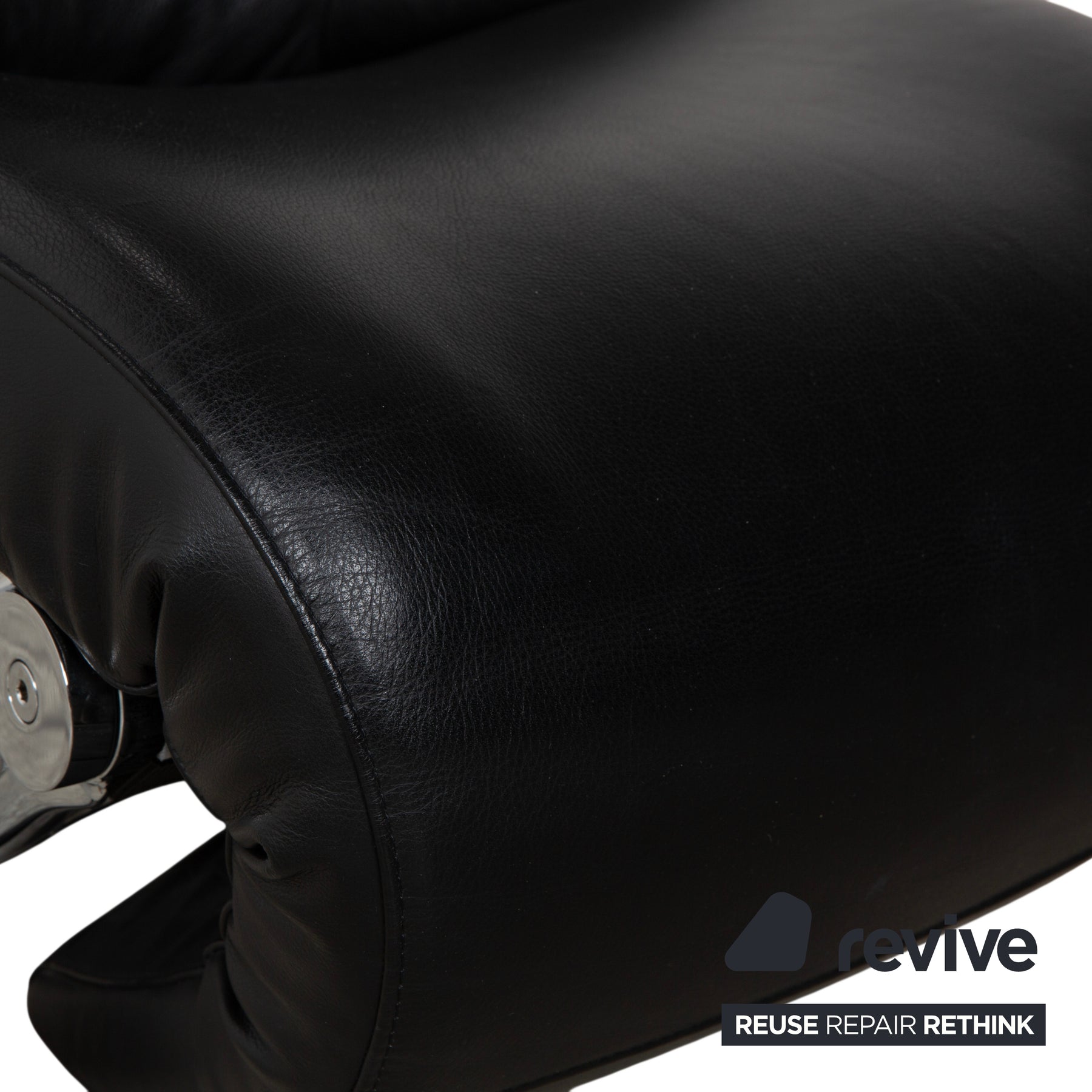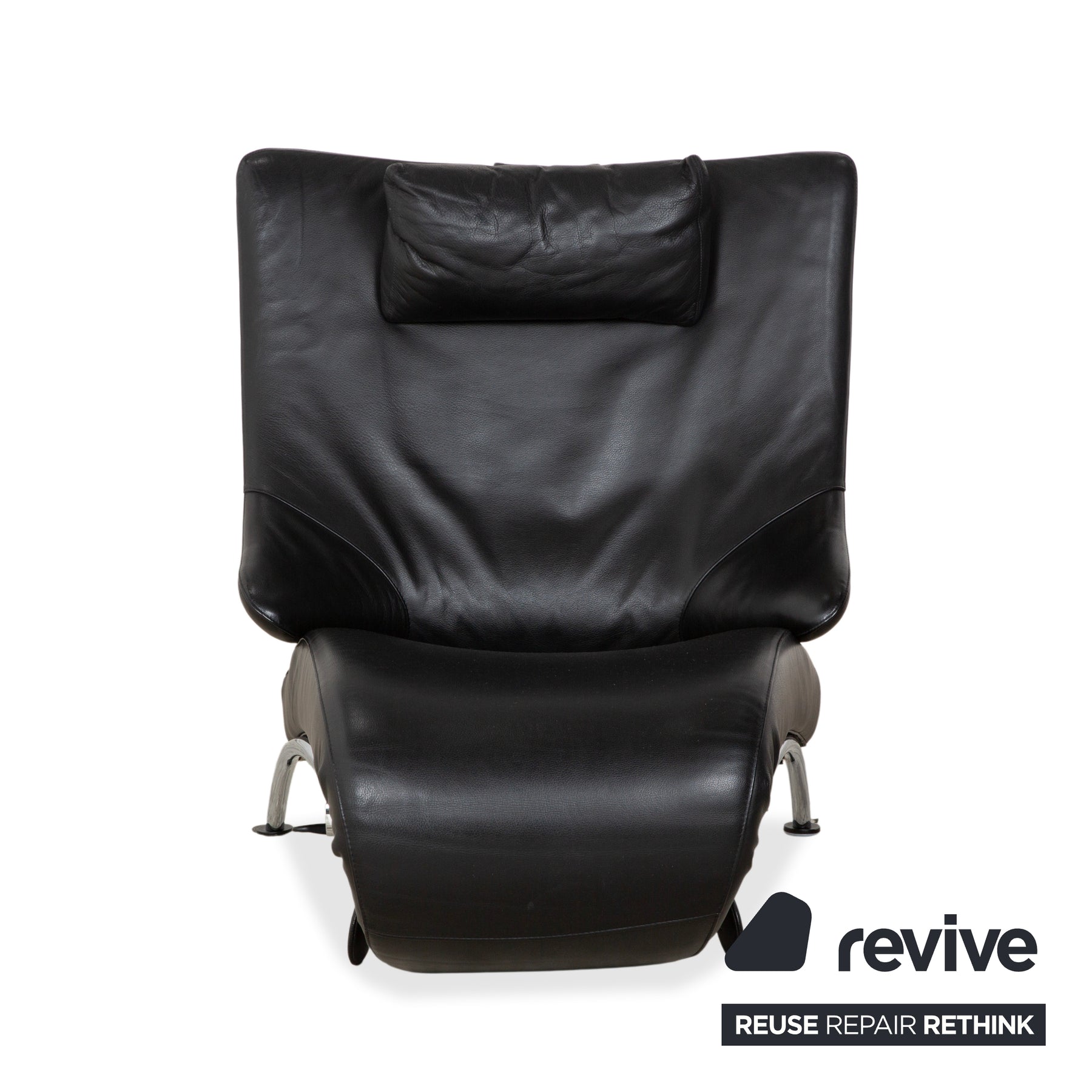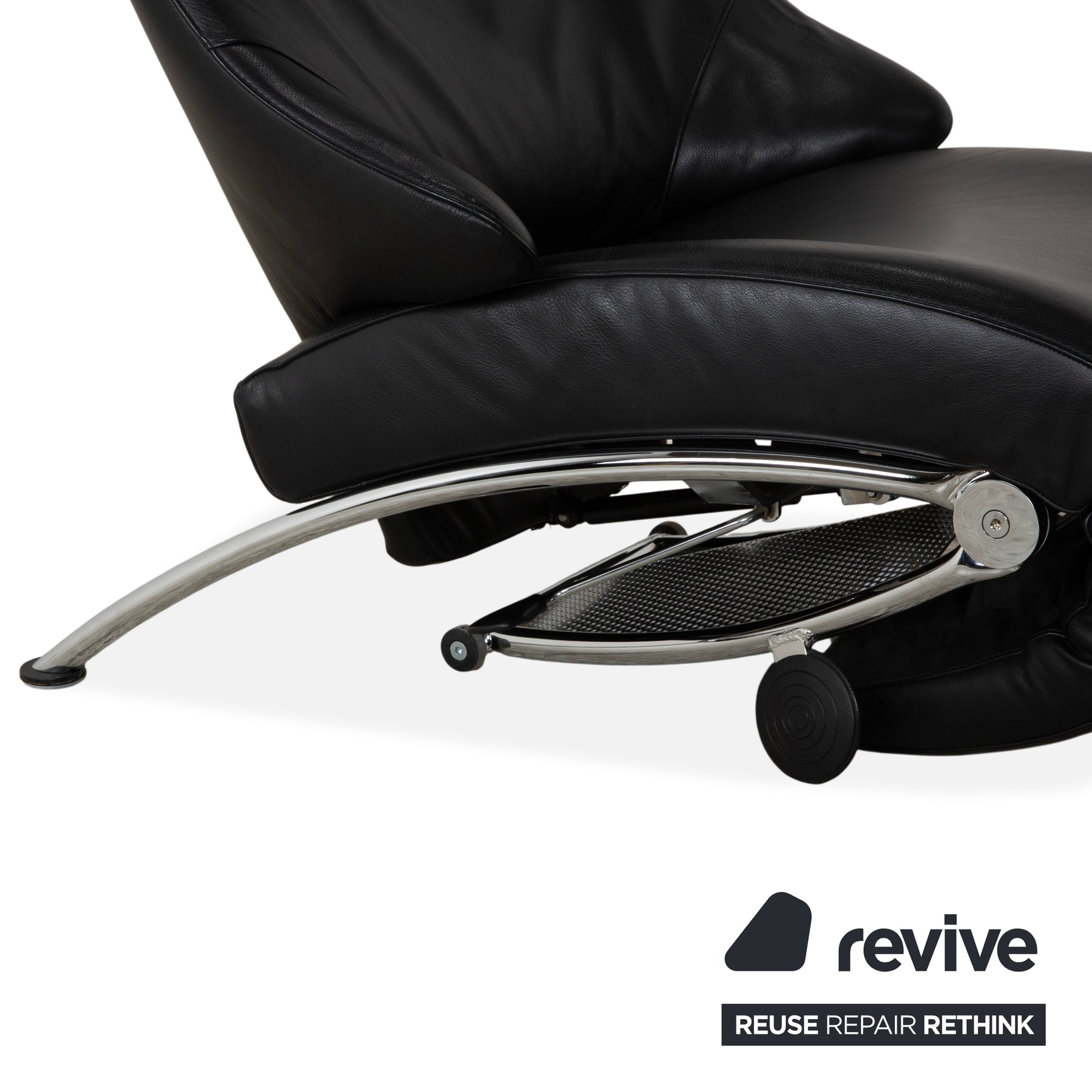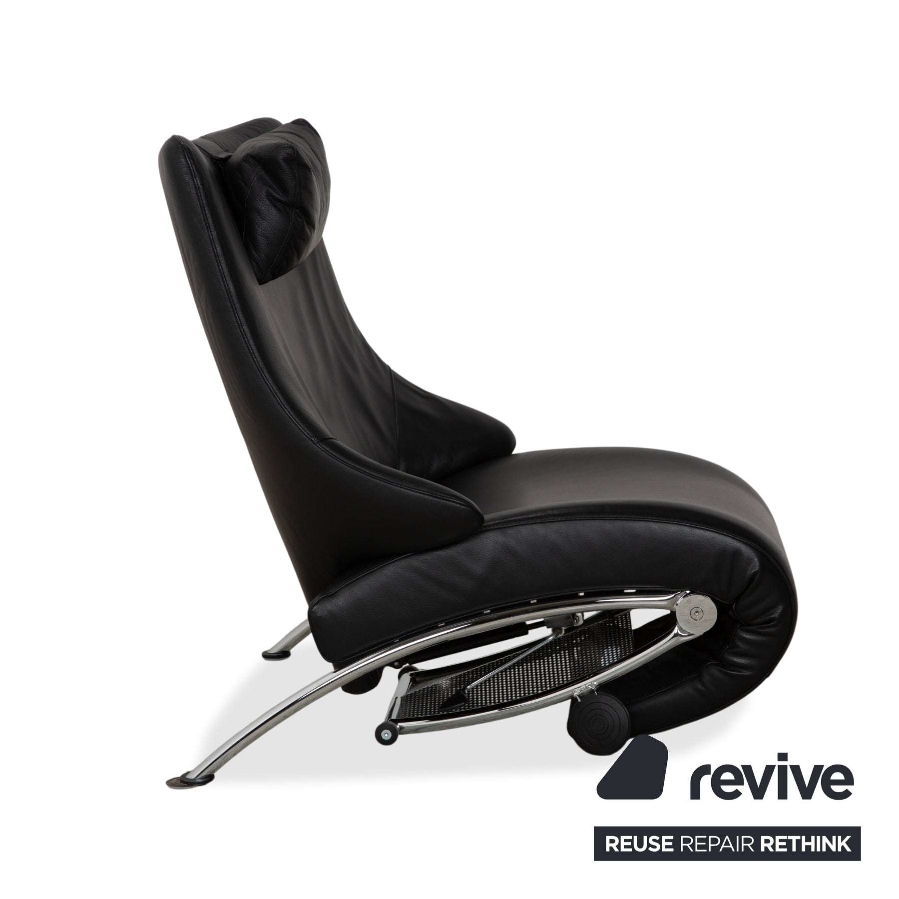 Ein faszinierender Kontrast zum Leder ist das glänzende Metallgestell. Die geschwungenen Kufen und die sichtbare Mechanik unter dem Sitz geben dem Sessel einen technischen, fast bionischen Look. Dank der manuellen Funktion lässt sich der Sessel stufenlos verstellen, wobei sich die gesamte Sitzschale nach hinten neigt und das Fußteil ausfährt – perfekt für die absolute Entspannung.