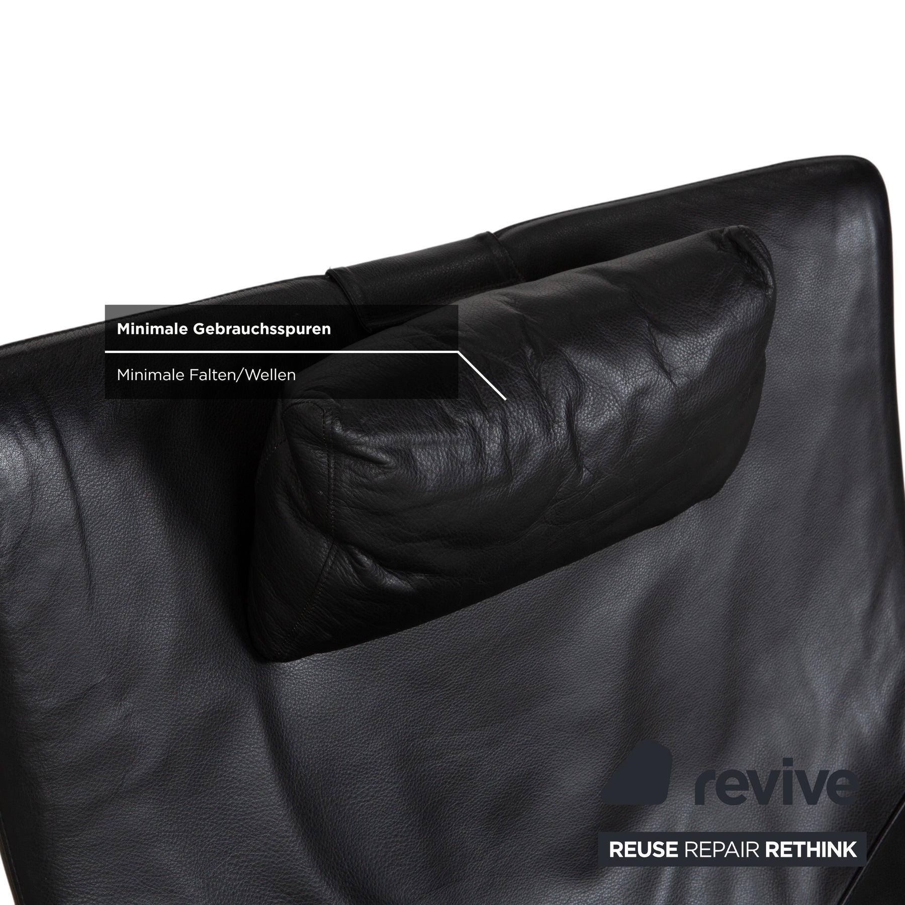 Der Sessel ist in weiches, schwarzes Leder gehüllt, das besonders im Bereich der Rückenlehne und des Sitzes einen lässigen Faltenwurf zeigt und so die Weichheit des Polsters betont. Die Form ist organisch und schwungvoll: Die hohe Rückenlehne verbreitert sich oben ohrenartig und bietet zusammen mit dem aufgesteckten Kopfkissen perfekten Halt.