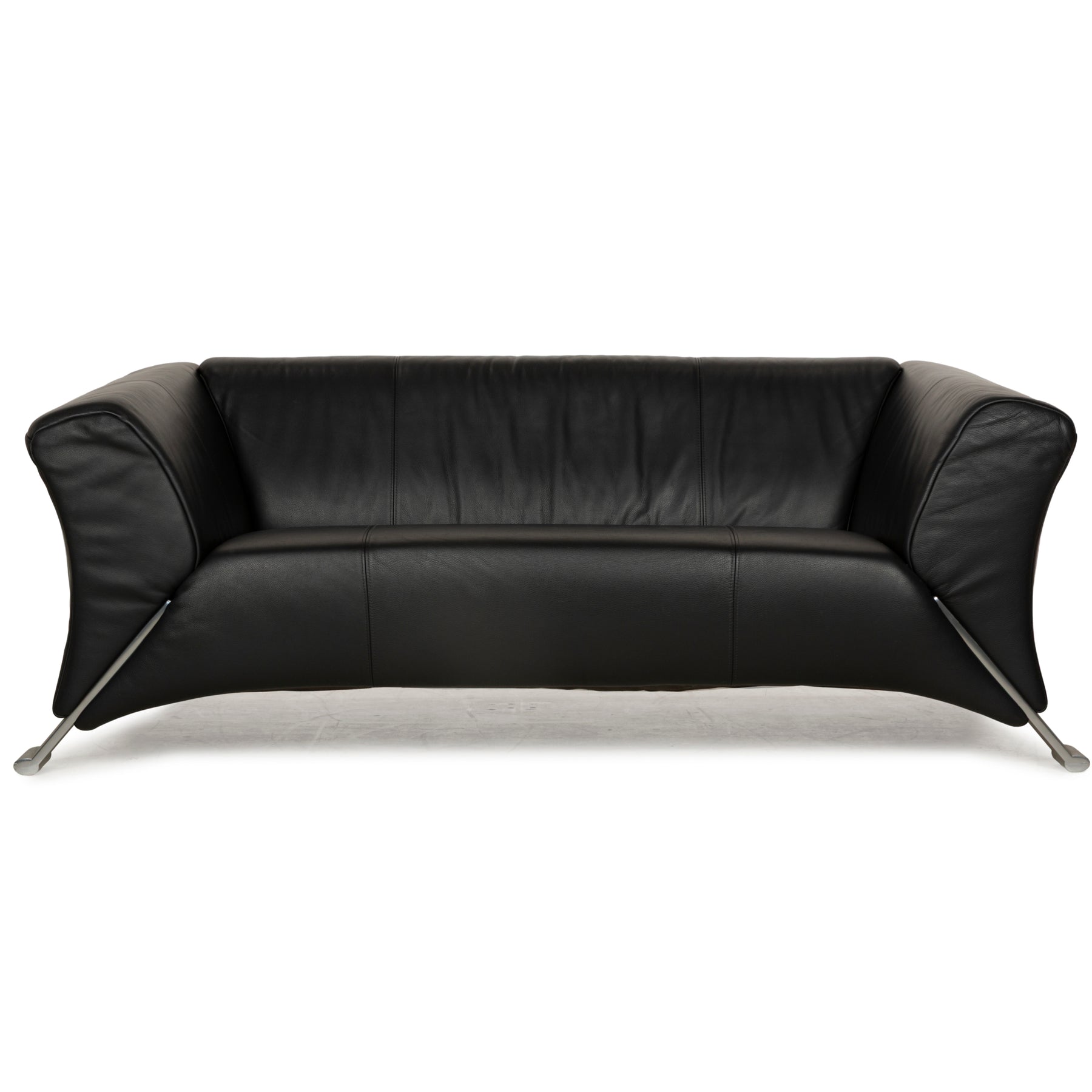 Das Sofa 322 von Rolf Benz ist mit schwarzem Leder bezogen und steht auf schräg vom Sofa wegführen Metallfüßen. Der Zweisitzer zeichnet sich durch sein reduziertes und leicht extravagantes Design aus: Rückenlehne und Armlehnen enden in gleicher Höhe, was den Fokus stärker auf die Gestaltung der Füße lenkt, die als fortgeführte Linie dem Sofa zu entwachsen scheinen.