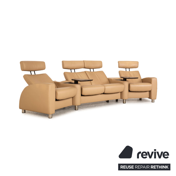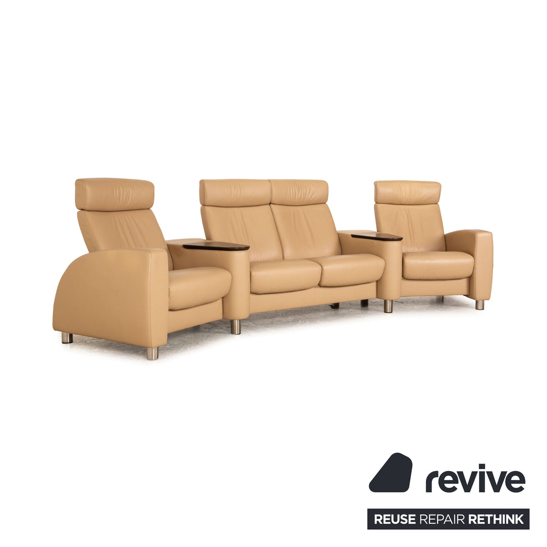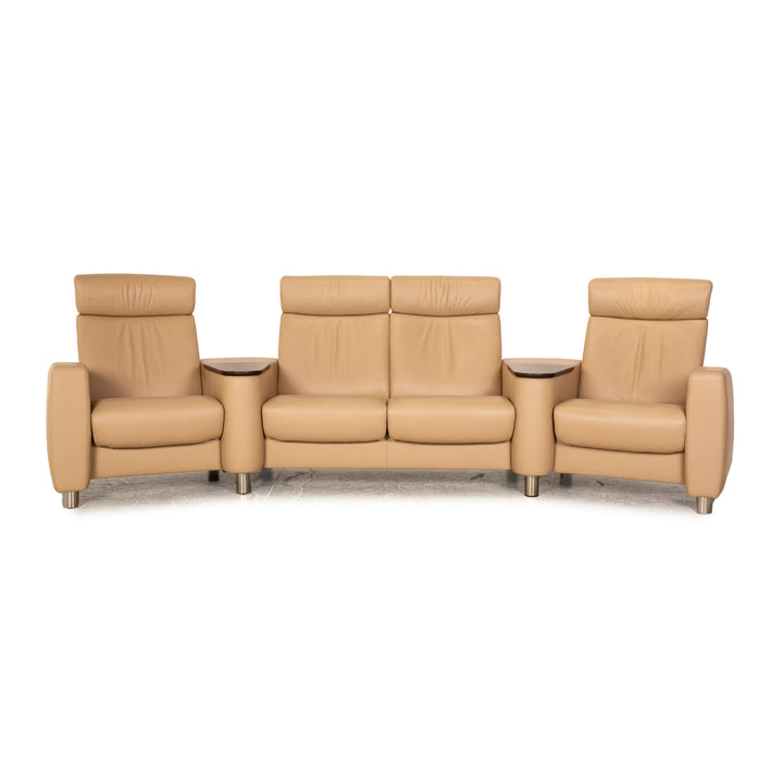 Der Viersitzer Arion von Stressless ist mit einem cremefarbenen Echtleder bezogen und steht auf runden Metallfüßen. Er zeichnet sich durch die komfortable Relaxfunktion und die integrierten Holzablagen aus.
