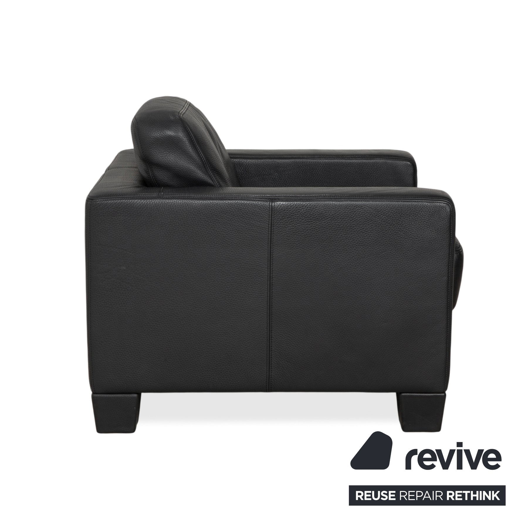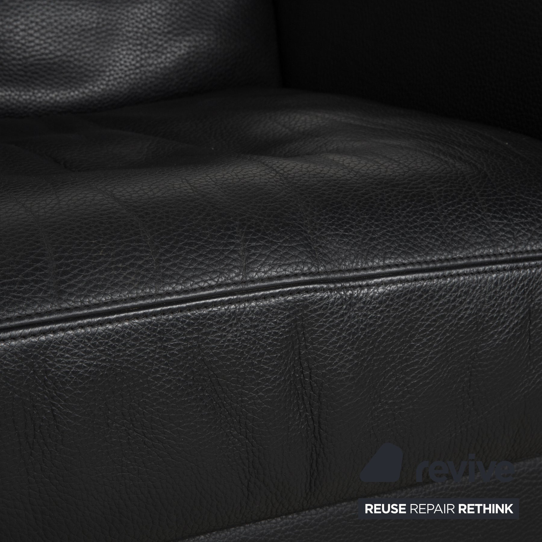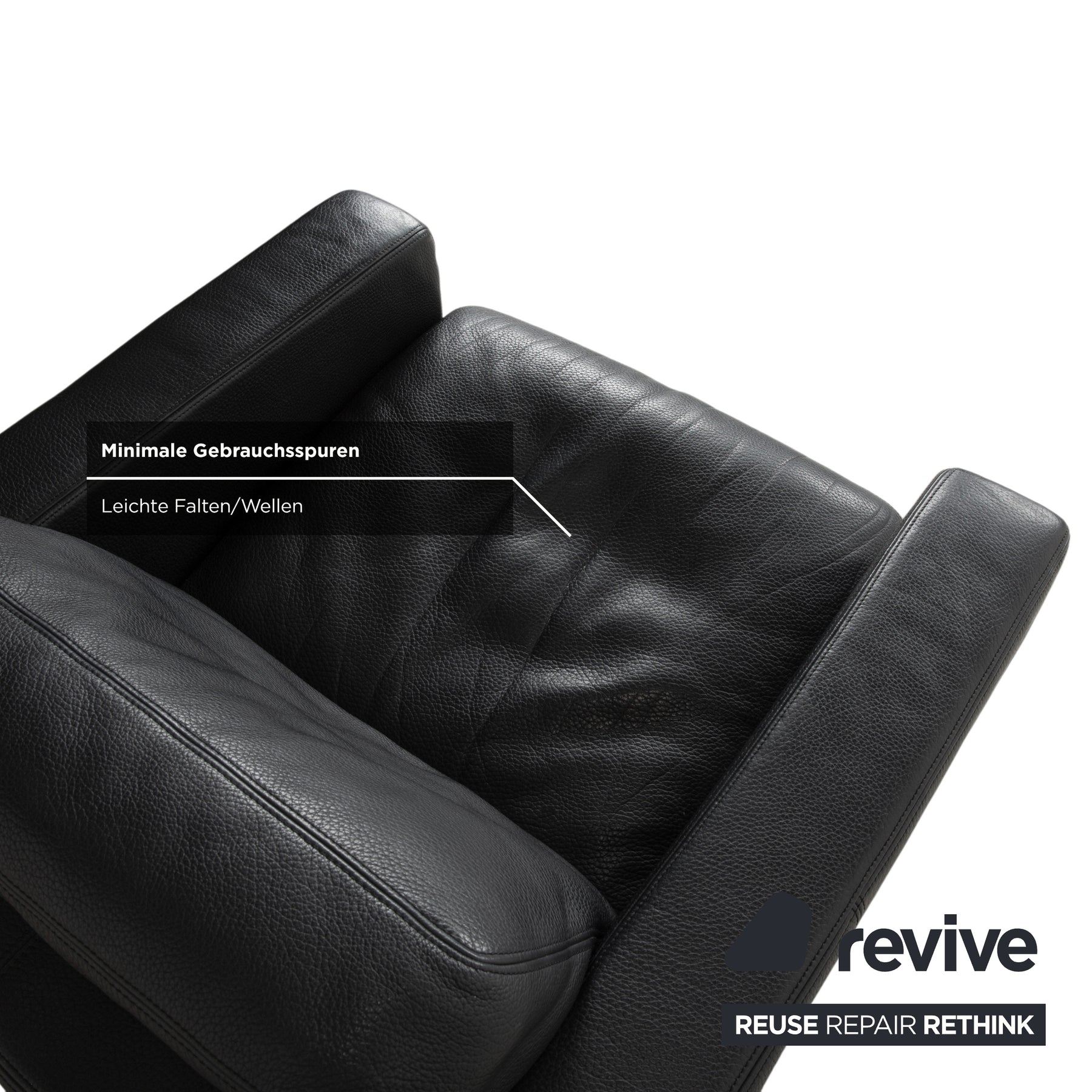 Der Sessel ist rundum in hochwertiges, schwarzes Leder gekleidet. Typisch für de Sede ist, dass das Leder nicht totgespannt wirkt, sondern leben darf: Die natürlichen Falten im Rückenpolster und auf der Sitzfläche zeugen von der Dicke und Weichheit des Materials und versprechen sofortige Gemütlichkeit. Die Formensprache ist streng kubisch und maskulin: Die breiten Armlehnen rahmen den Sitzplatz klar ein und bieten eine solide Ablagefläche für die Arme (oder das Tablet). Ein feines Detail sind die sichtbaren Nähte an den Kanten, die die Architektur des Sessels betonen.