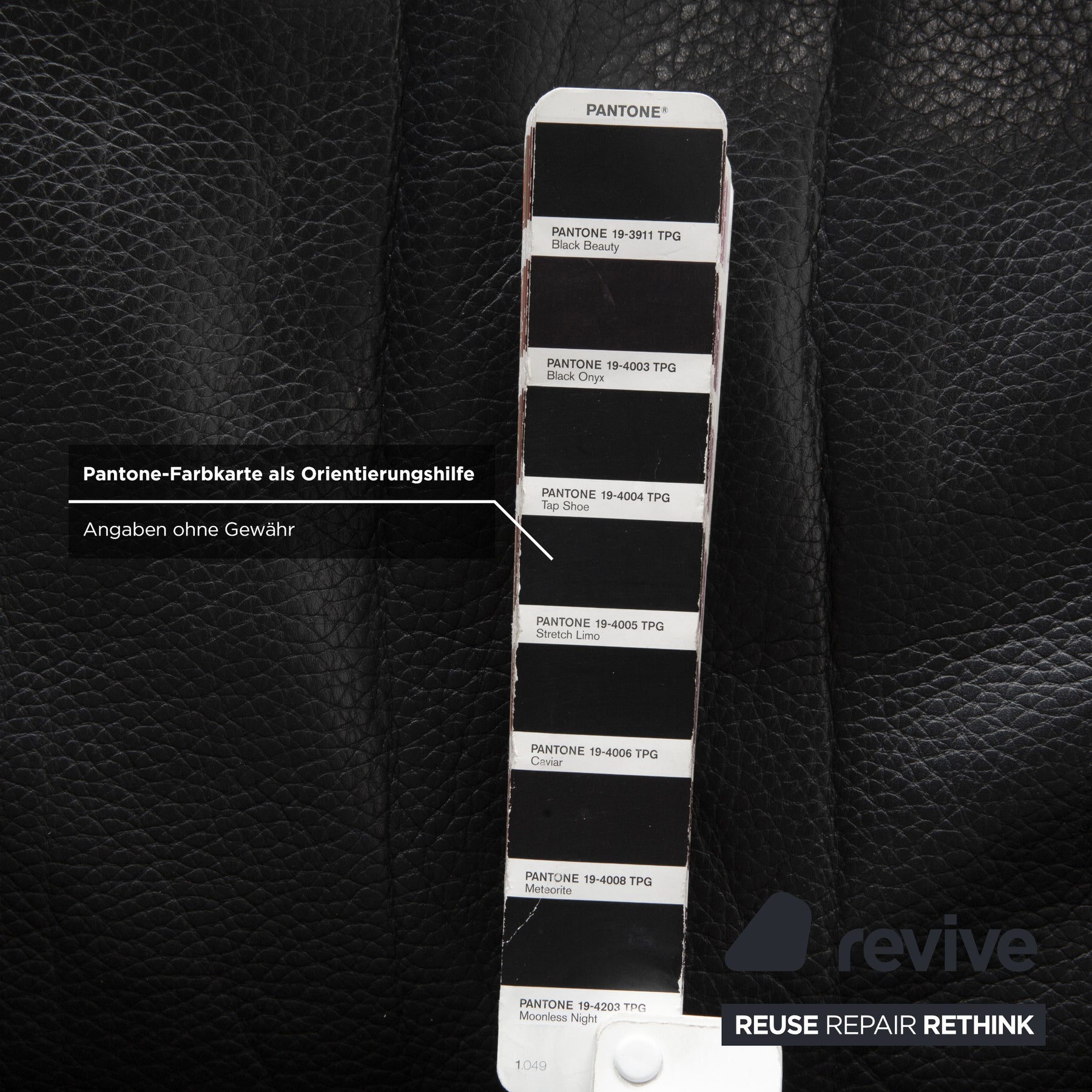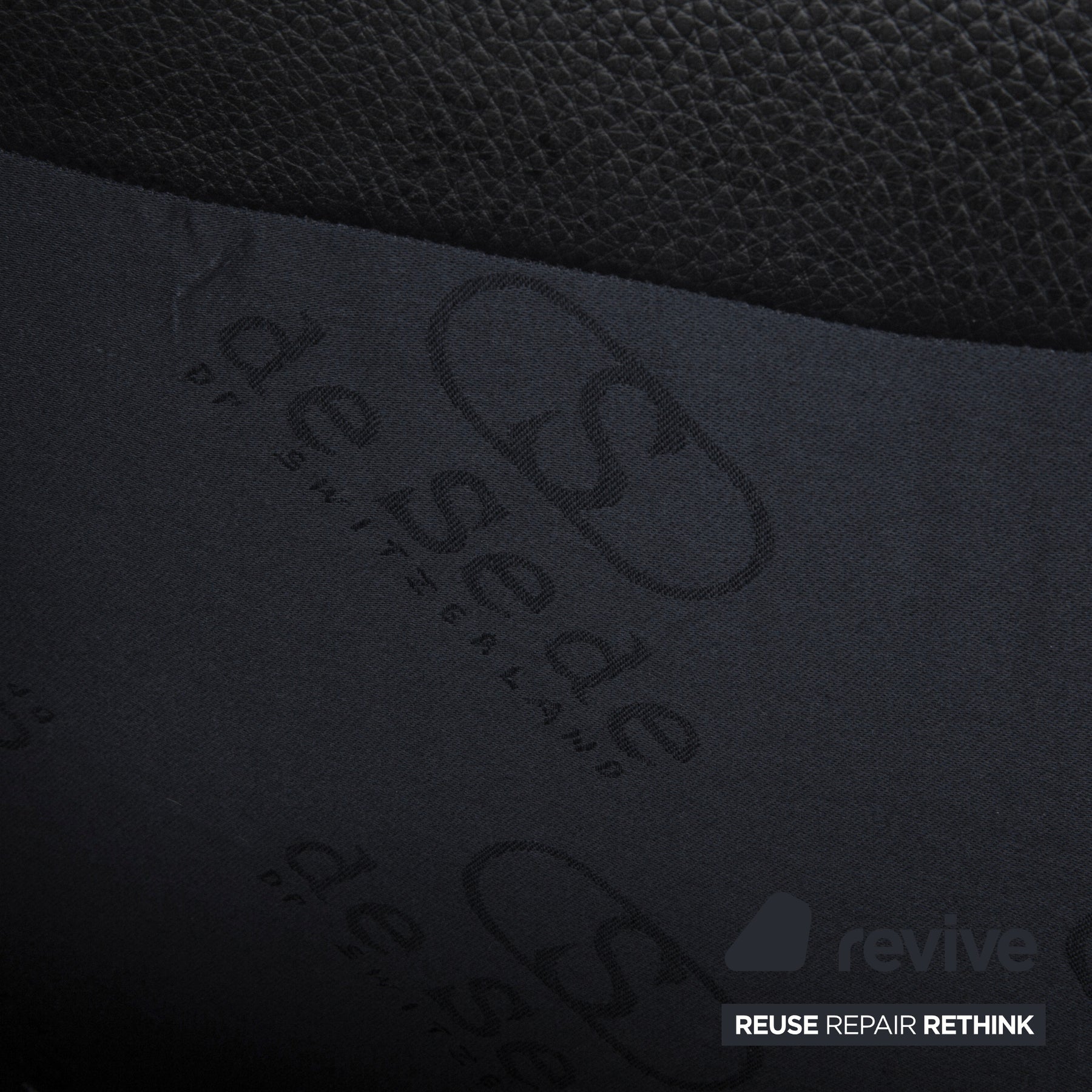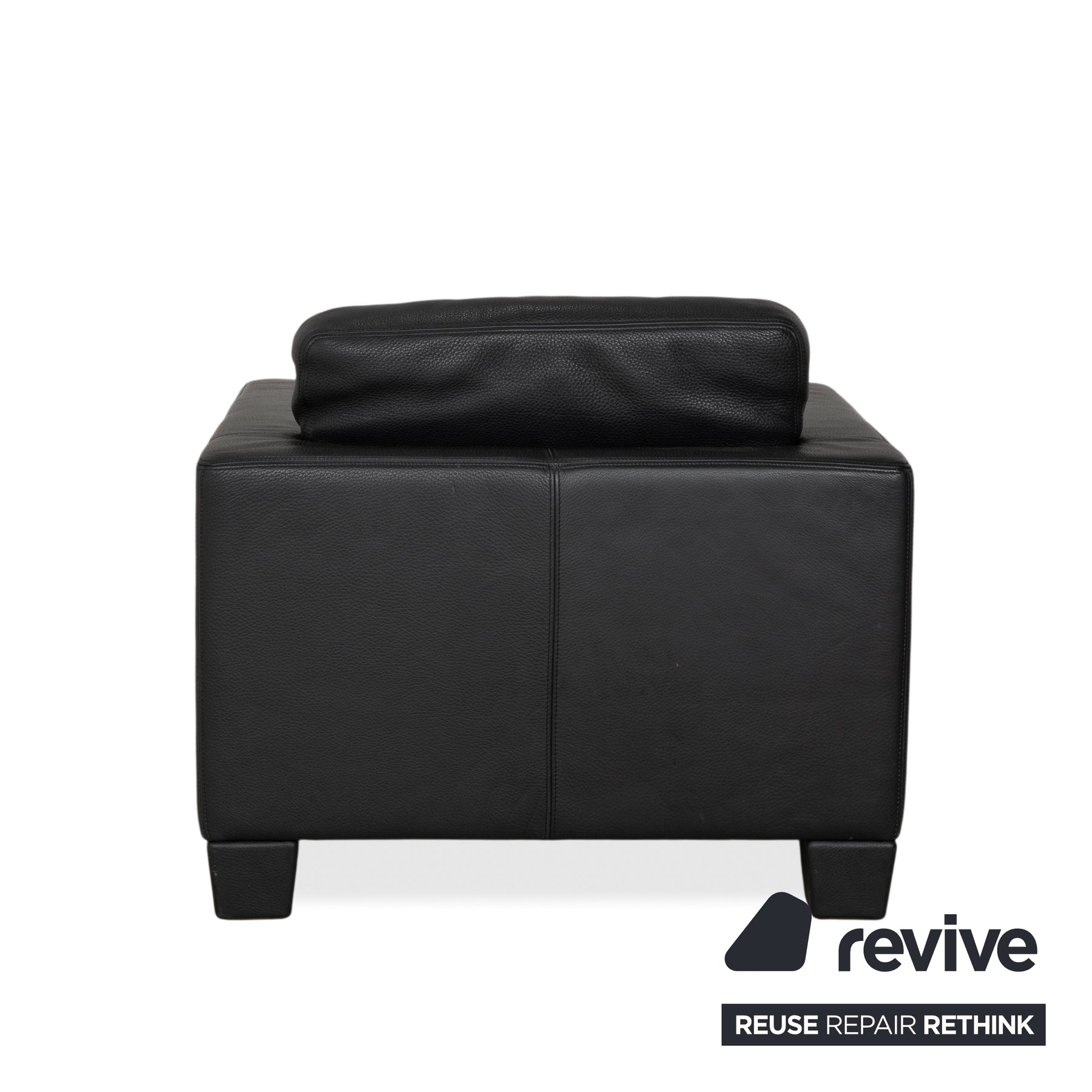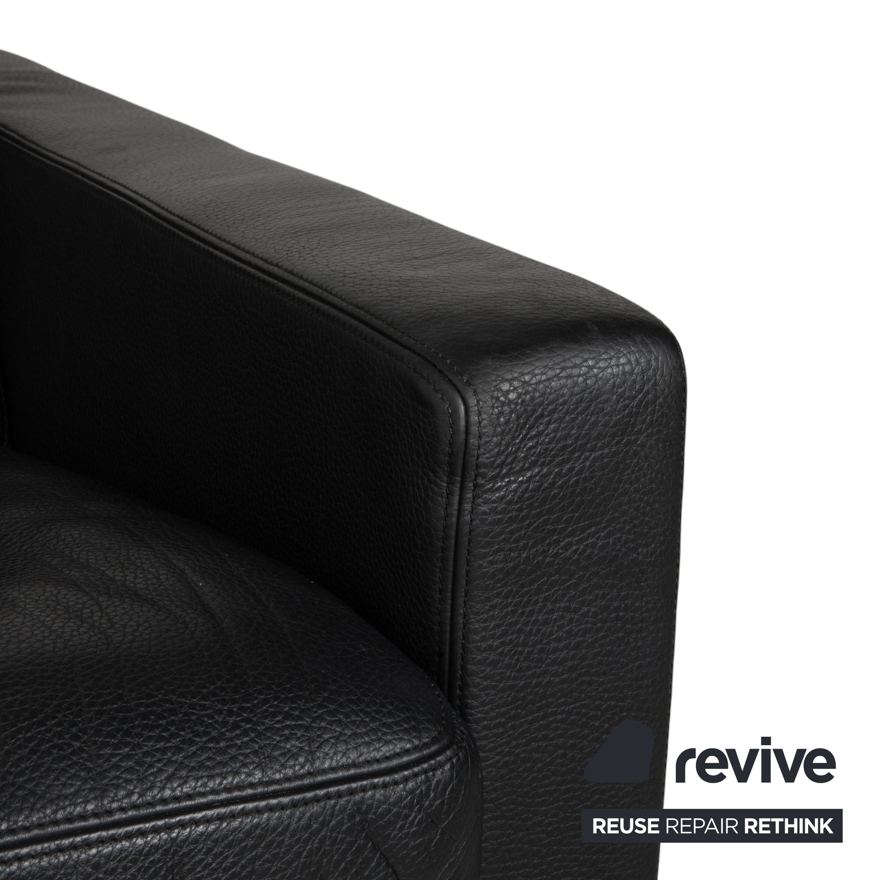 Der Sessel ist rundum in hochwertiges, schwarzes Leder gekleidet. Typisch für de Sede ist, dass das Leder nicht totgespannt wirkt, sondern leben darf: Die natürlichen Falten im Rückenpolster und auf der Sitzfläche zeugen von der Dicke und Weichheit des Materials und versprechen sofortige Gemütlichkeit. Die Formensprache ist streng kubisch und maskulin: Die breiten Armlehnen rahmen den Sitzplatz klar ein und bieten eine solide Ablagefläche für die Arme (oder das Tablet). Ein feines Detail sind die sichtbaren Nähte an den Kanten, die die Architektur des Sessels betonen.