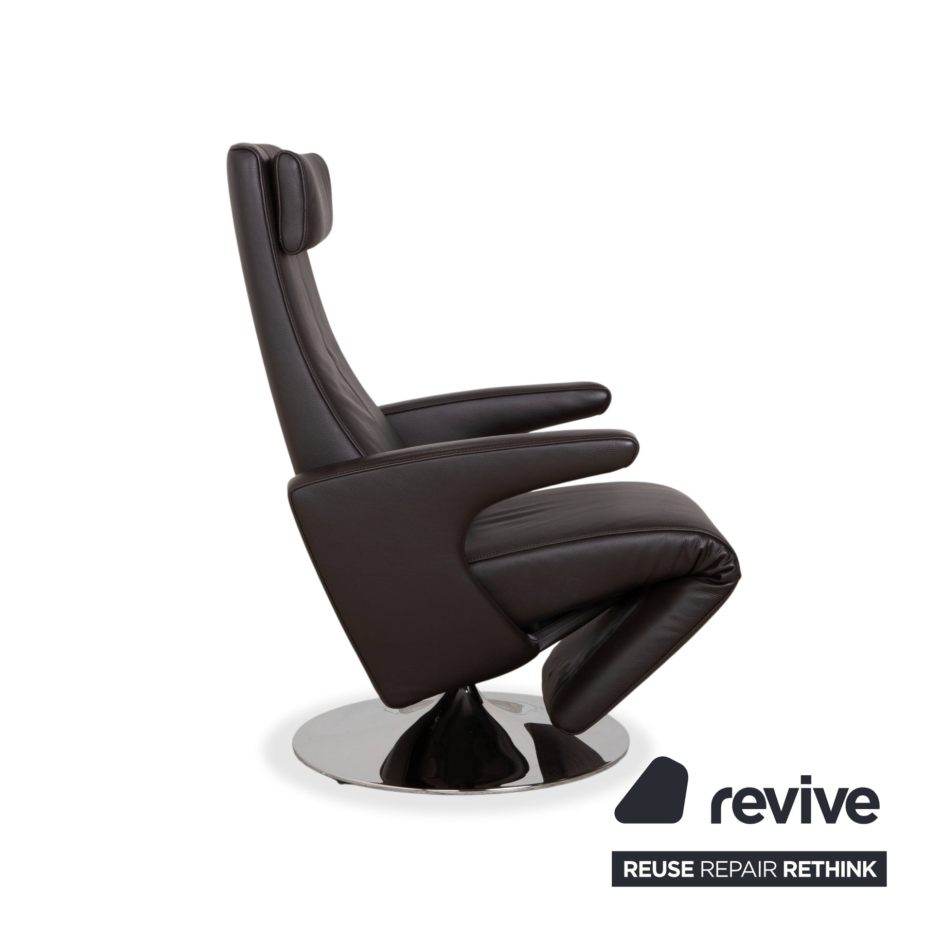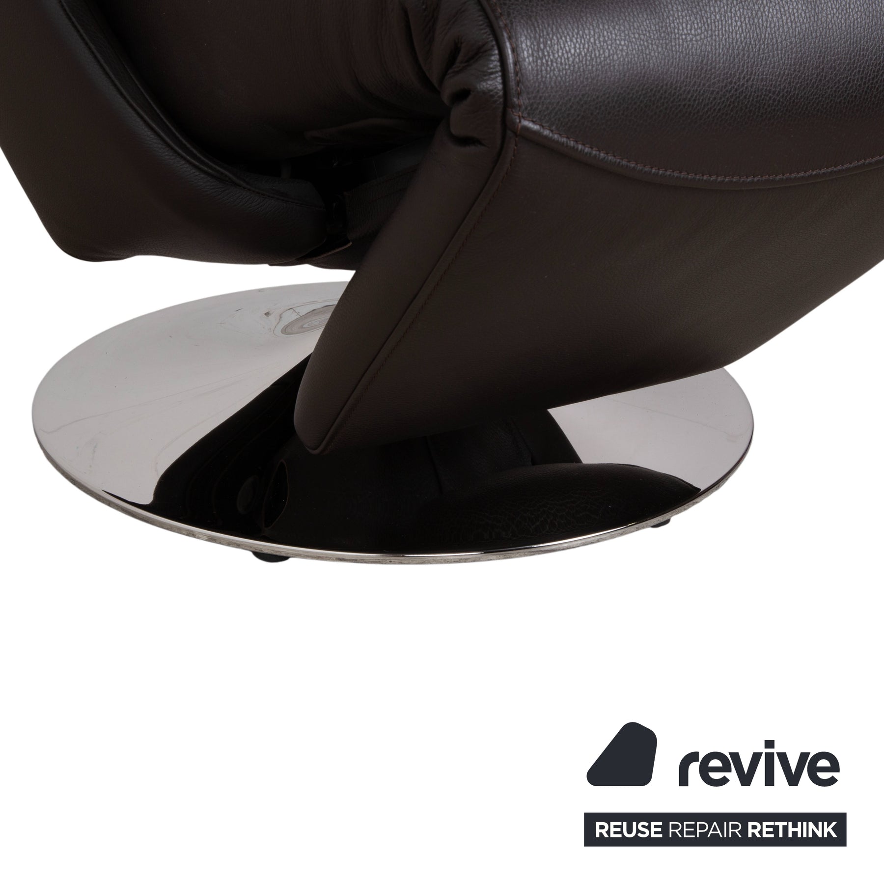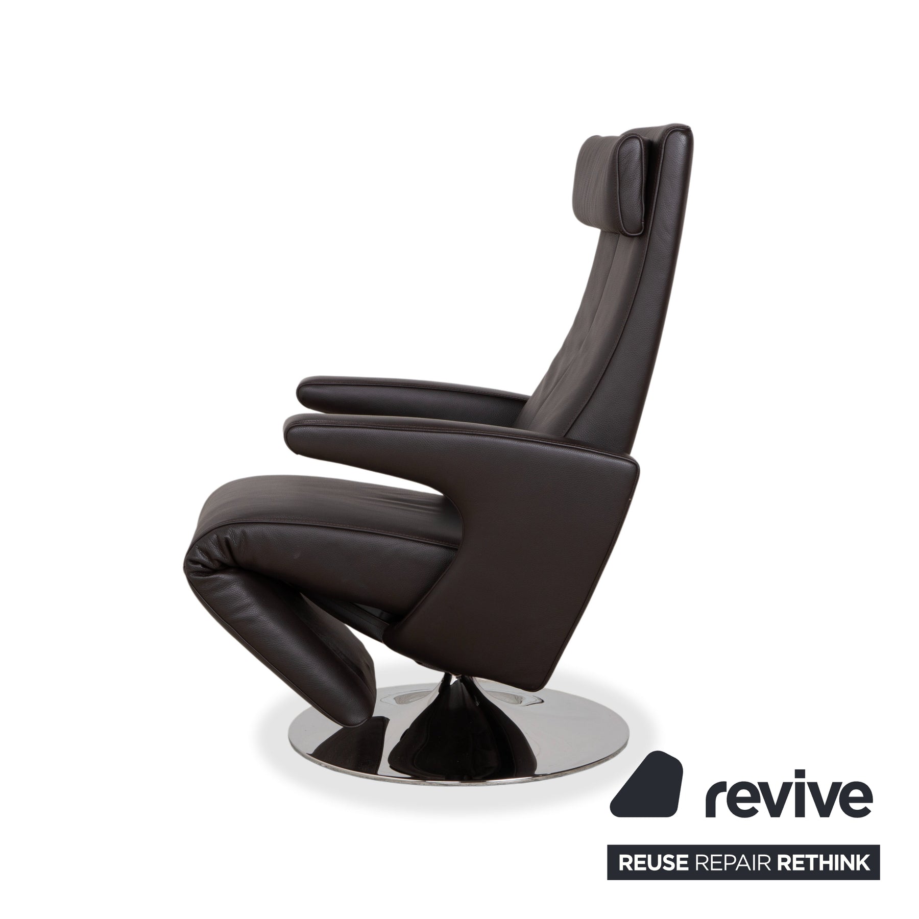 Für maximalen Komfort sorgt das separat aufgesetzte Nackenkissen am oberen Ende der hohen Lehne, das den Kopf perfekt stützt. Der Sessel steht auf einem runden, glänzenden Metallteller (Chrom-Optik). Dieser drehbare Fuß sorgt nicht nur für Stabilität, sondern bildet auch einen modernen, hellen Kontrast zum dunklen Lederkorpus. Dank der manuellen Funktion lässt sich die Sitzposition anpassen, und die integrierte Fußstütze (die im Design clever verborgen ist, wenn nicht genutzt) fährt aus, um die Beine zu entlasten.