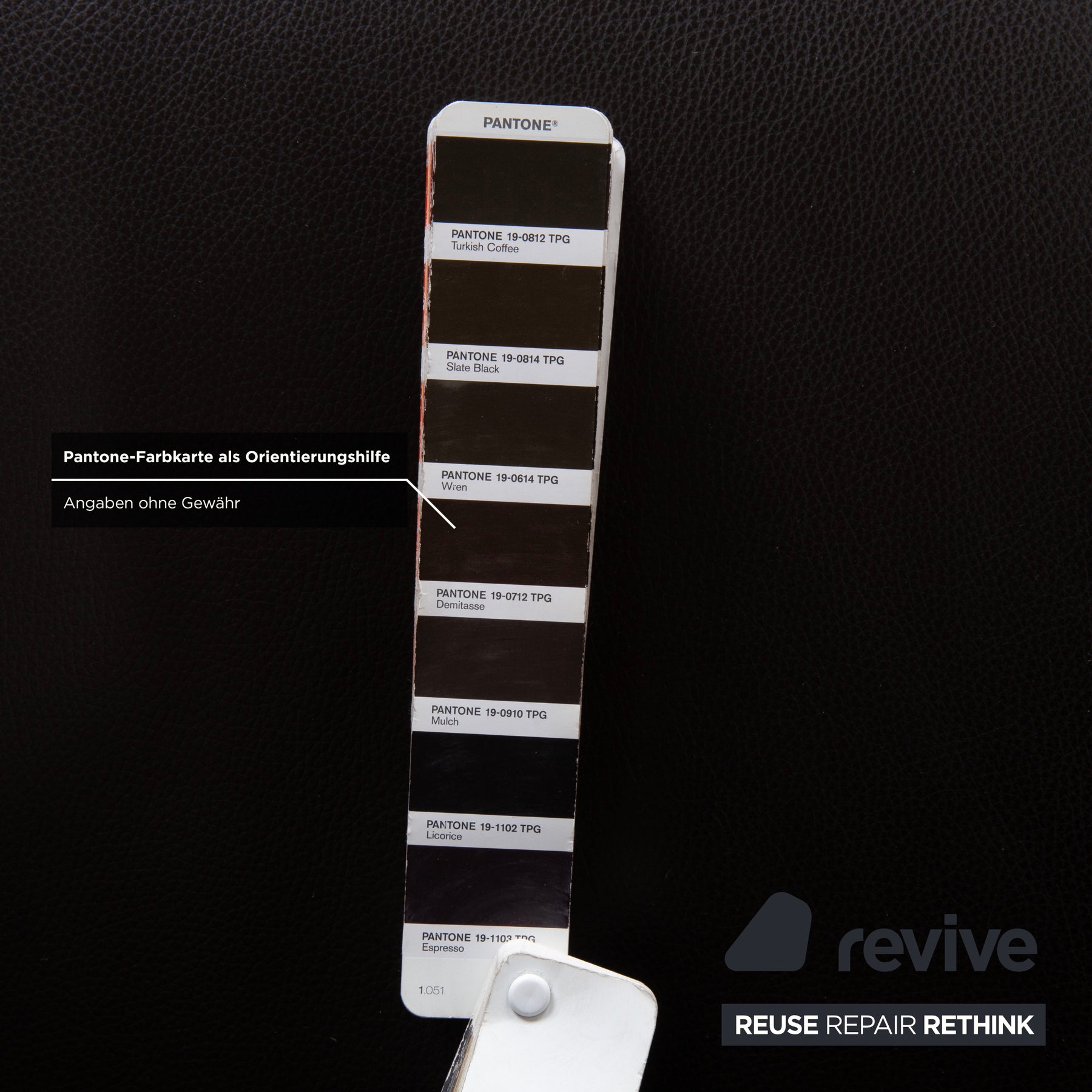 Der Sessel ist in hochwertiges Leder in einem tiefen, dunklen Braun (Mokka oder Schokobraun) gehüllt. Dieser Farbton wirkt warm und gediegen, wobei das Leder glatt und geschmeidig erscheint. Das Design ist unverwechselbar: Besonders markant sind die geschwungenen Armlehnen, die scheinbar nahtlos aus der Rückenlehne hervorgehen und dem Sessel seine charakteristische, einladende Silhouette verleihen. Eine vertikale Ziernaht teilt die Rückenlehne optisch und streckt das Design.