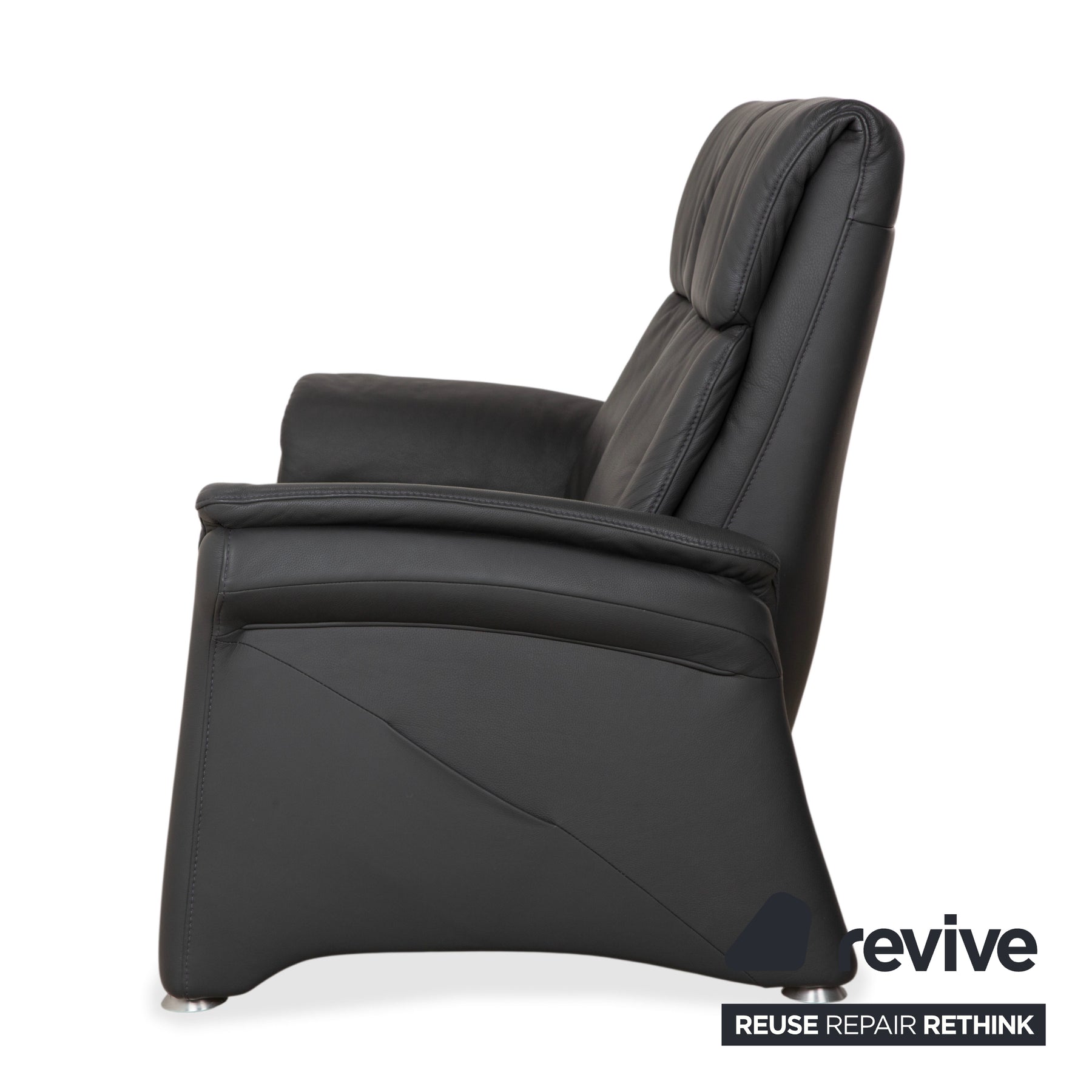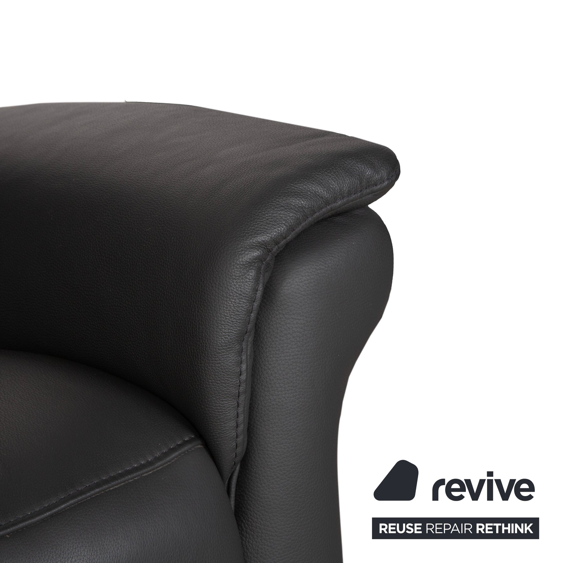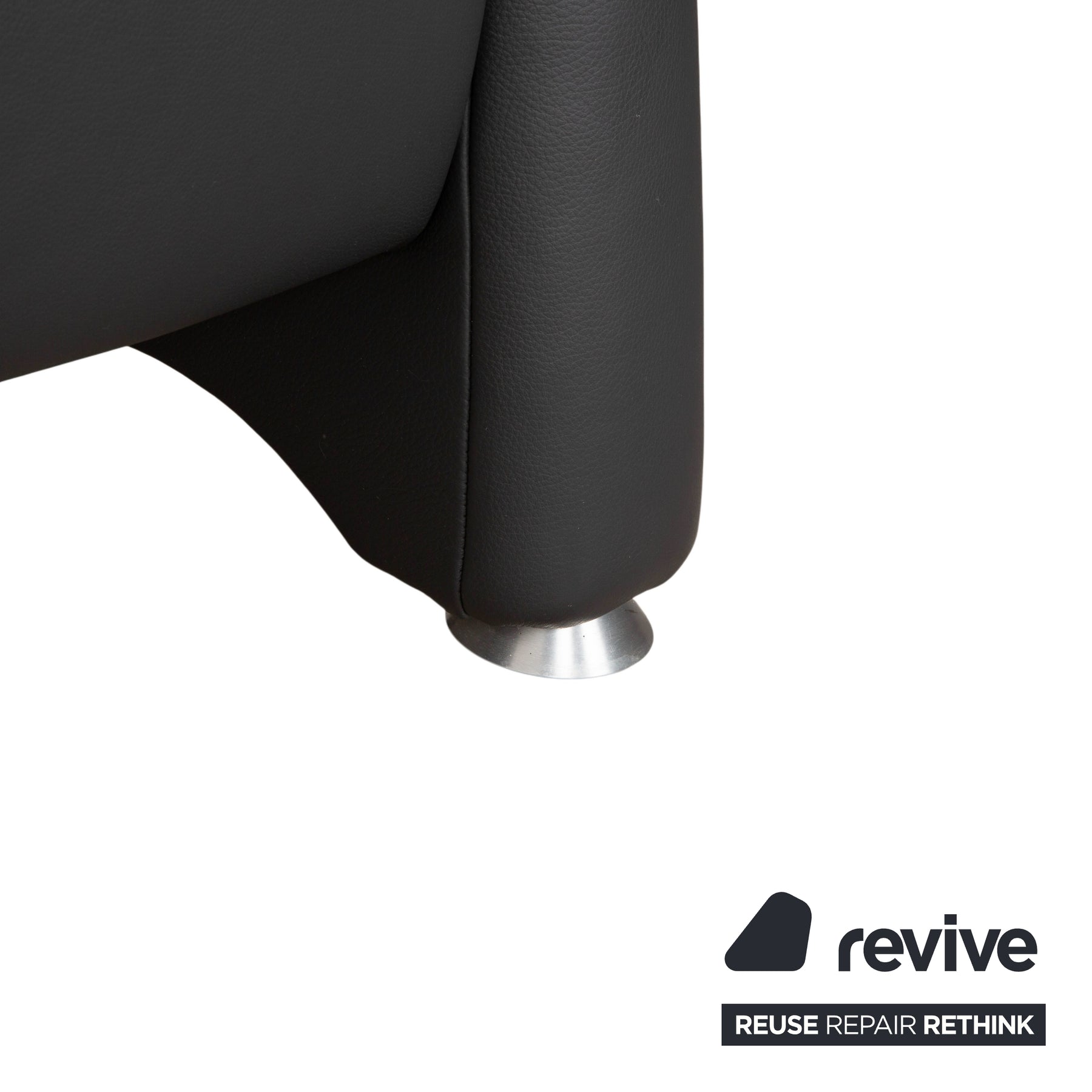 Der Bezug ist aus hochwertigem Leder in einem tiefen Anthrazit (Dunkelgrau) gefertigt. Dieser Farbton ist nicht nur zeitlos modern, sondern strahlt auch eine souveräne Ruhe aus. Besonders markant ist die hohe Rückenlehne, die im oberen Bereich als bequeme Nackenstütze ausgeformt ist. Die vertikale Steppung im Rücken gibt dem Polster Struktur und sorgt für optimalen Halt entlang der Wirbelsäule.