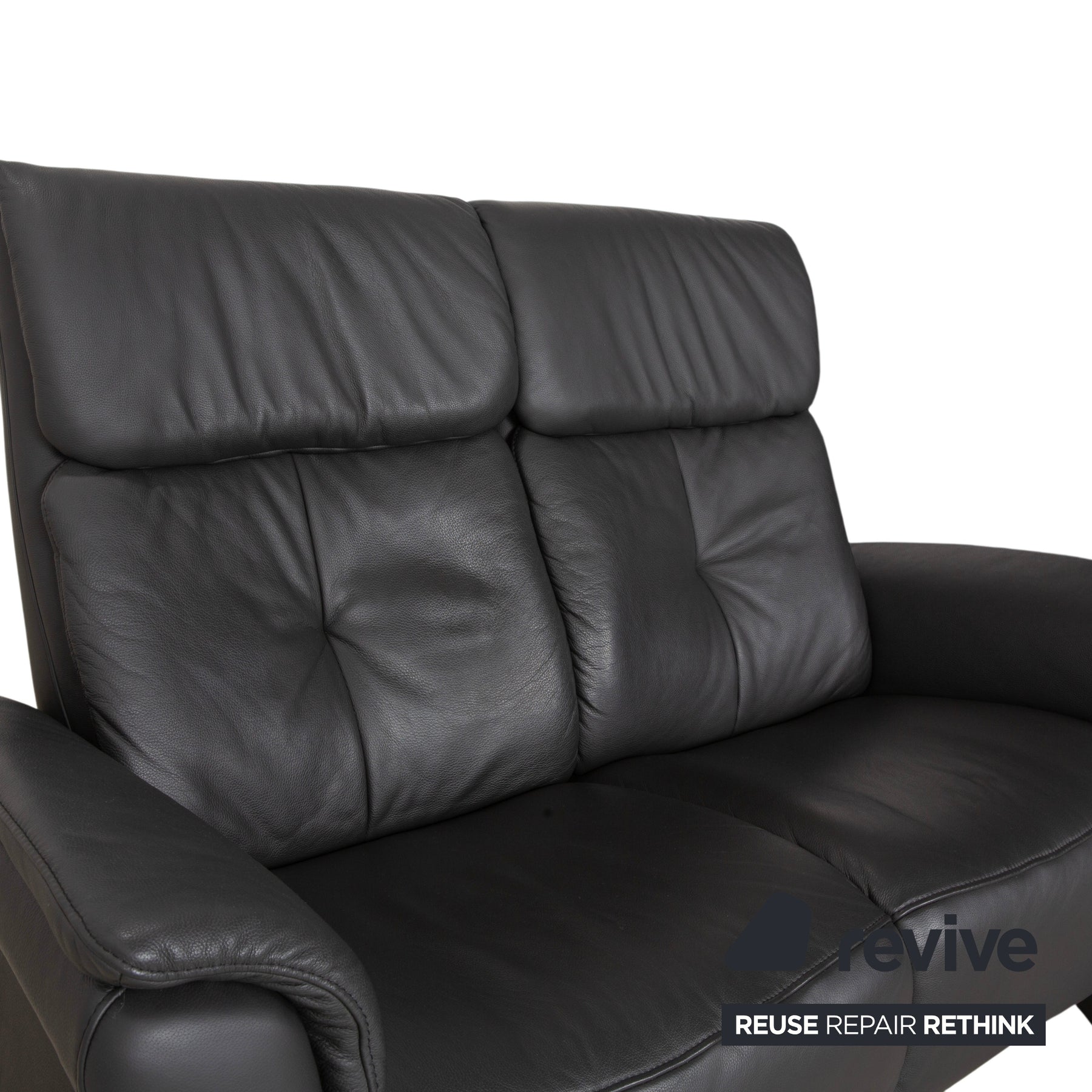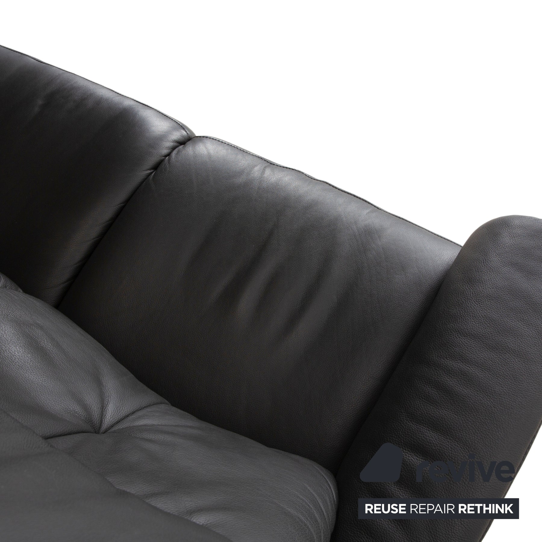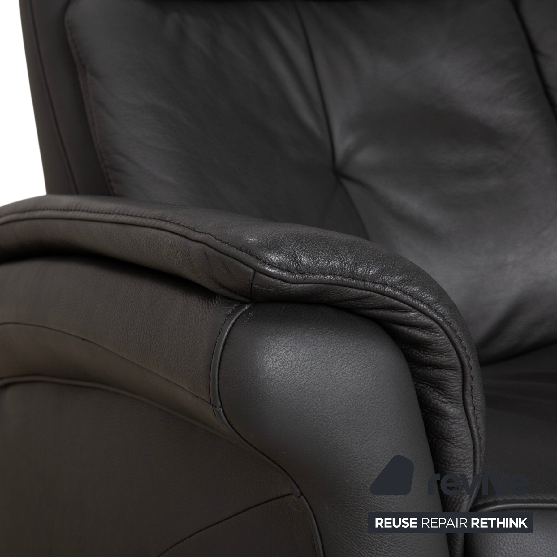 Der Bezug ist aus hochwertigem Leder in einem tiefen Anthrazit (Dunkelgrau) gefertigt. Dieser Farbton ist nicht nur zeitlos modern, sondern strahlt auch eine souveräne Ruhe aus. Besonders markant ist die hohe Rückenlehne, die im oberen Bereich als bequeme Nackenstütze ausgeformt ist. Die vertikale Steppung im Rücken gibt dem Polster Struktur und sorgt für optimalen Halt entlang der Wirbelsäule.