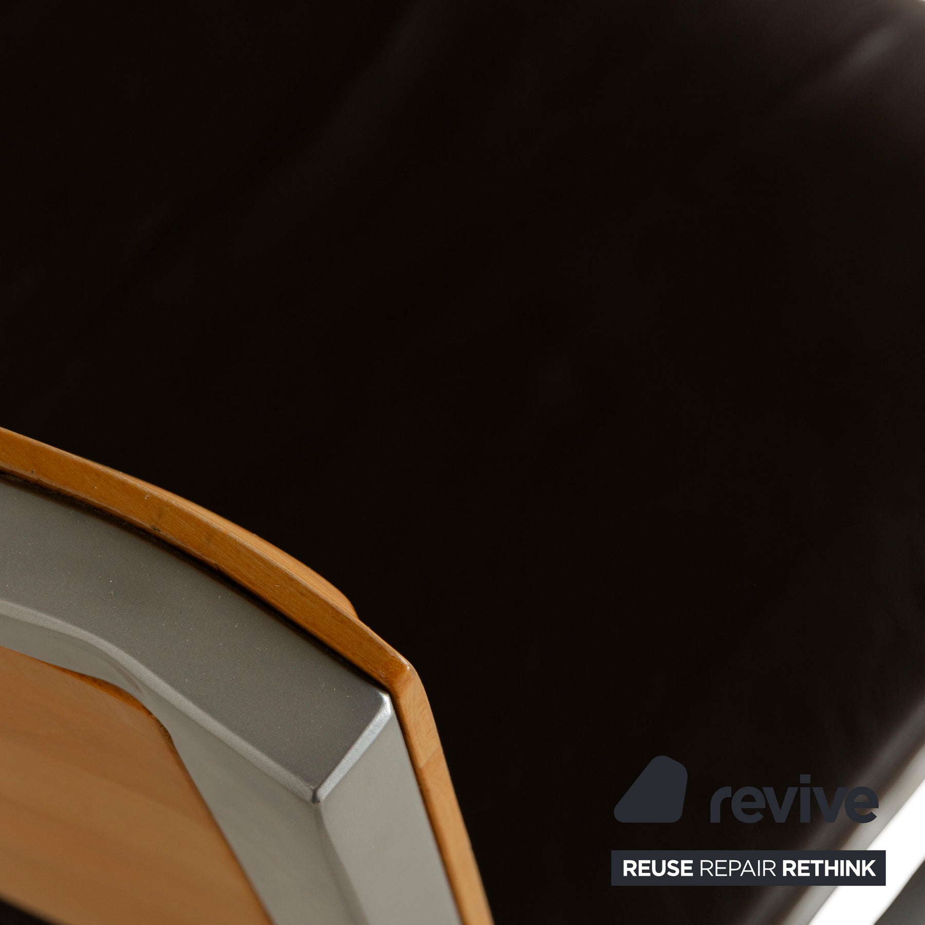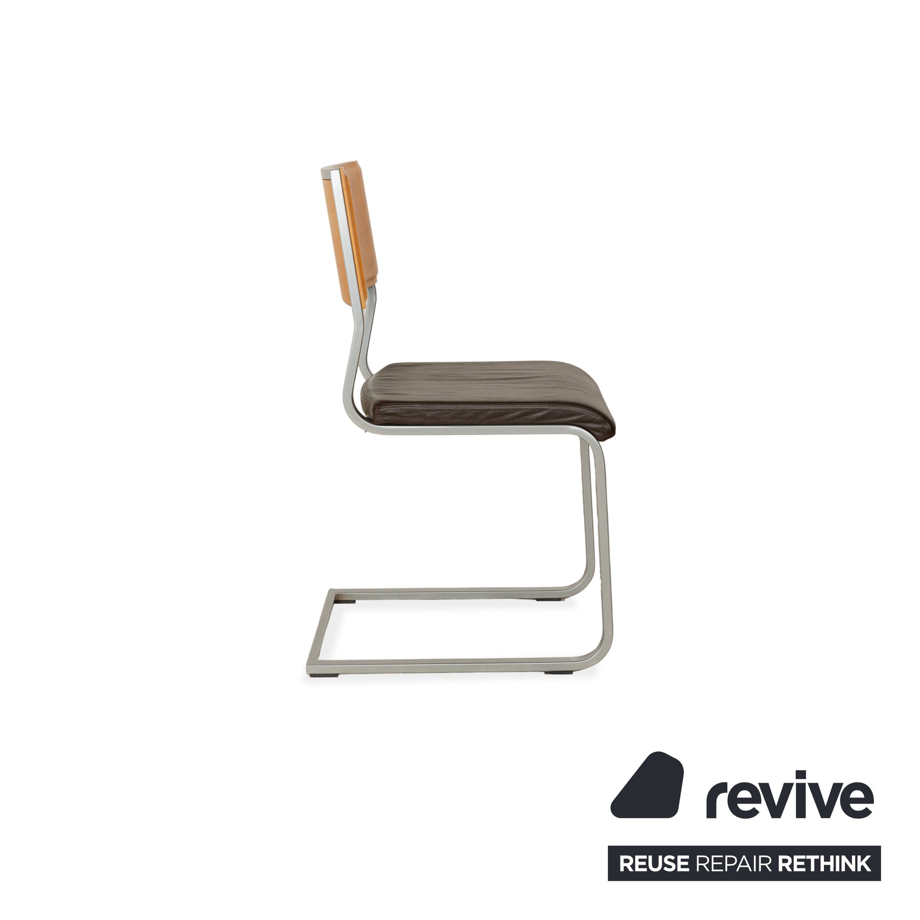 The Wöstmann chair set is upholstered in brown genuine leather and sits on a narrow metal frame. The backrests are made of light wood. The set consists of six chairs.