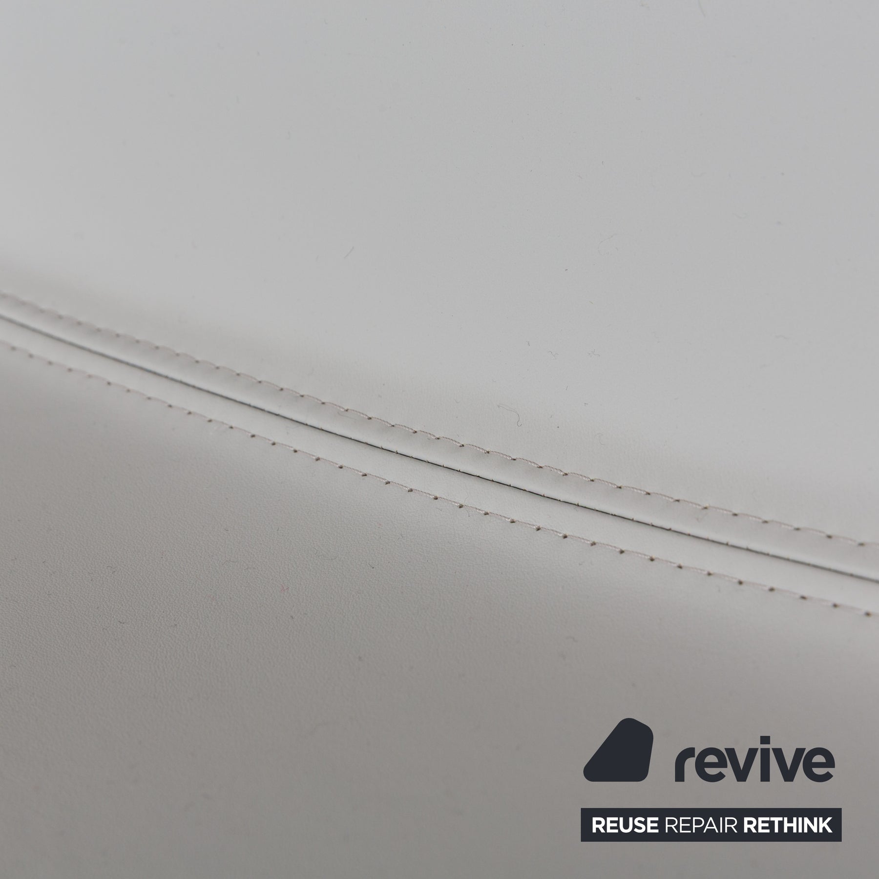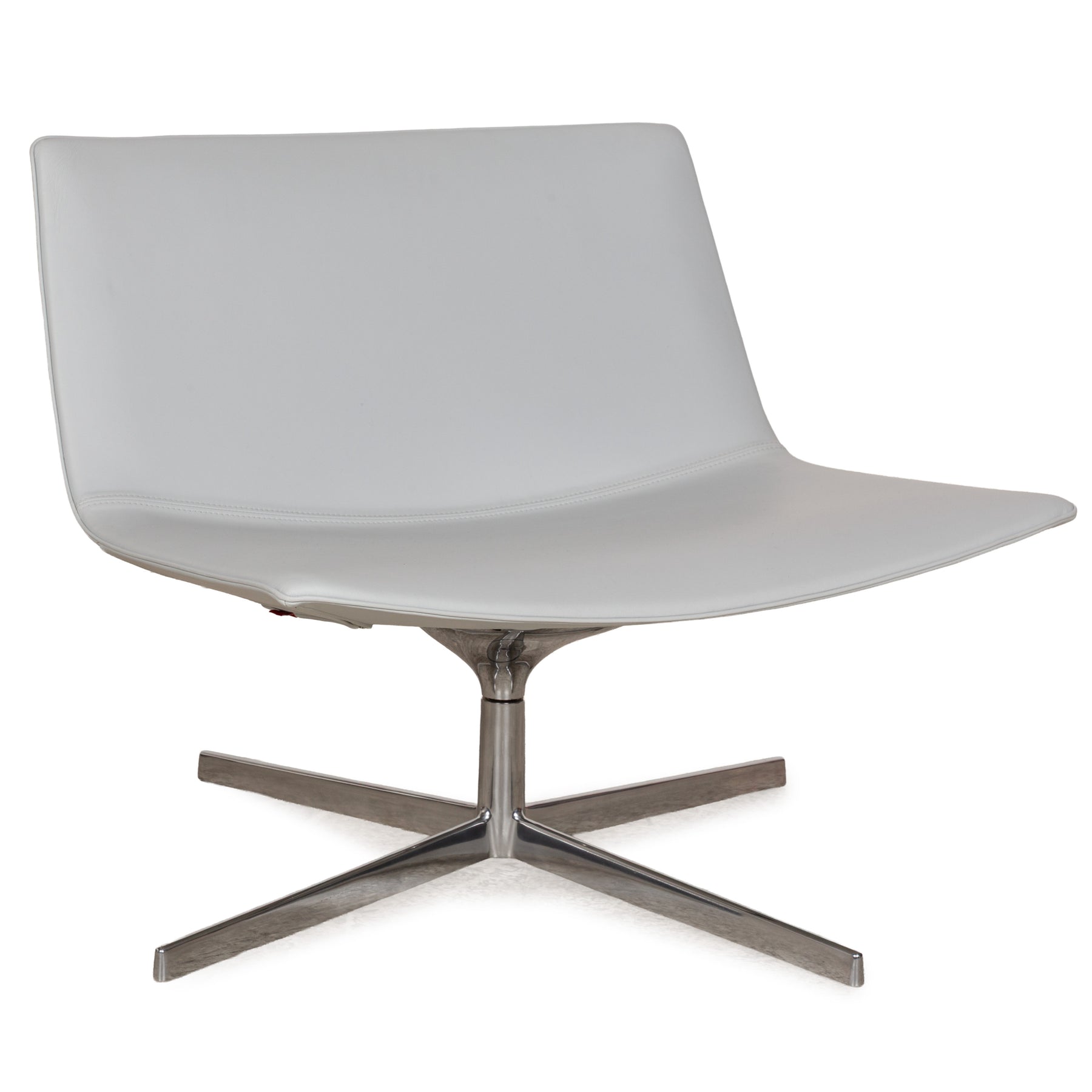 The Catifa 80 armchair by Arper is a symbol of simple, successful design. The chair's body, upholstered in light gray-blue leather, is mounted on a metal swivel base and dispenses with any frills or extras, allowing the clean edges and minimal curves of the design to shine.