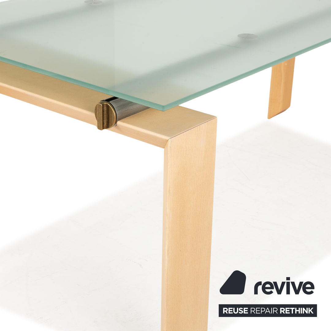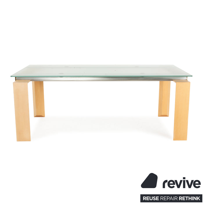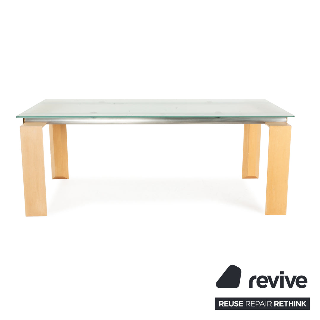 The Stilt dining table from DESALTO consists of a glass top and stands on a wooden frame. It is characterized by its classic design and simple appearance.