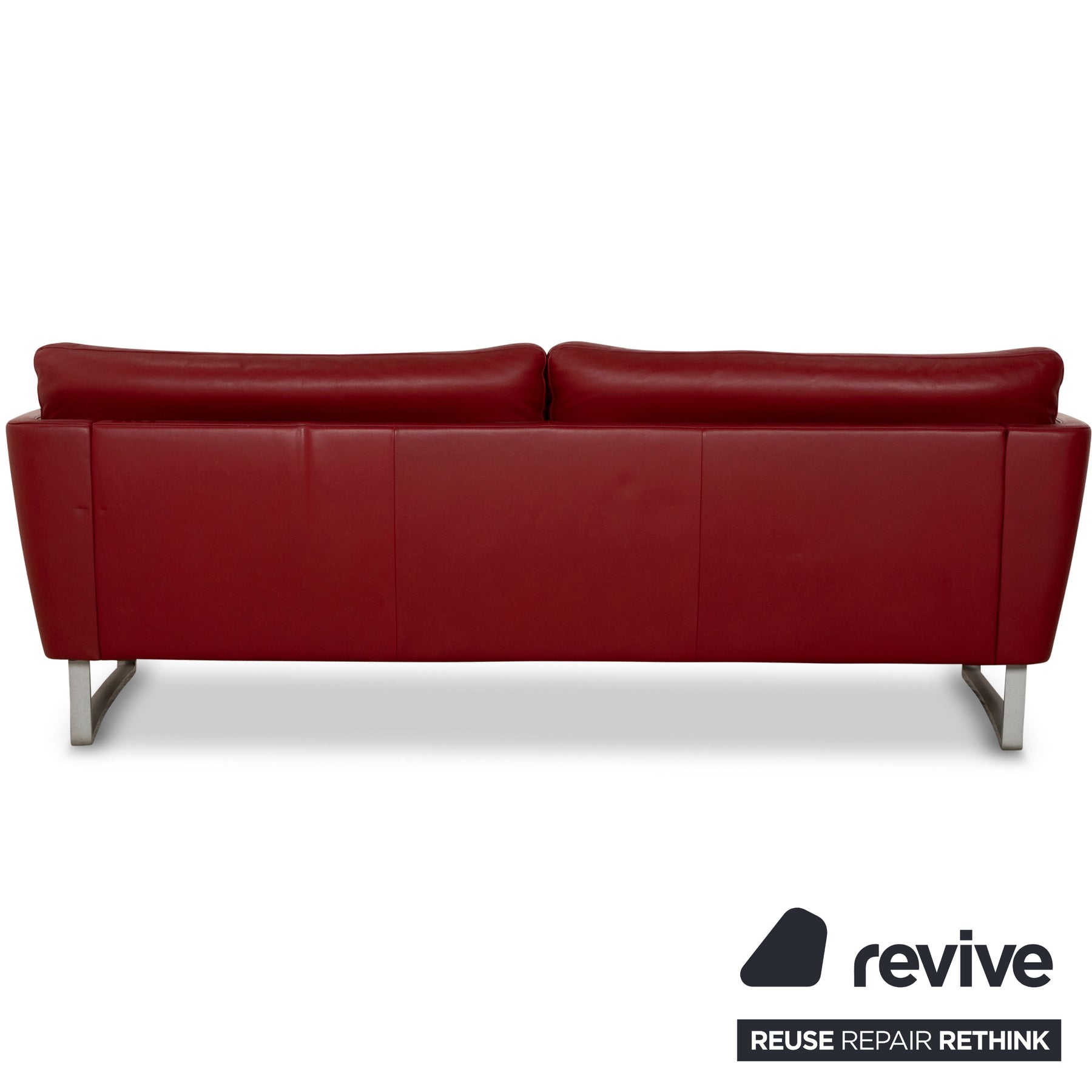 The three-seater Vida by Rolf Benz is covered in dark red genuine leather and stands on metal runners. The simple but pointedly modern design characterizes this sofa.