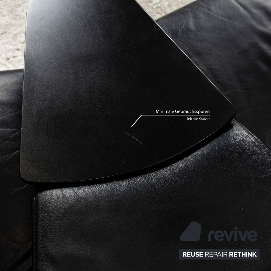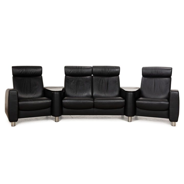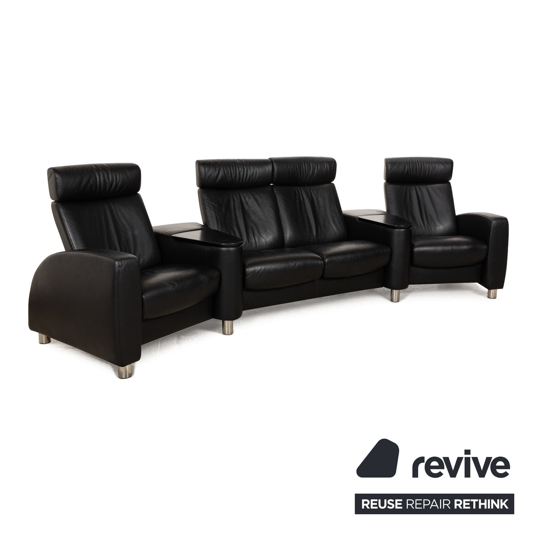 The four-seater Arion from Stressless is covered in black leather and stands on round metal feet. It is characterized by the comfortable relaxation function and the adjustable wooden shelves with integrated storage space. Adjustable headrests ensure increased comfort.