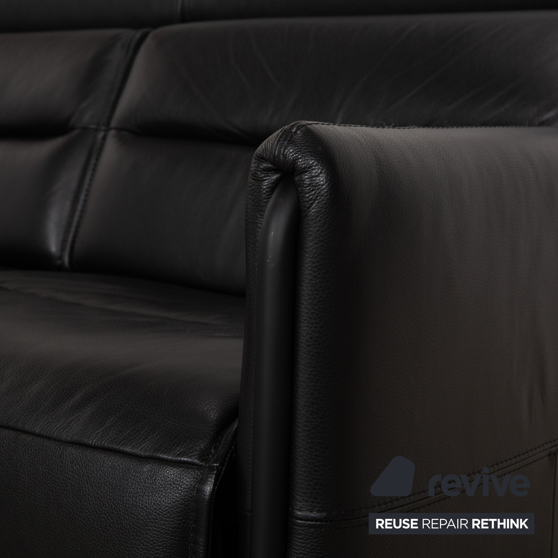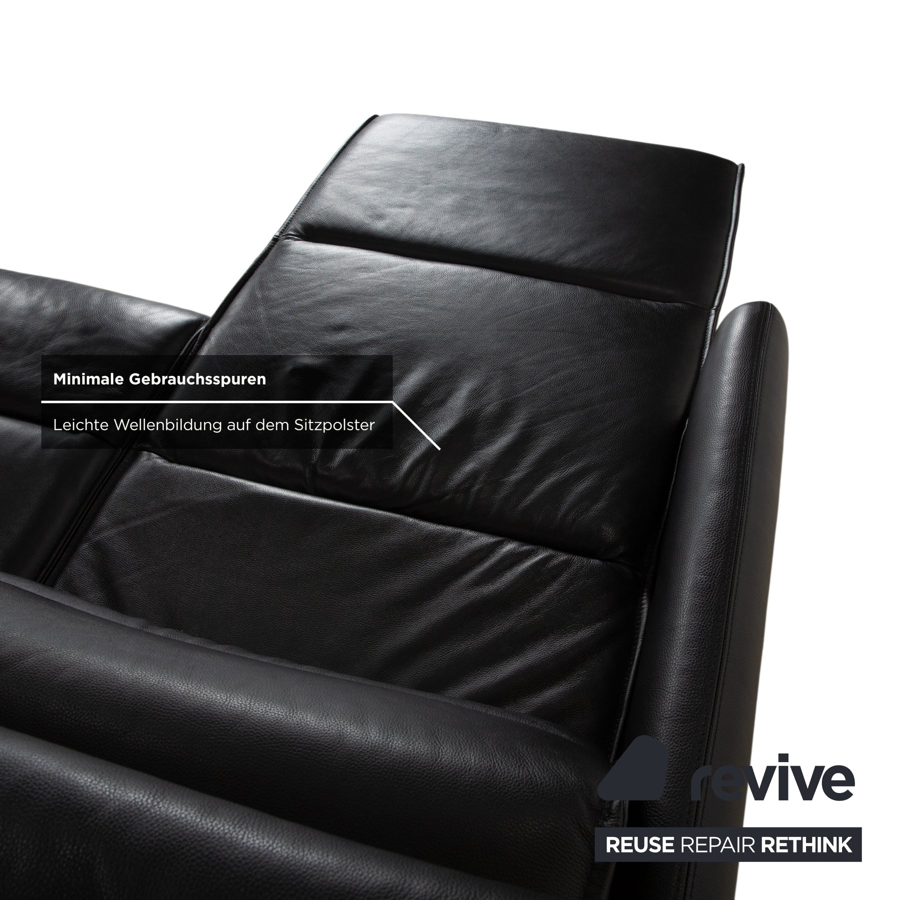Der schwarze Lederbezug wirkt edel, zeitlos und hochwertig. Das fein verarbeitete Leder fühlt sich angenehm weich an, ist langlebig und unterstreicht den exklusiven Charakter des Sofas. Großzügige Sitzflächen und ergonomisch geformte Rückenlehnen sorgen für ein entspanntes Sitzgefühl auf höchstem Niveau.