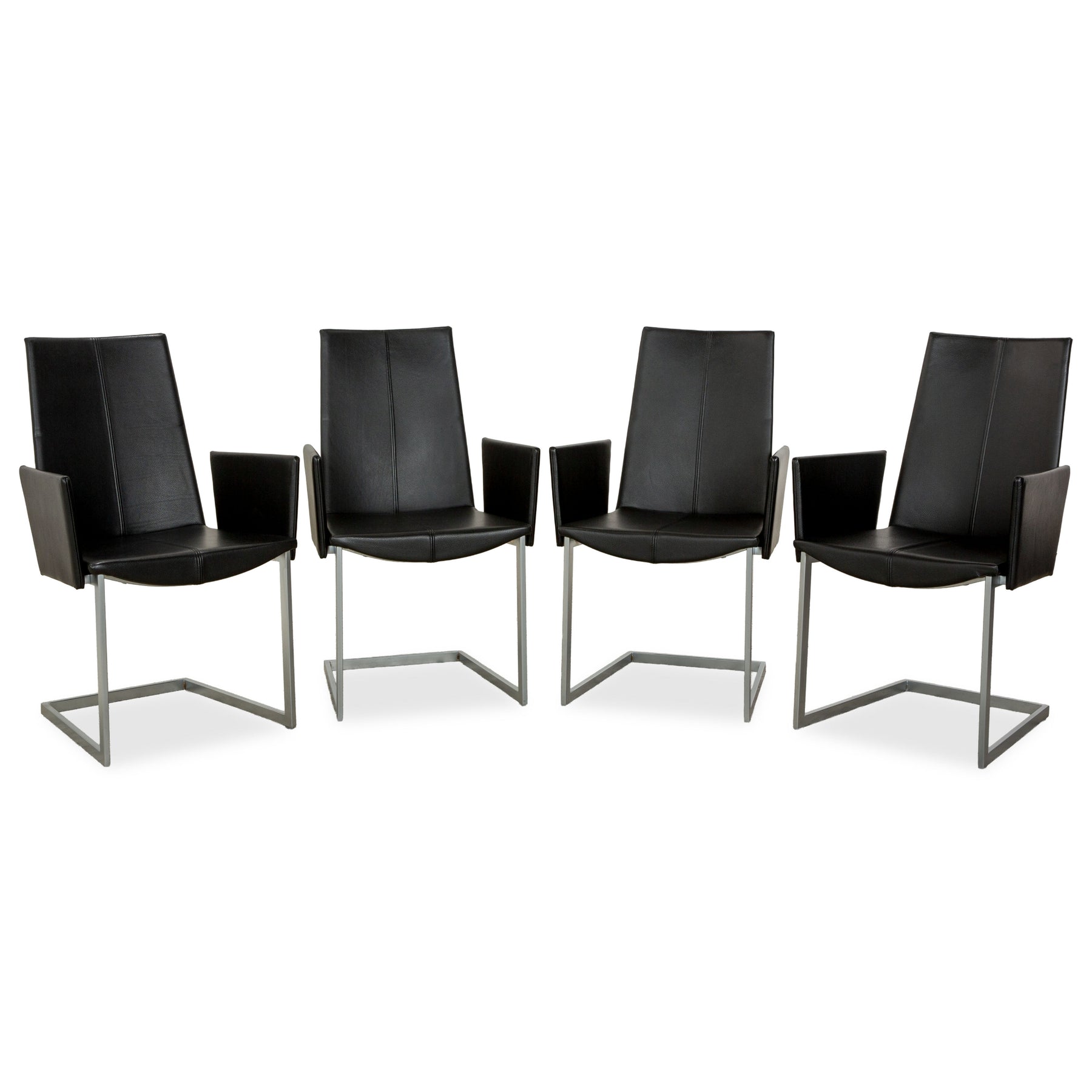 This set of four identical chairs from KFF is an elegant addition to any modern living or dining room. The cantilevered chairs are upholstered in black genuine leather and are characterized by their minimalist, streamlined design.