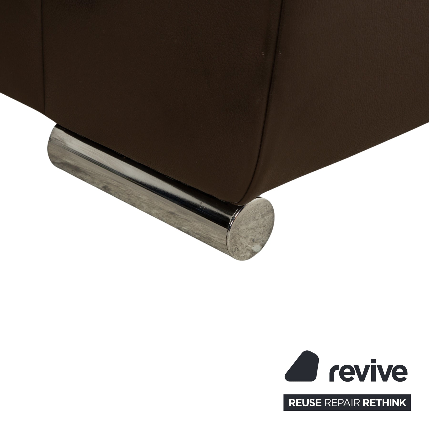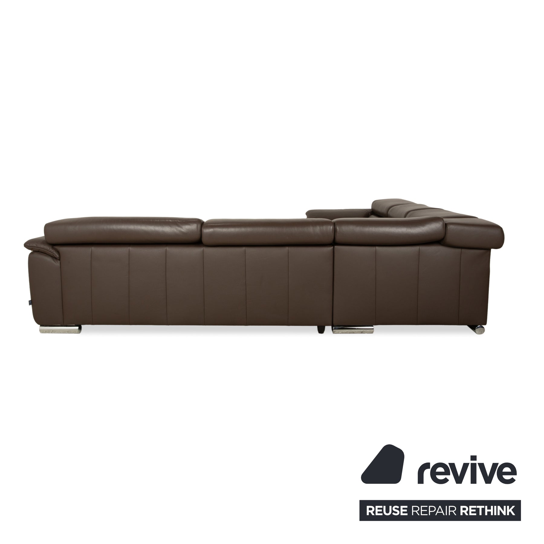 The Brand Blues sofa by Ewald Schillig is upholstered in dark brown leather and stands on tubular chrome legs. It features wide armrests, deep seats, and adjustable headrests. This sofa stylishly combines superior comfort with superior quality.